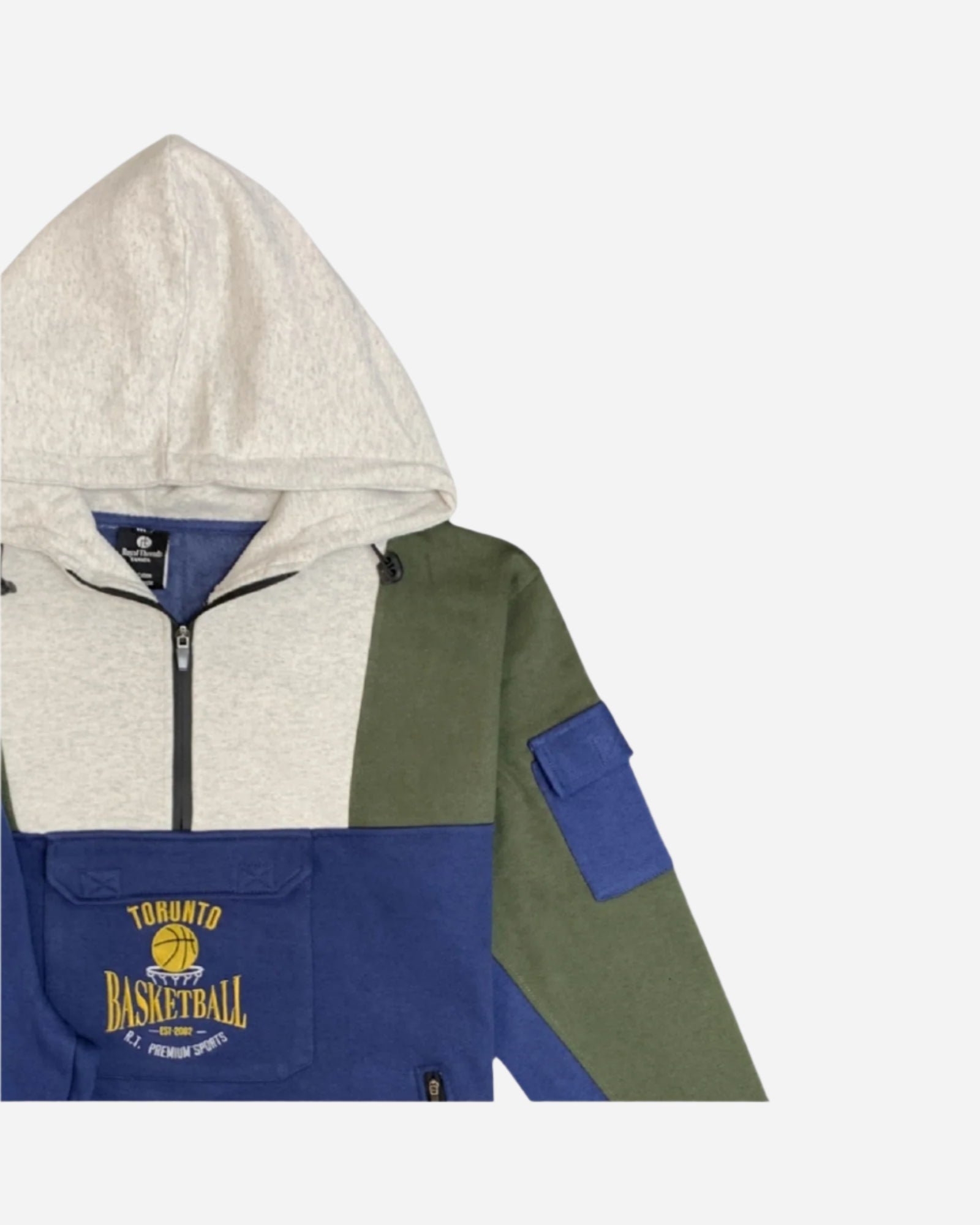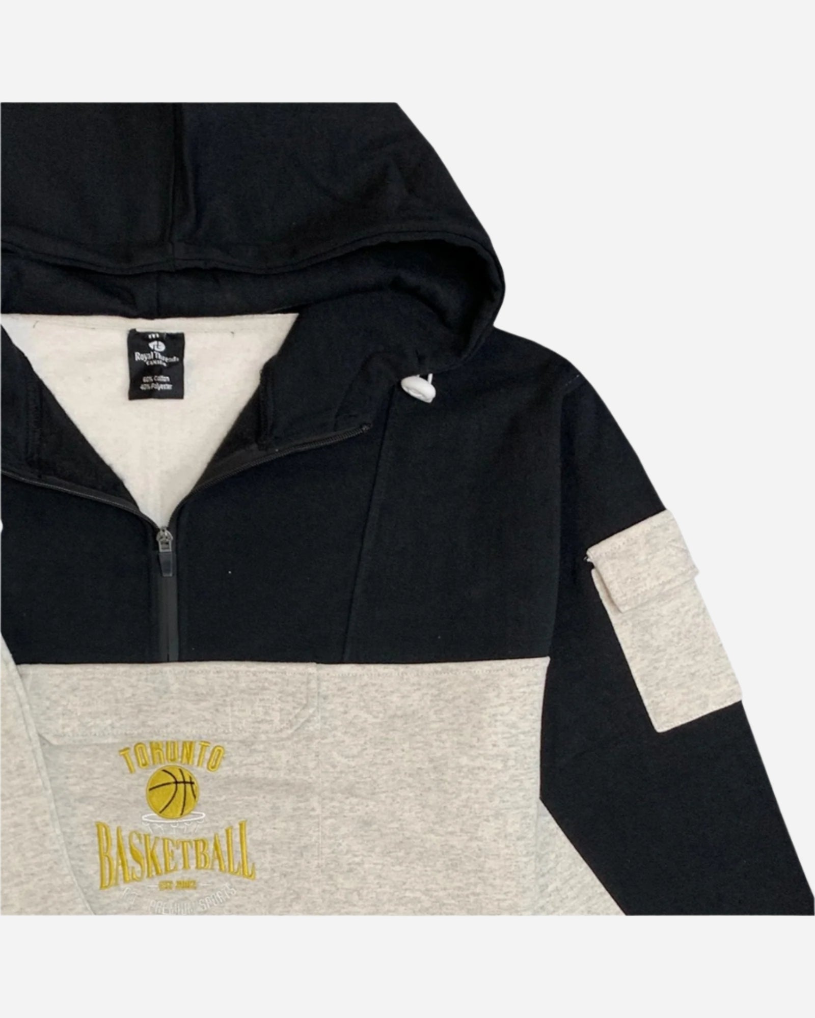 - Quarter-zip fleece hoodie with multiple pockets and adjustable toggles.