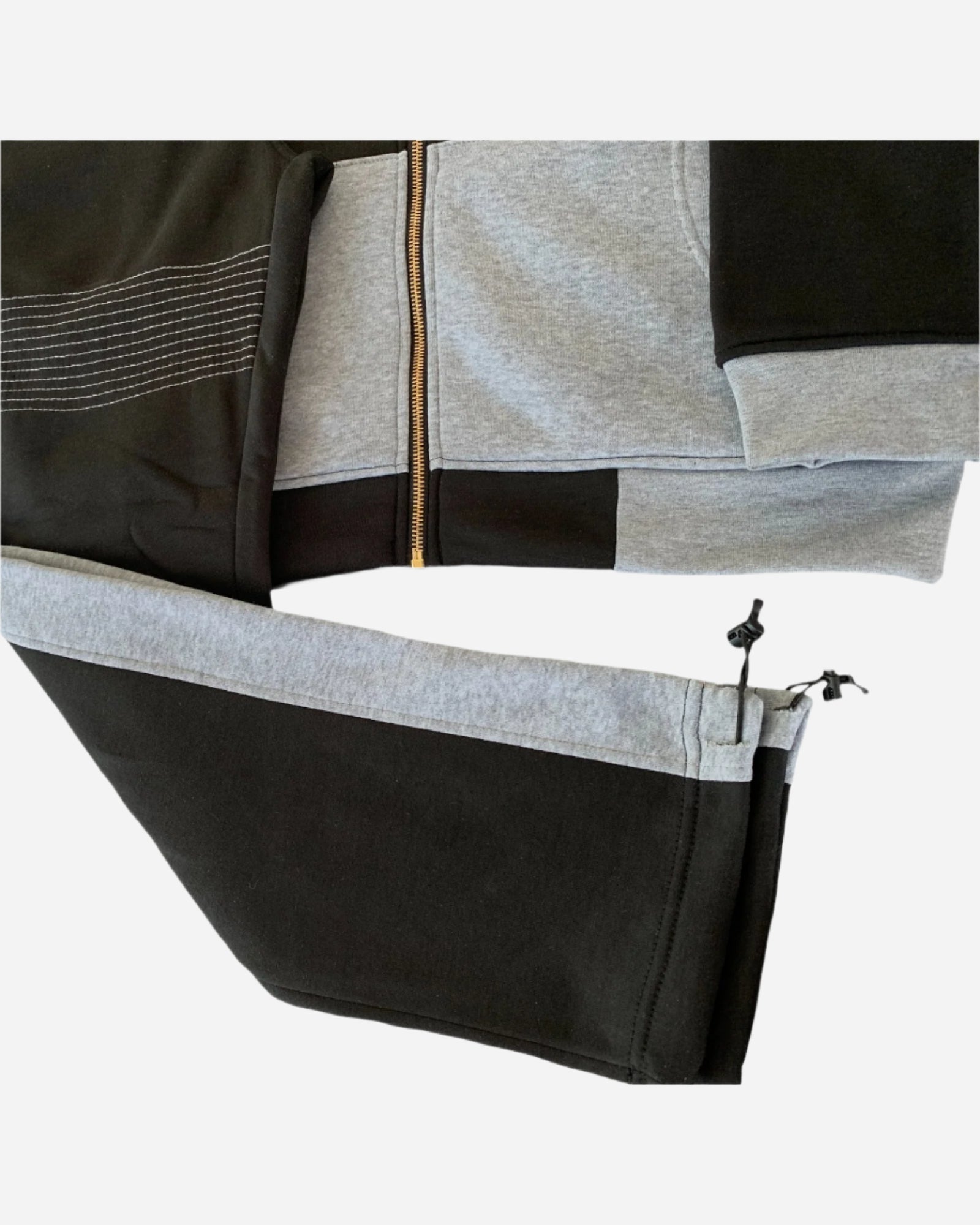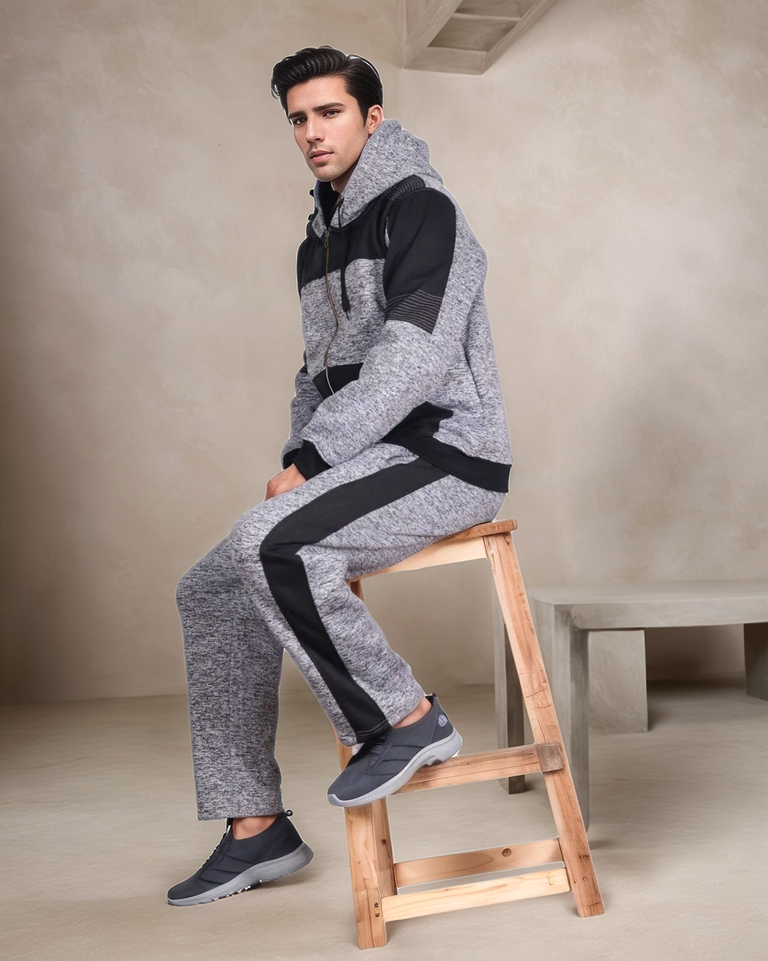 - Cozy fleece hoodie + straight-cut joggers with toggles for a modern edge.
