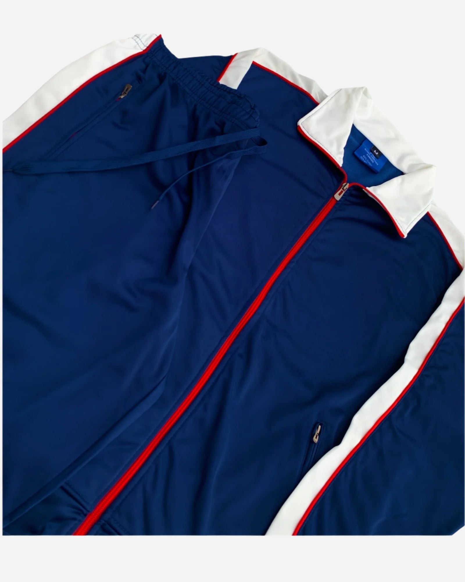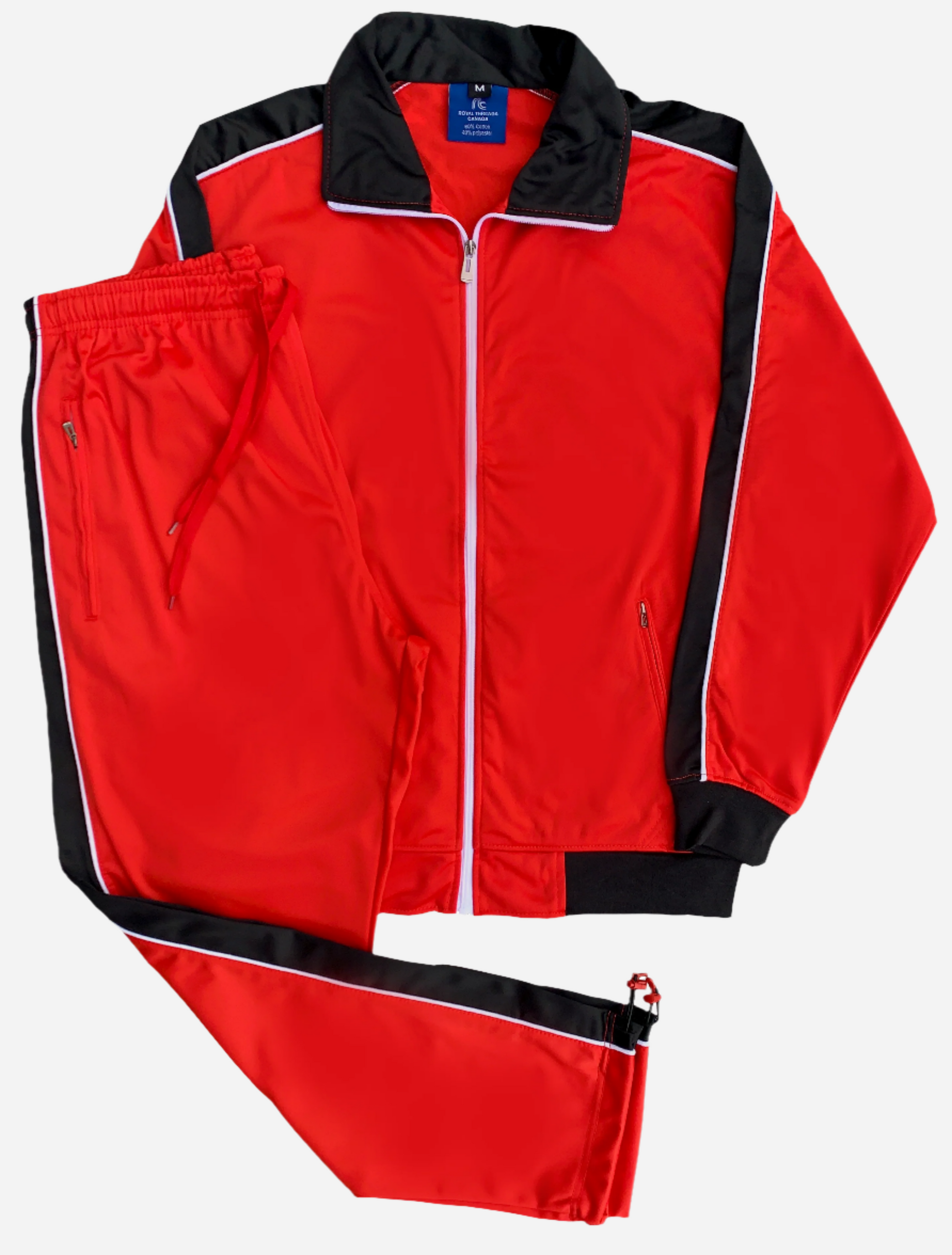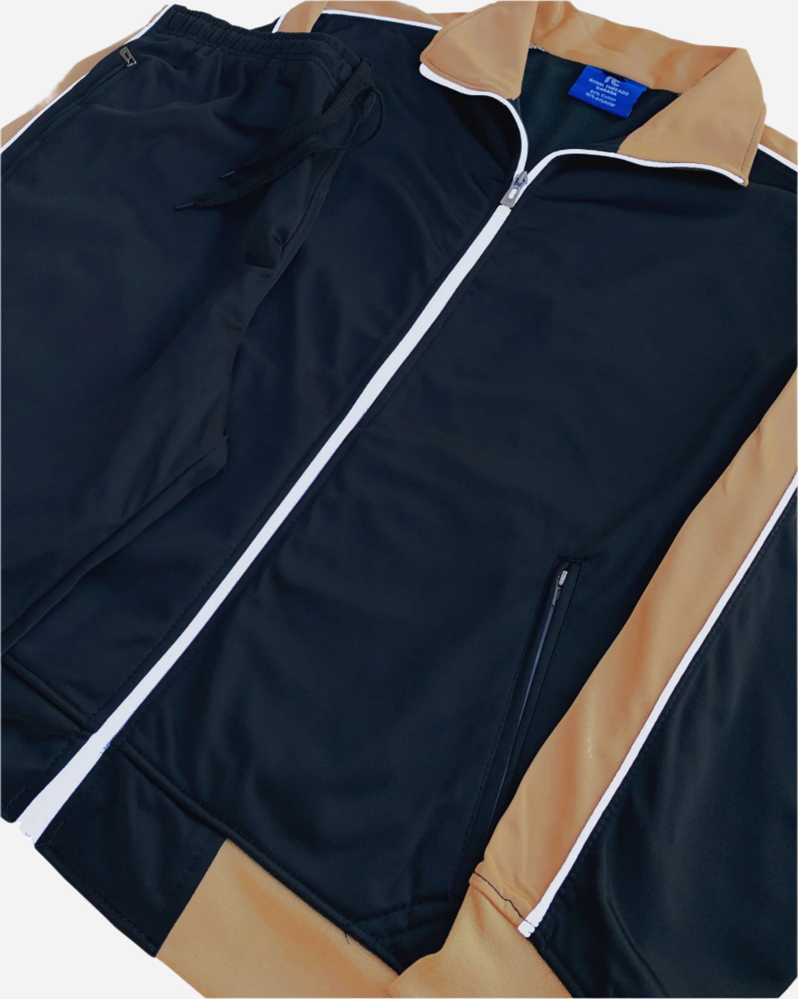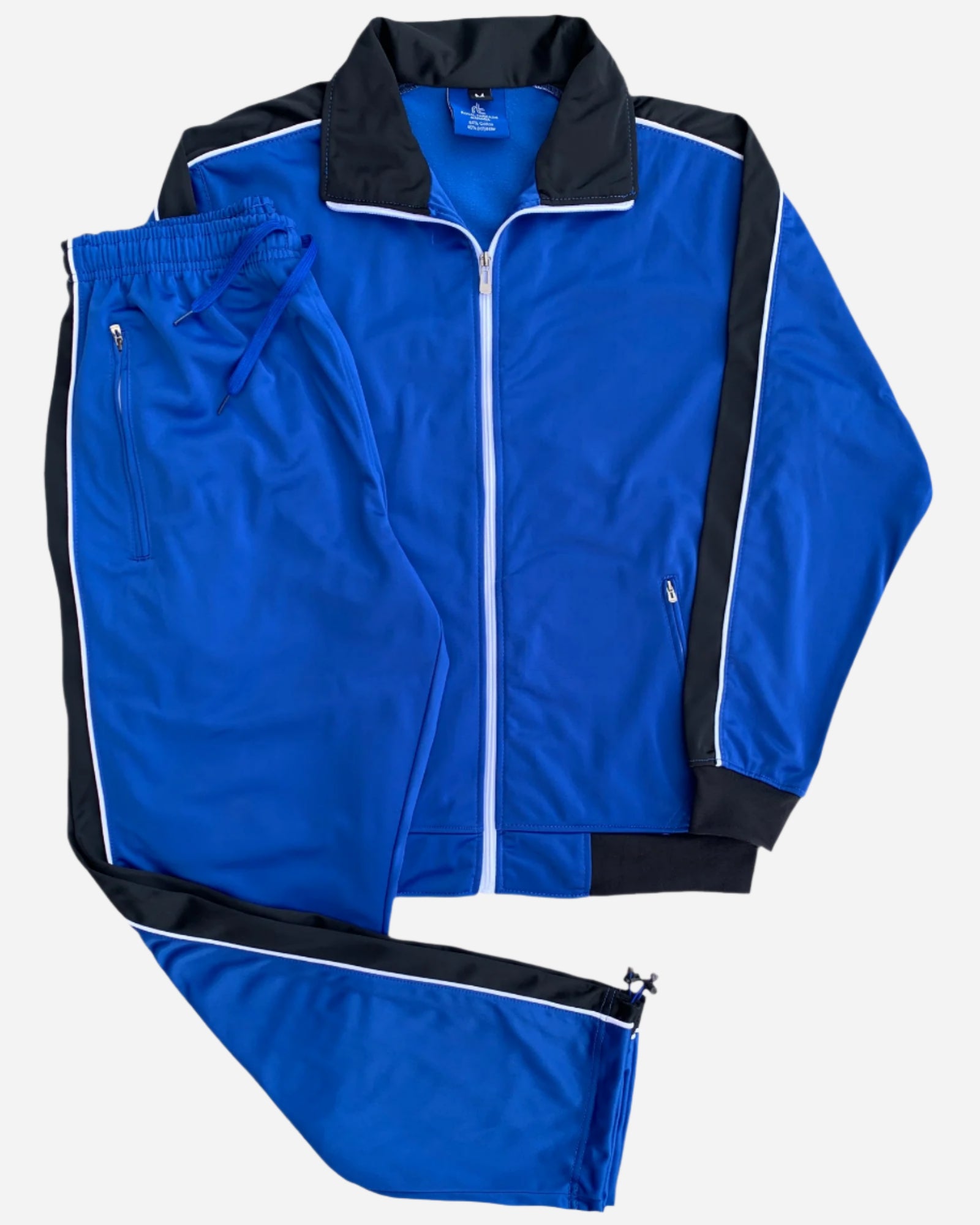 - 250 GSM Track Material. Jacket & pants with 2 zippered side pockets.
