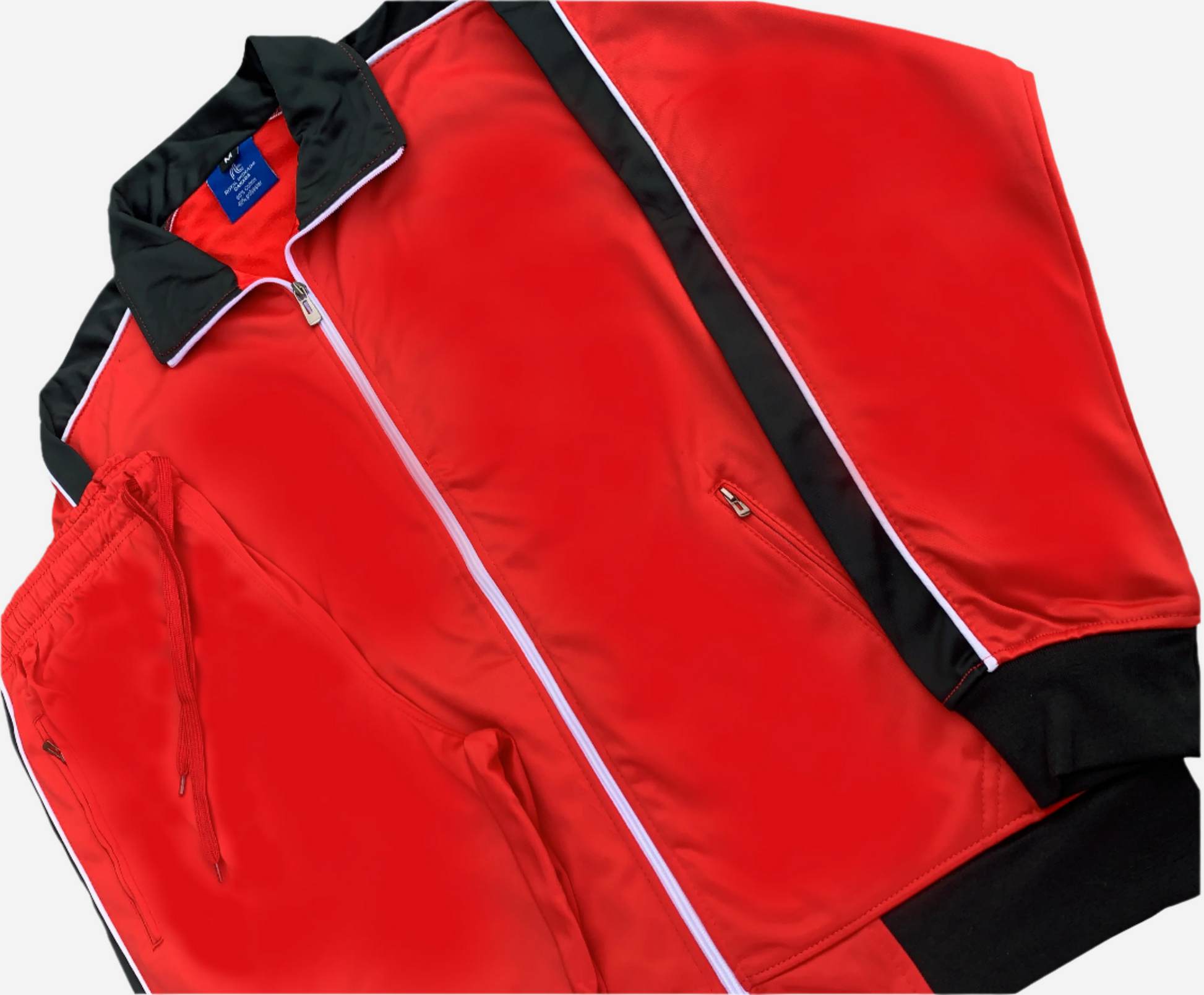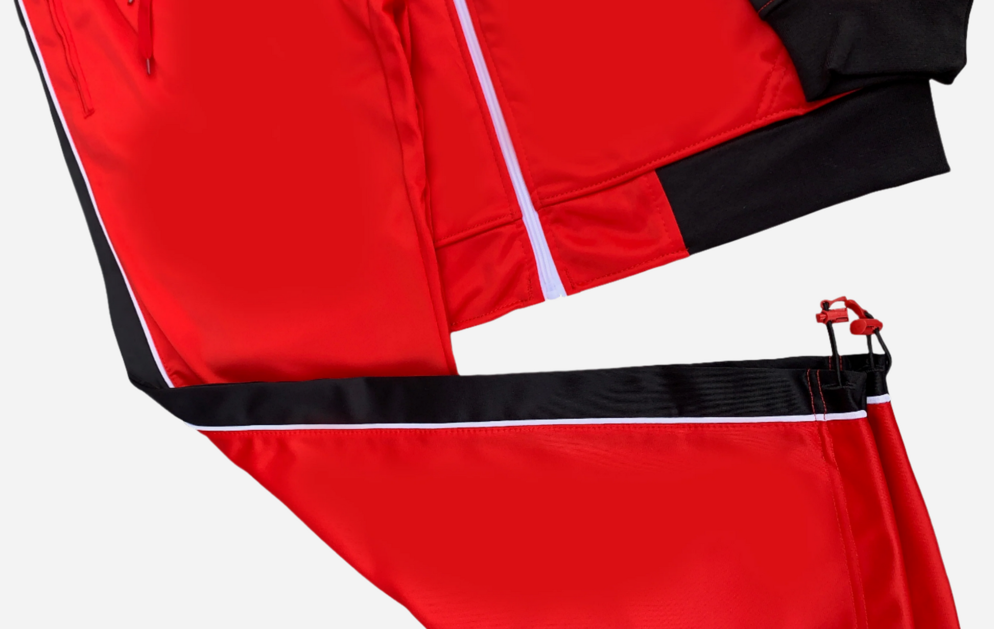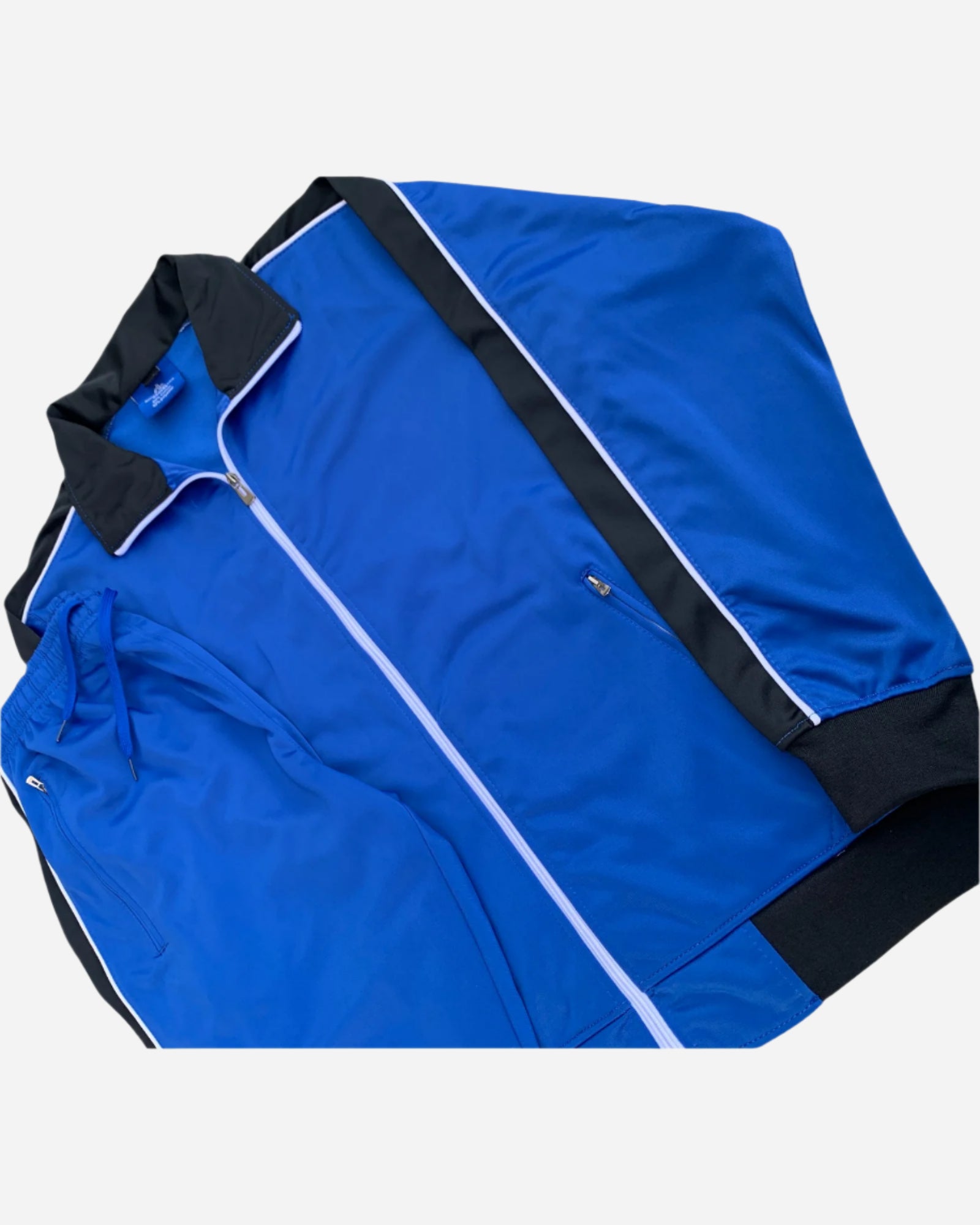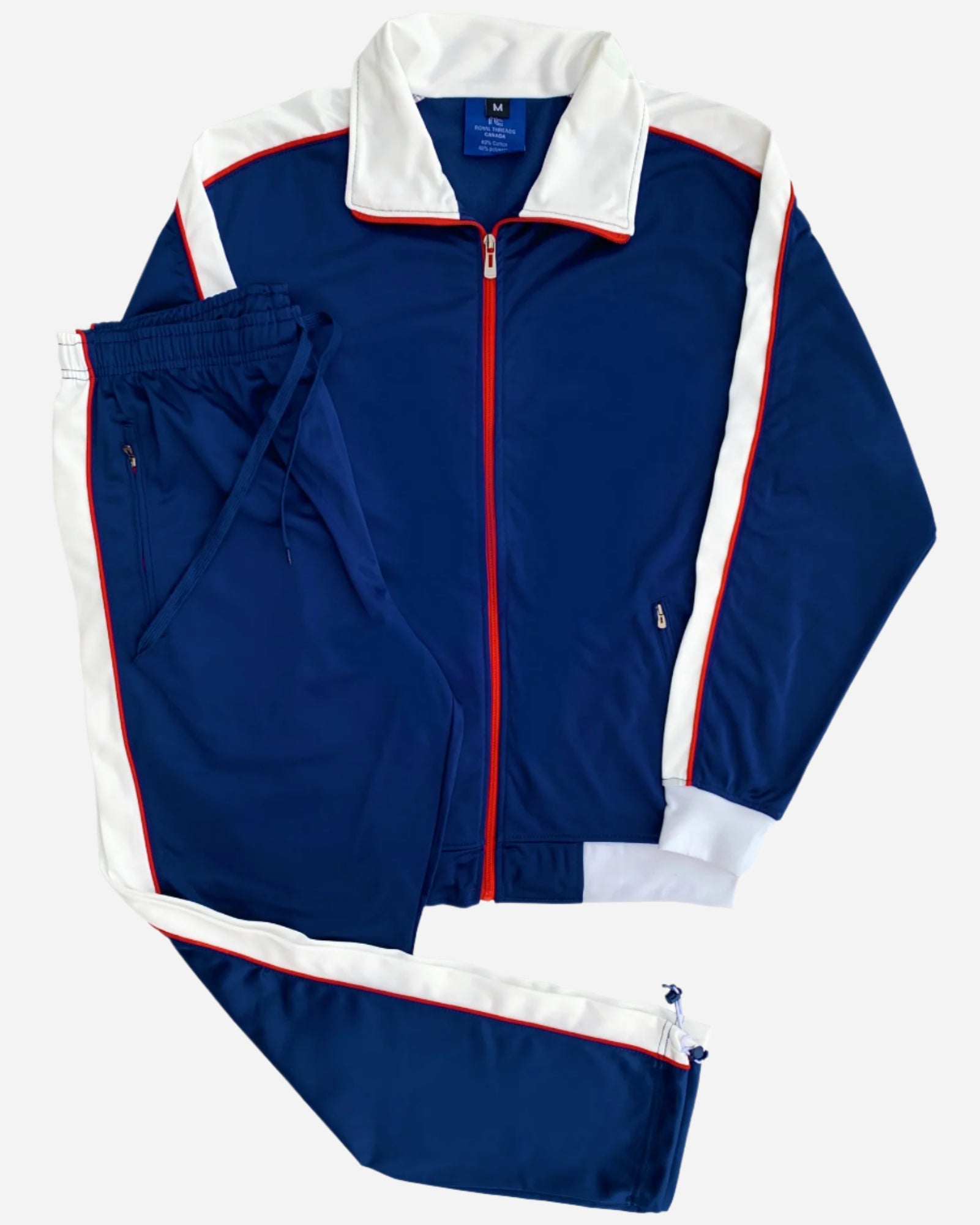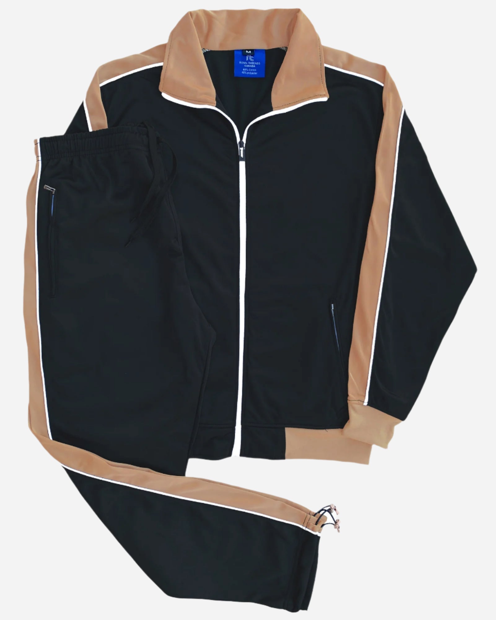 - 250 GSM Track Material. Jacket & pants with 2 zippered side pockets.
