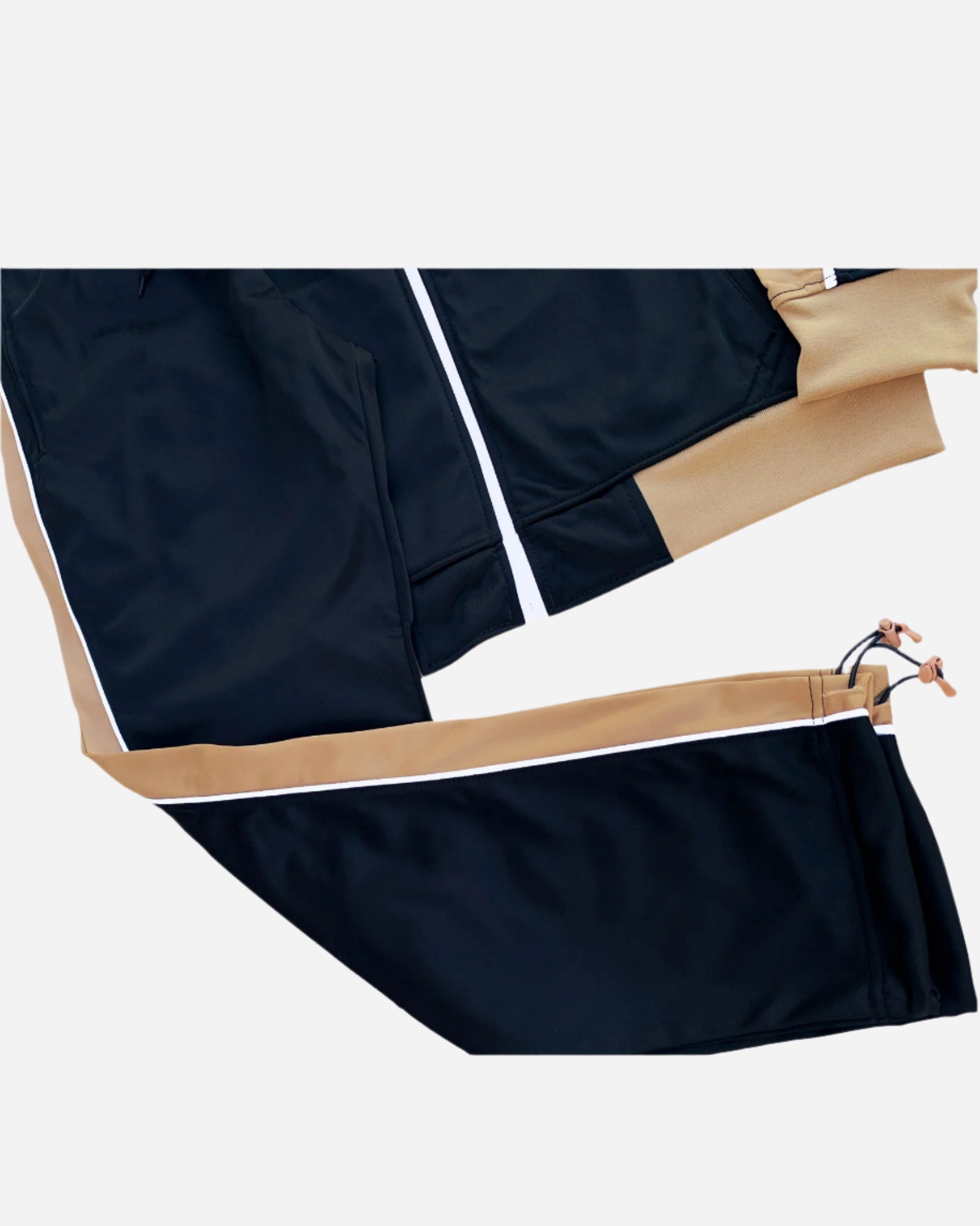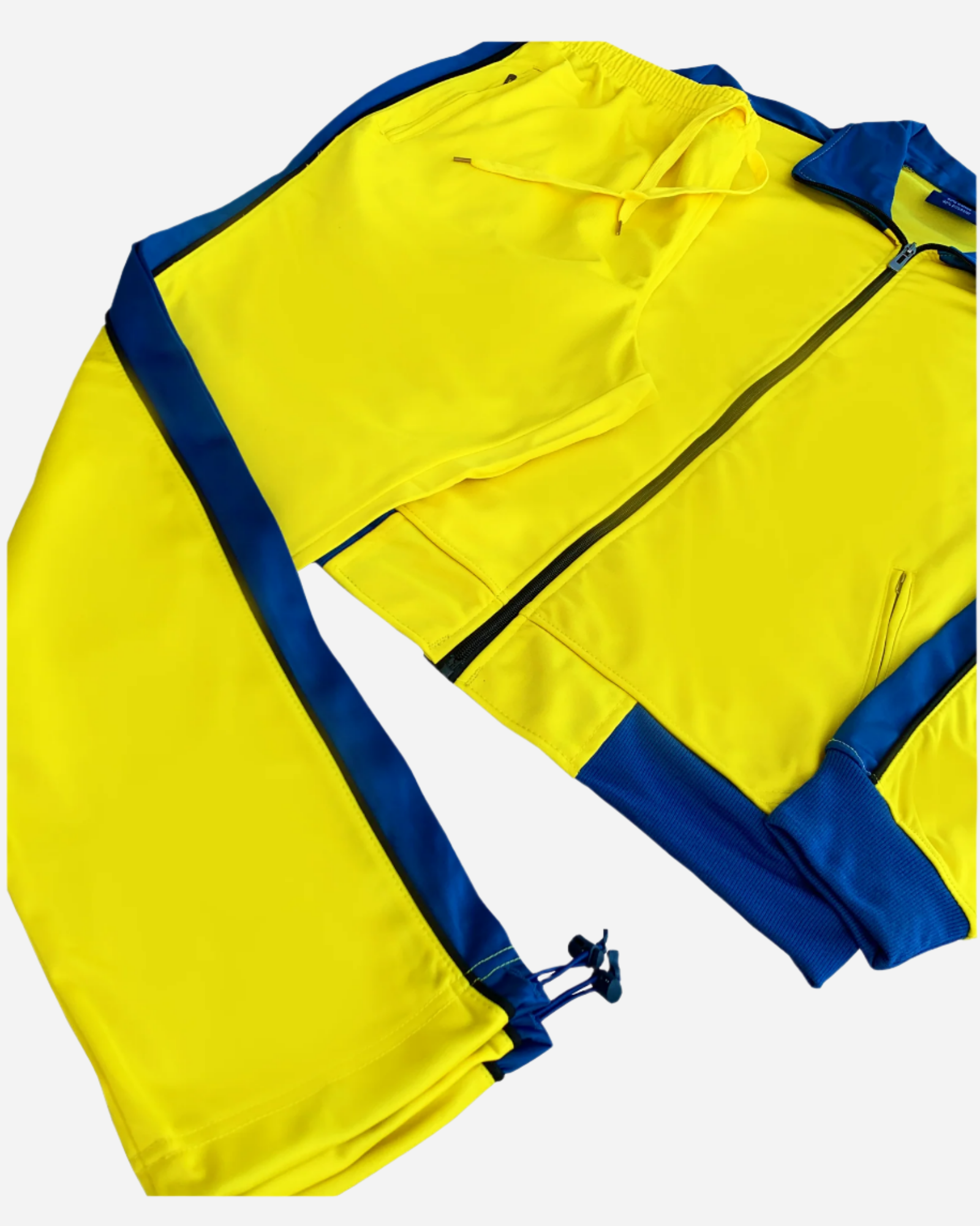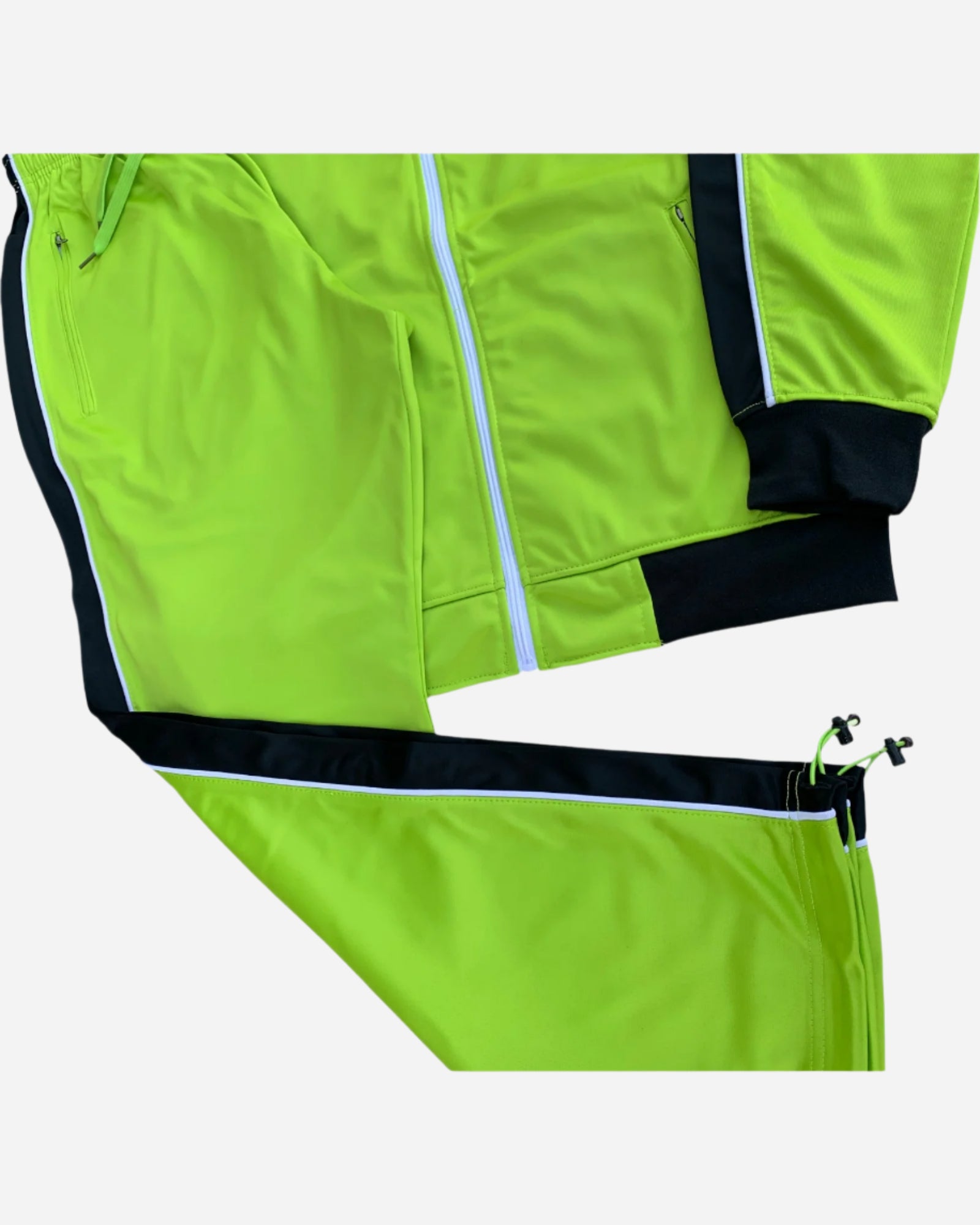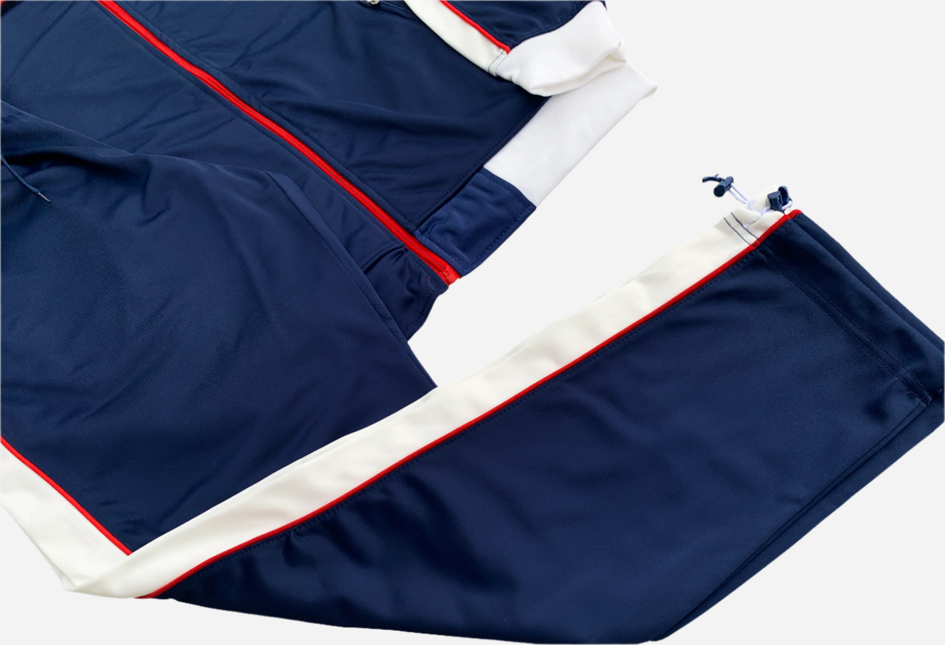 - 250 GSM Track Material. Jacket & pants with 2 zippered side pockets.