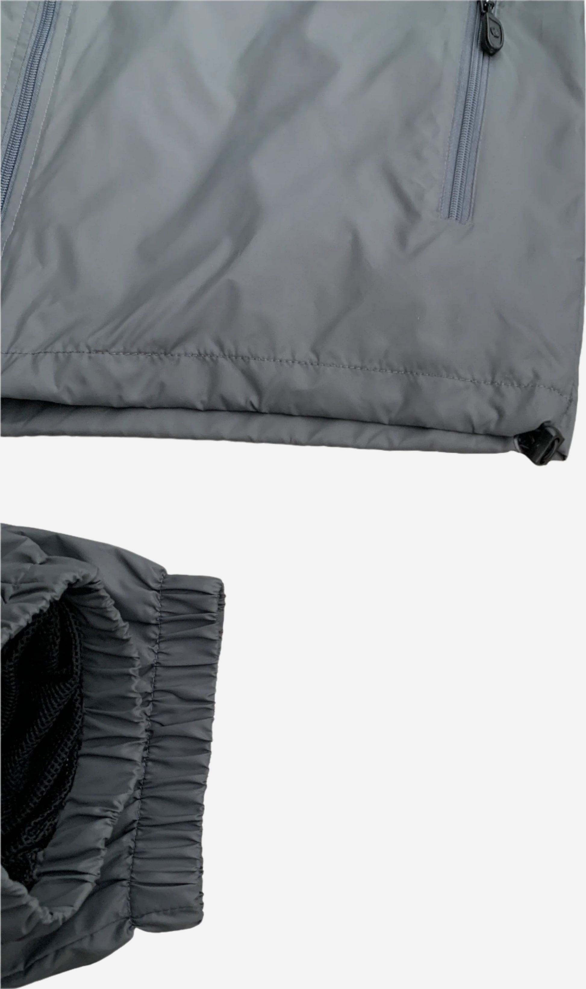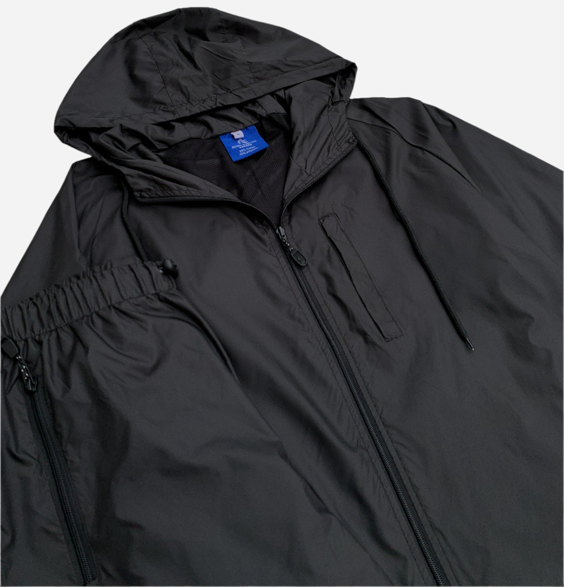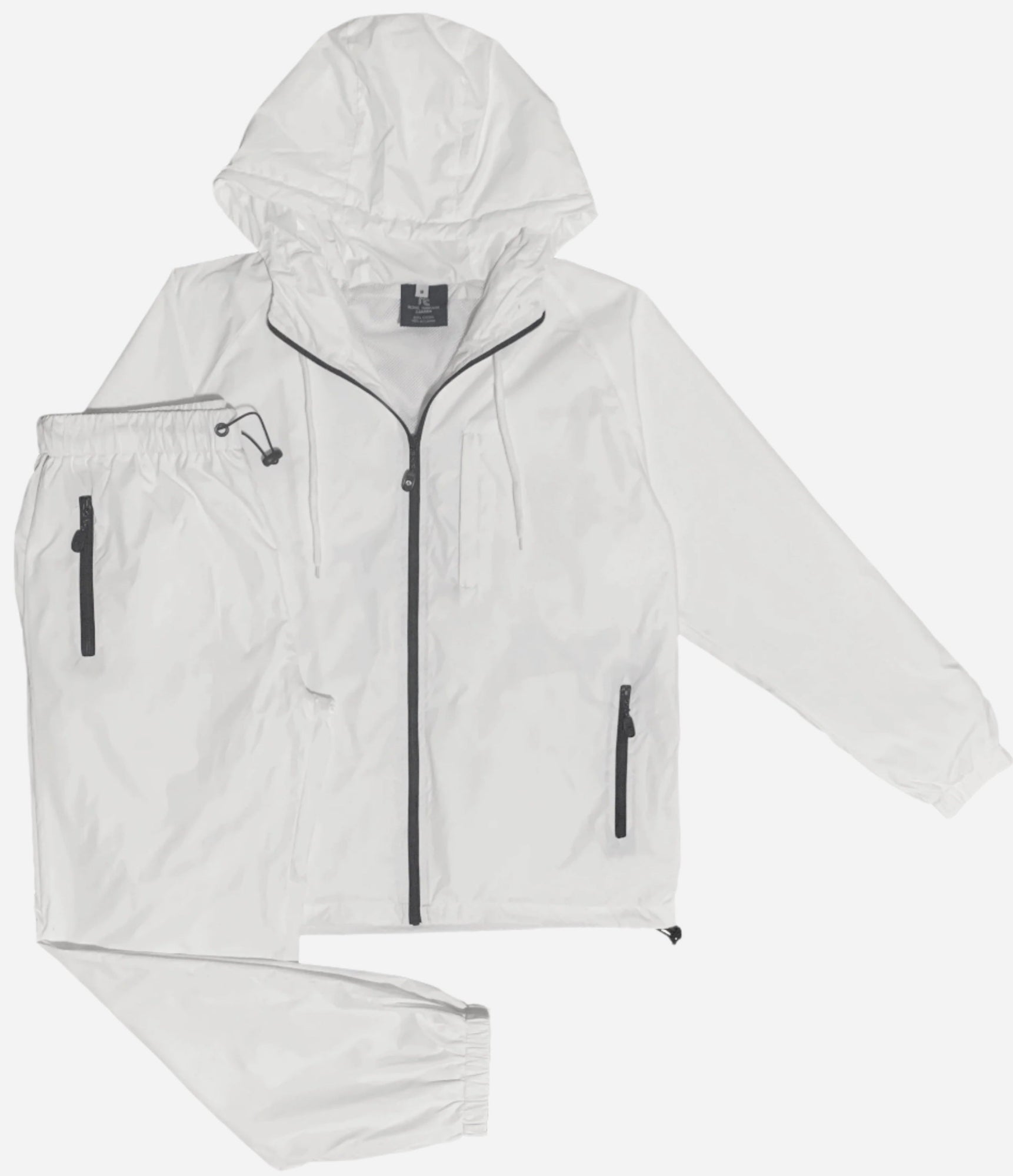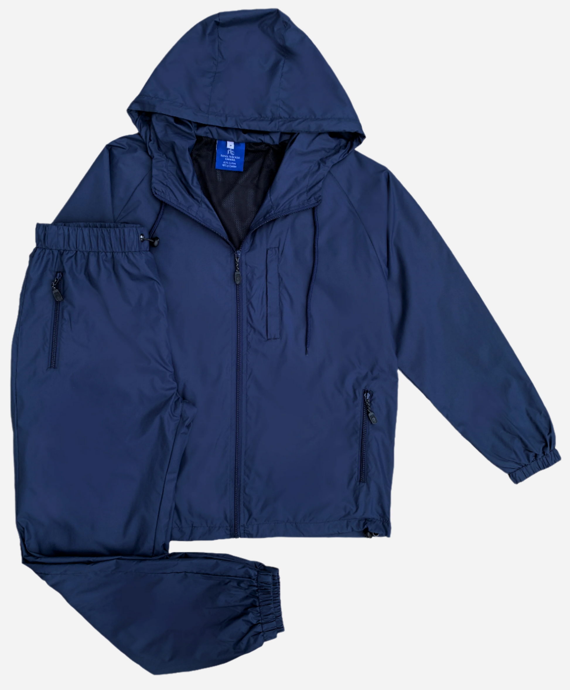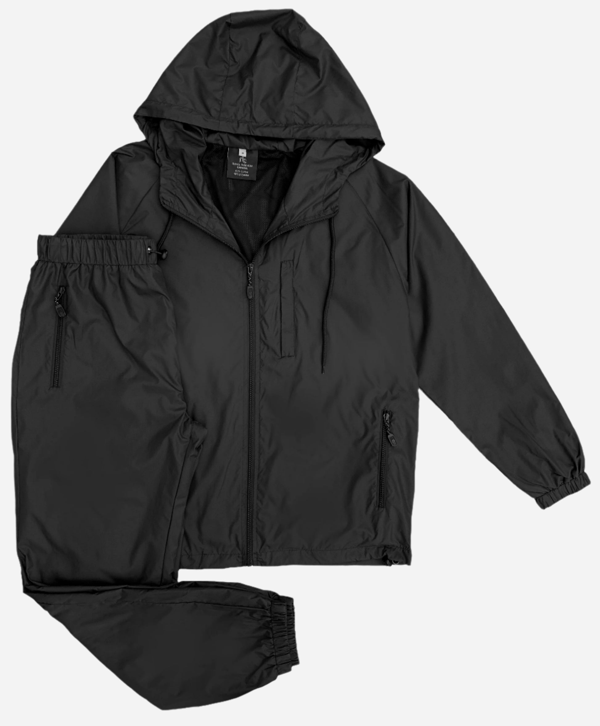- Full-zip jacket with hood, zippered chest and side pockets, plus elastic-waist joggers.