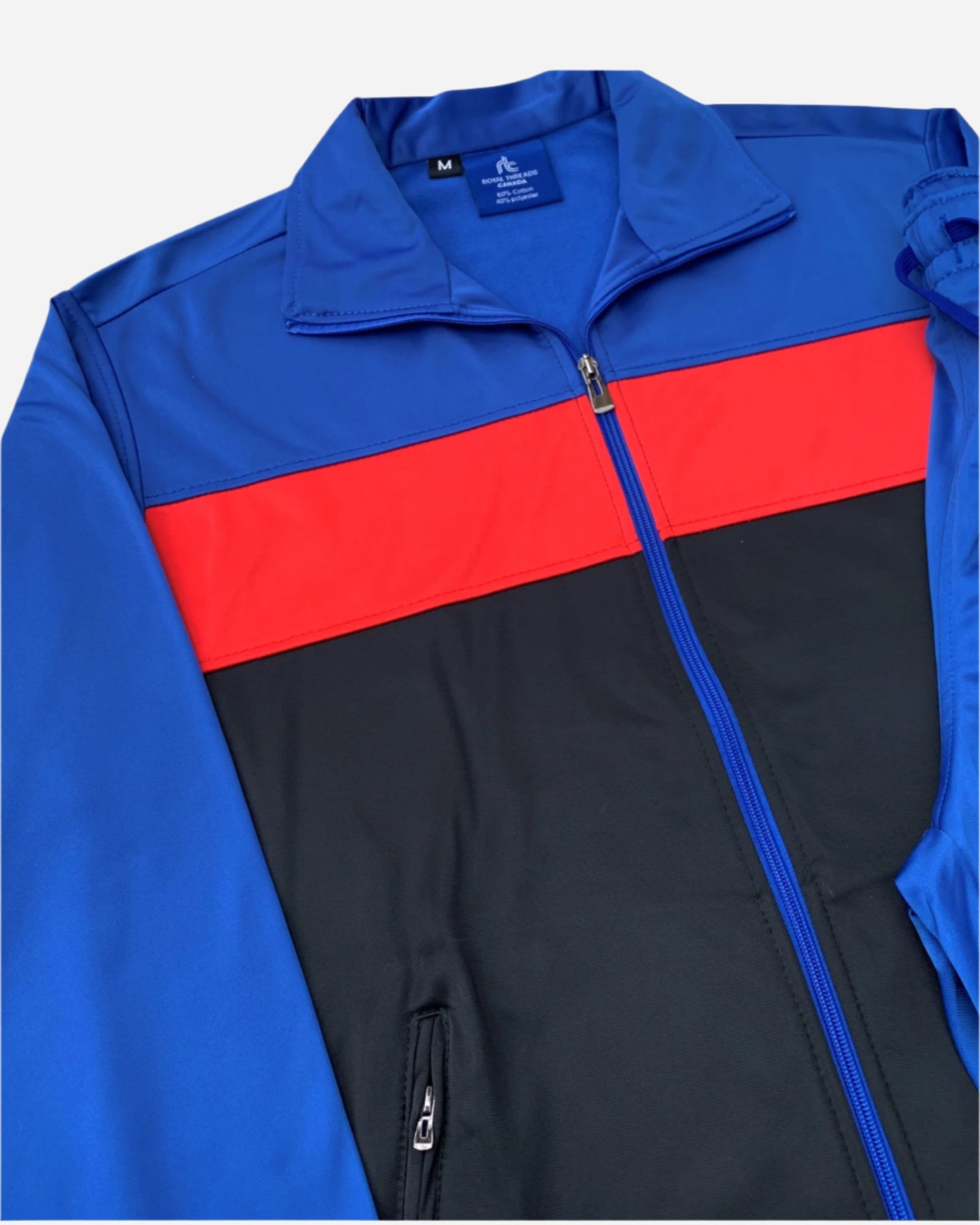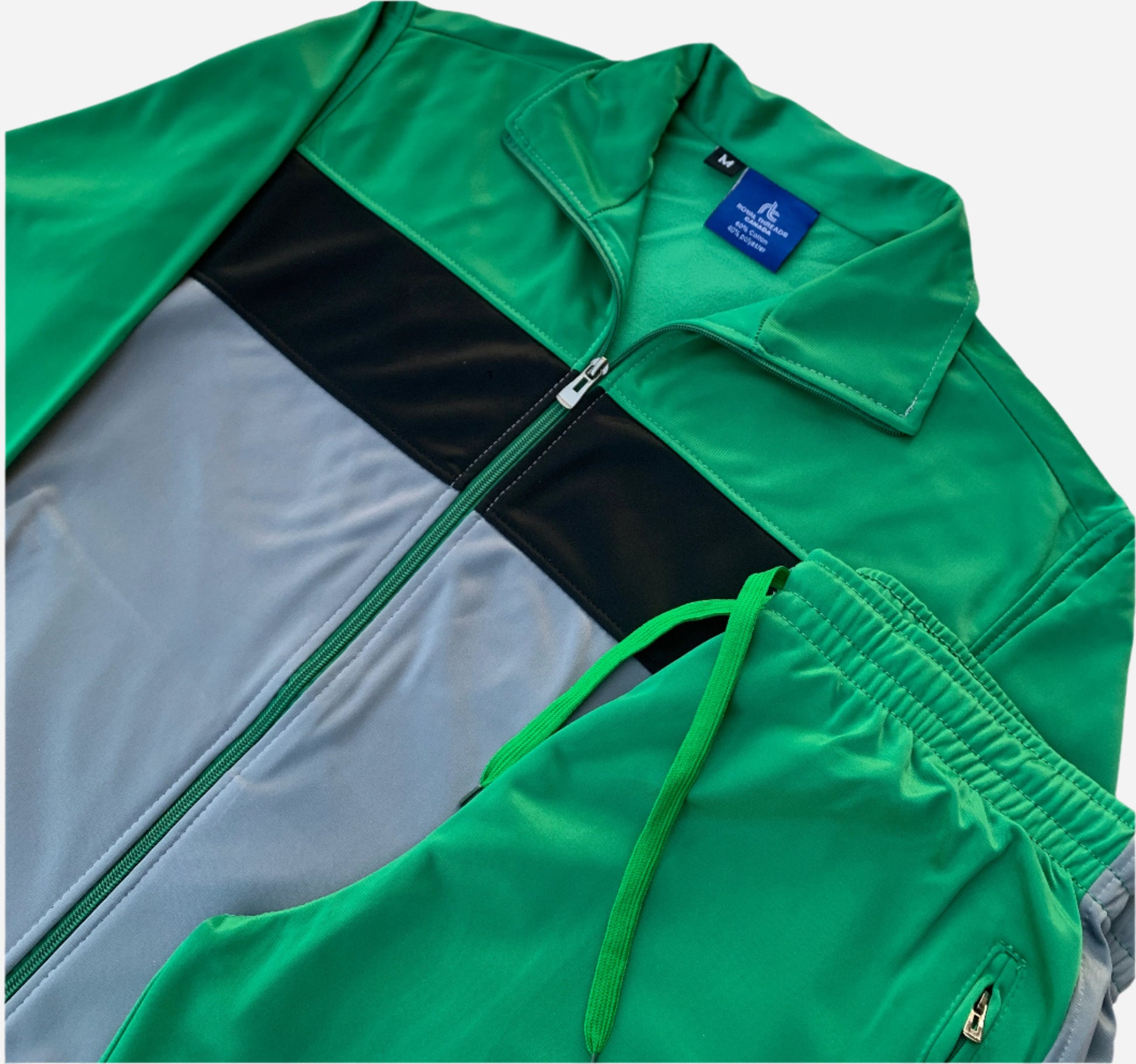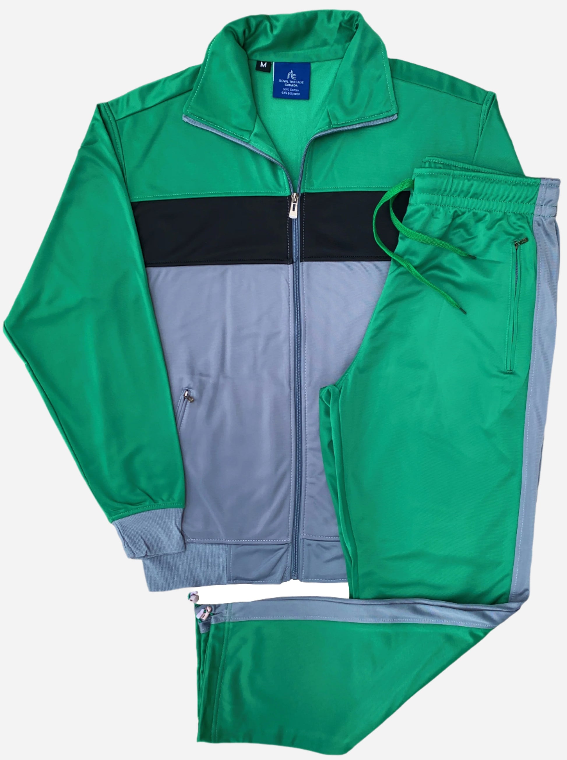 - 250 GSM Track Material. Jacket & pants with 2 zippered side pockets.