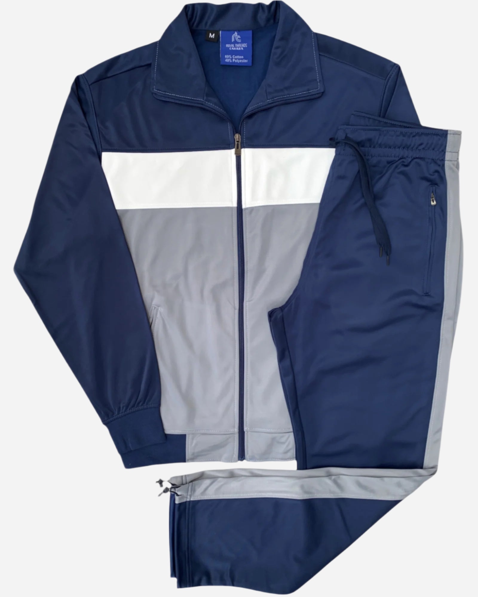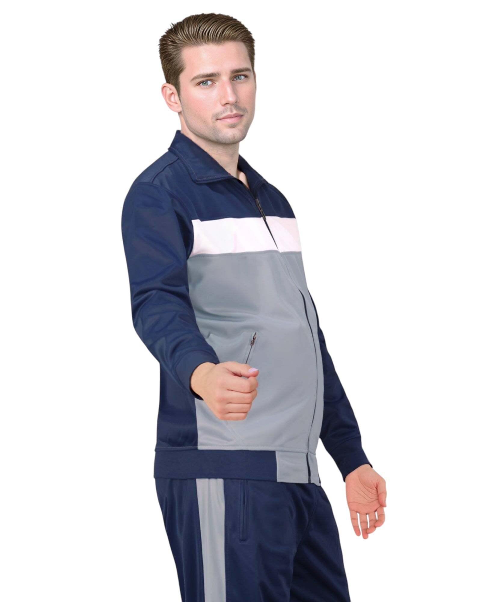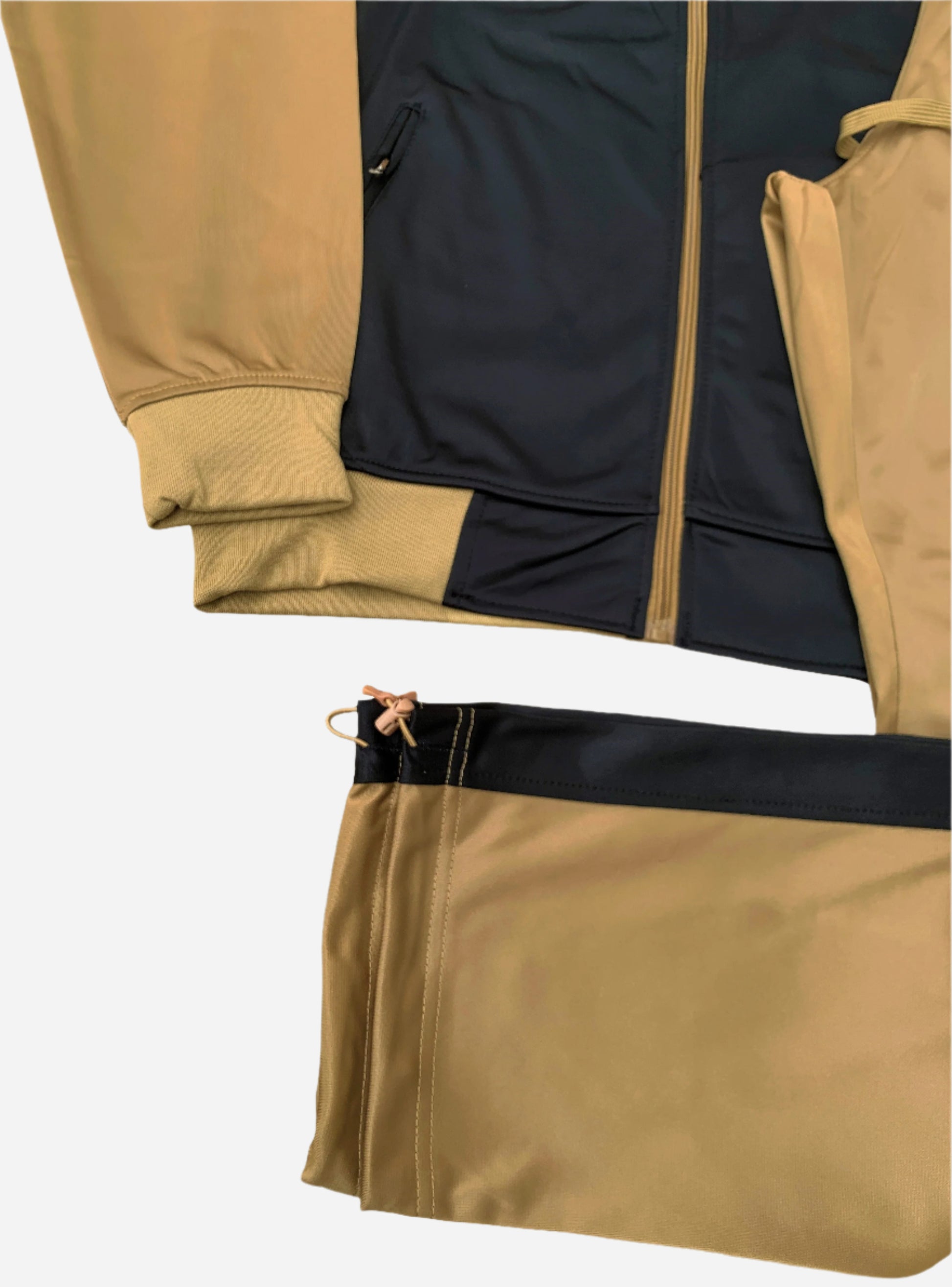 - 250 GSM Track Material. Jacket & pants with 2 zippered side pockets.