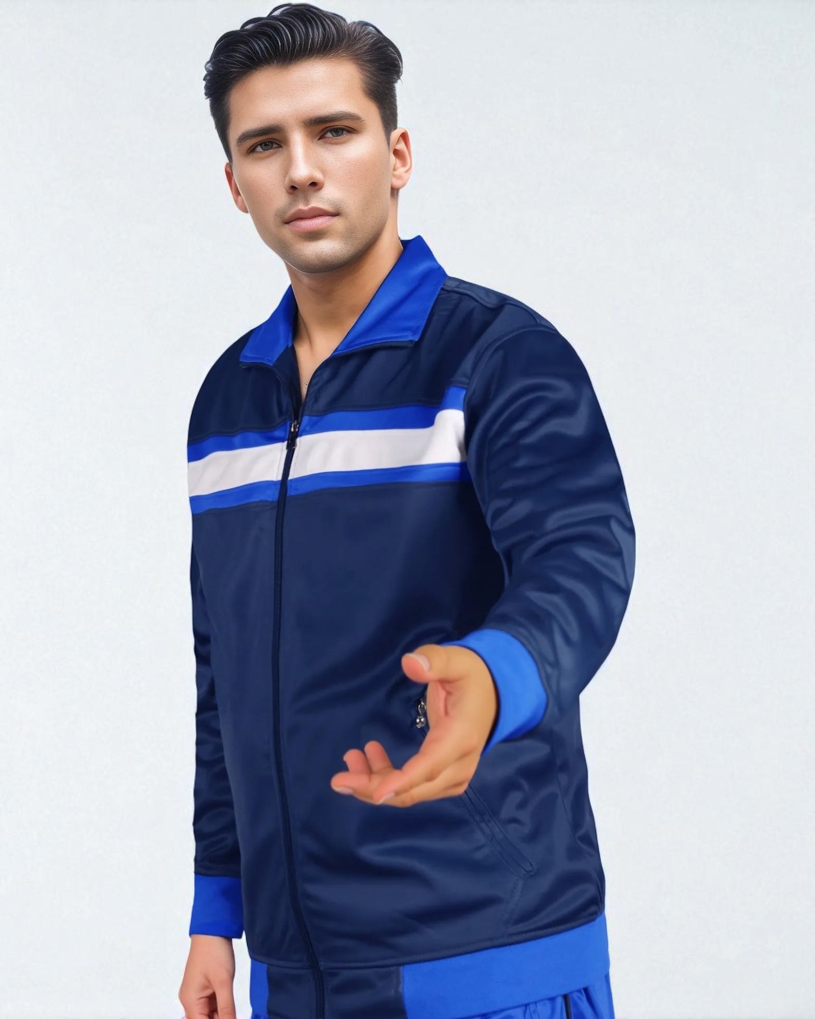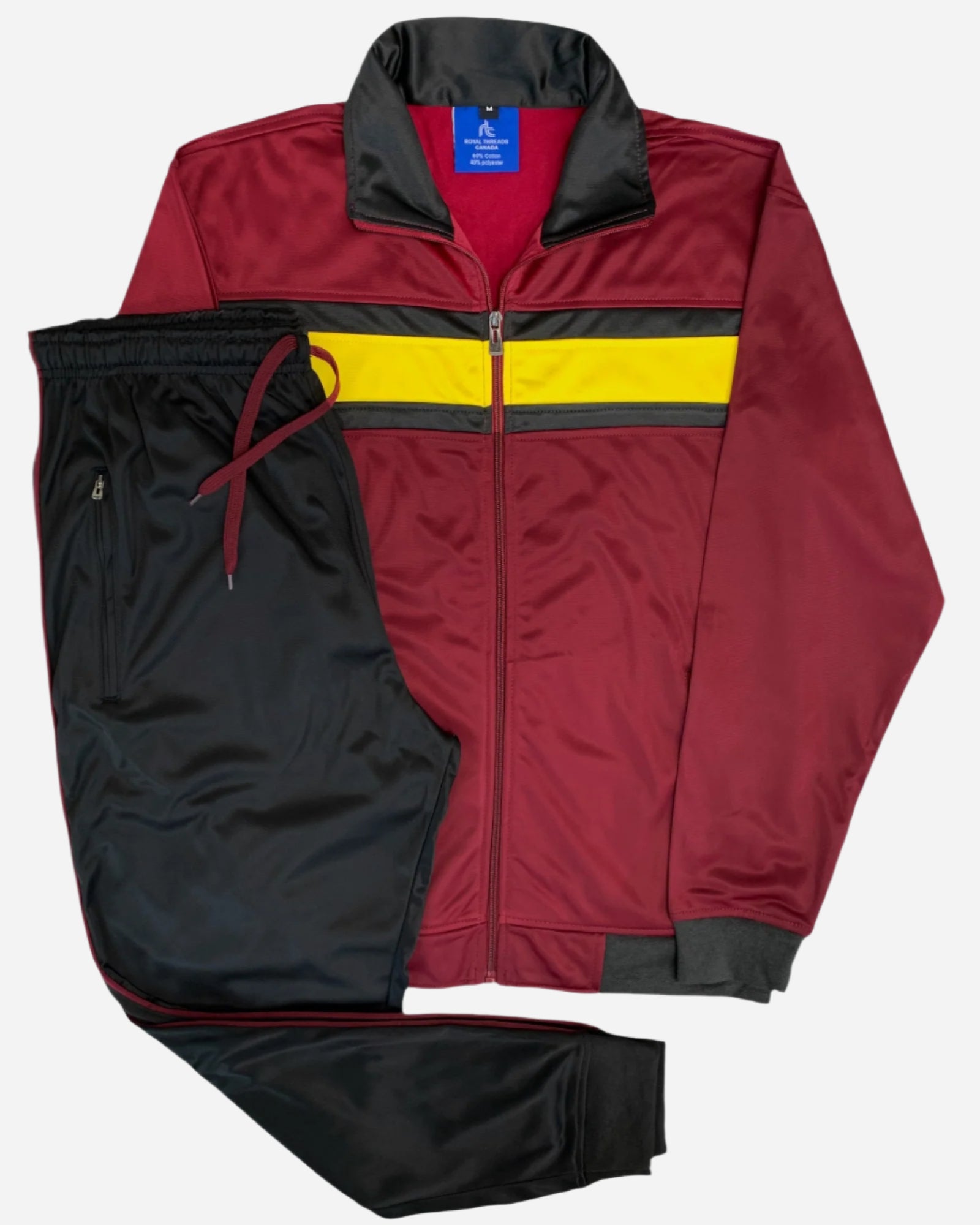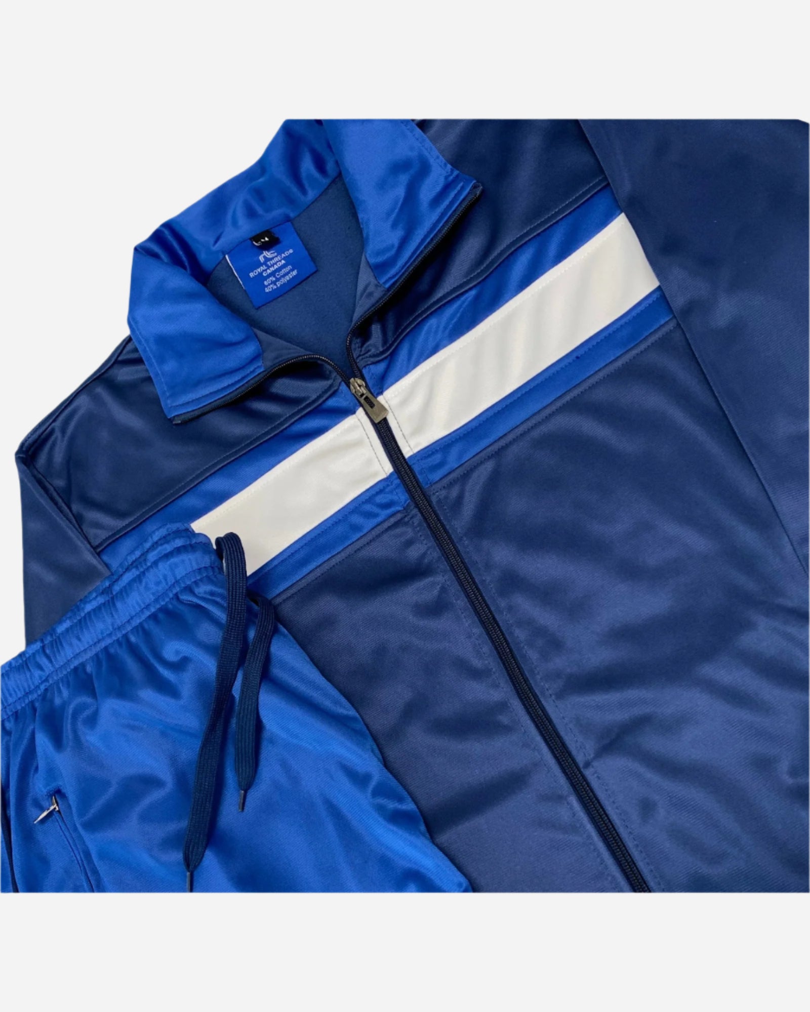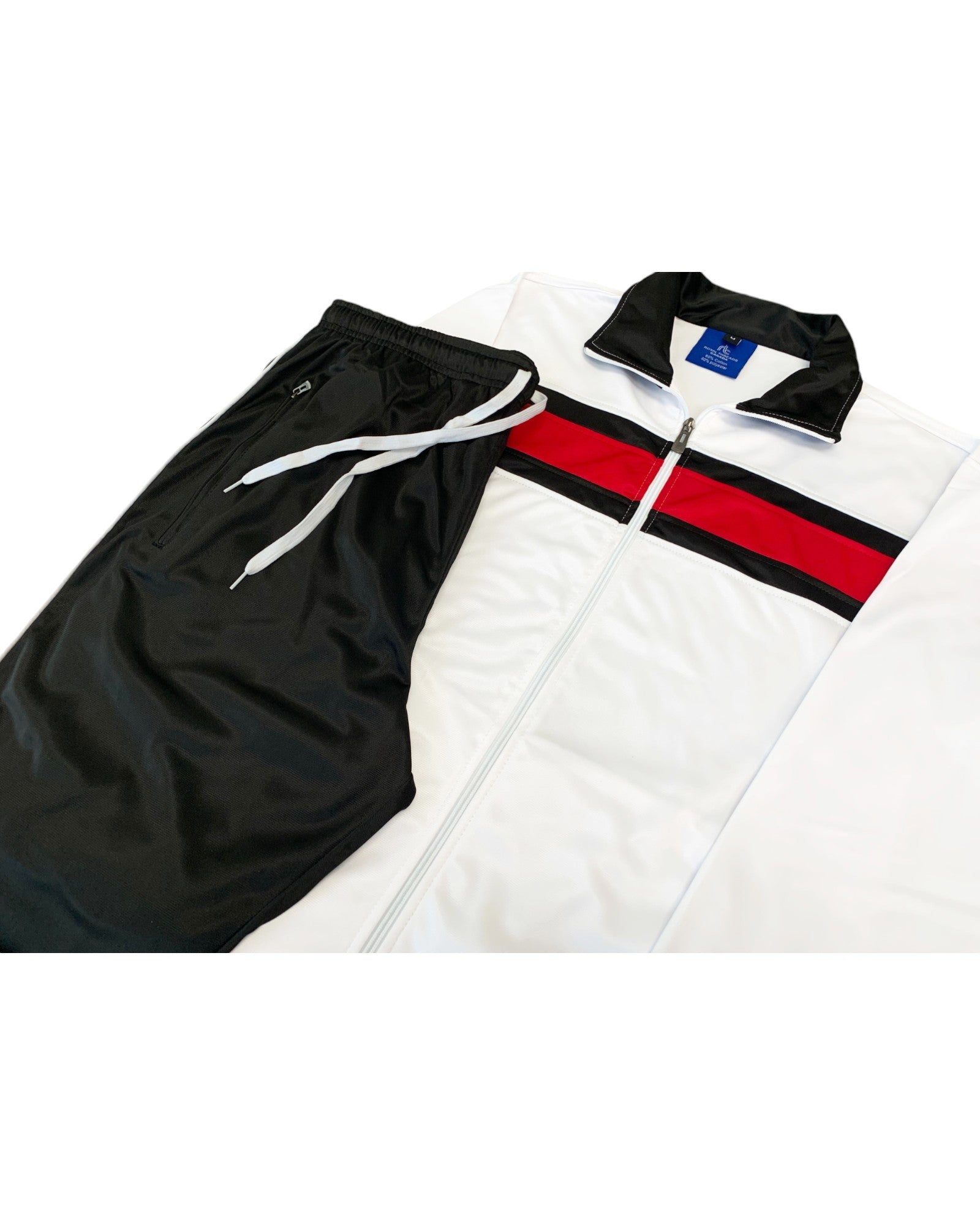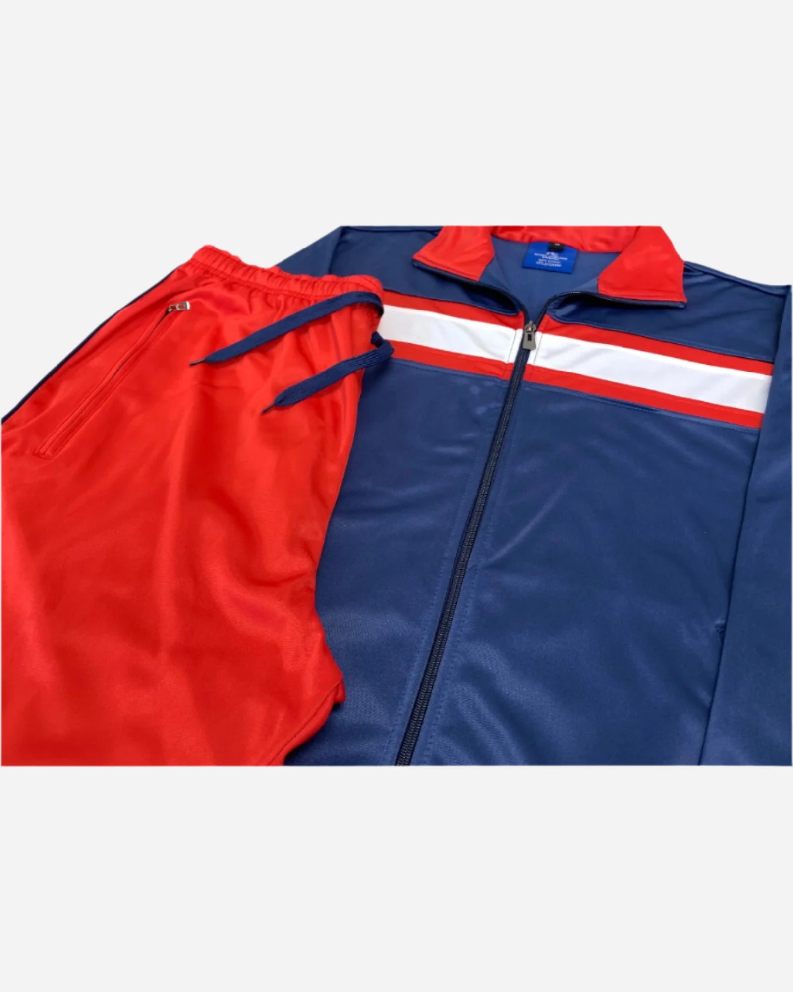 - 250 GSM Track Material. Jacket & pants with 2 zippered side pockets.