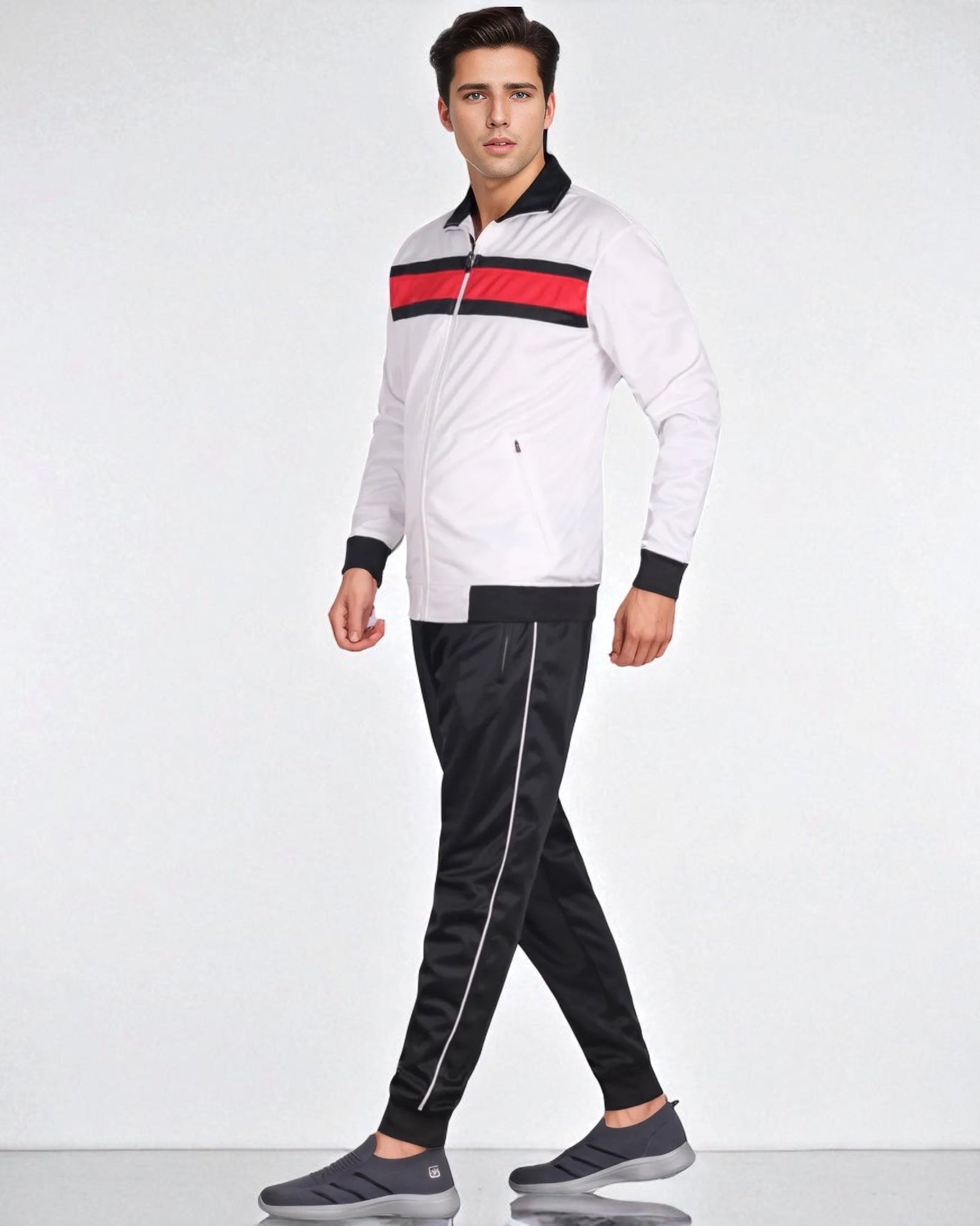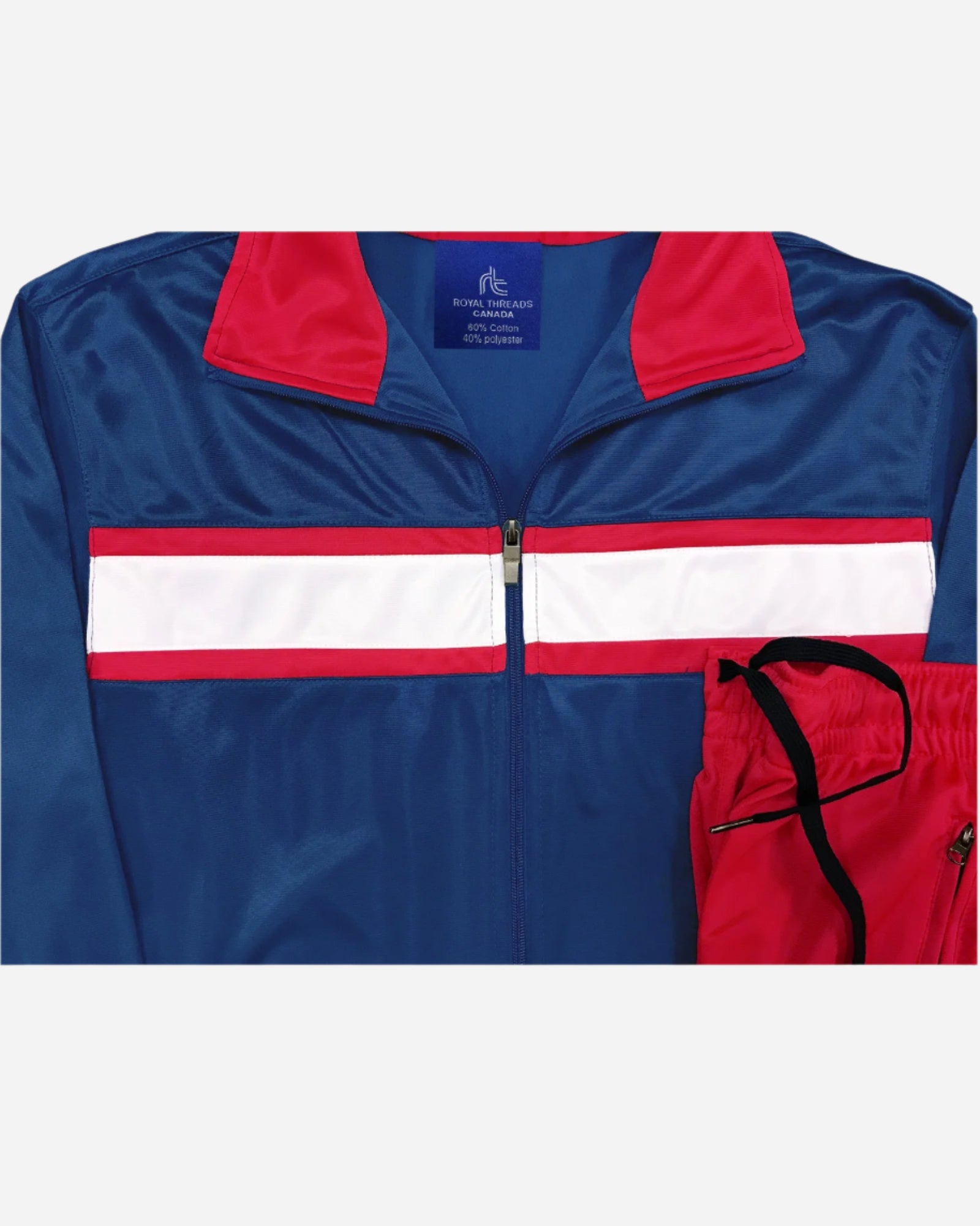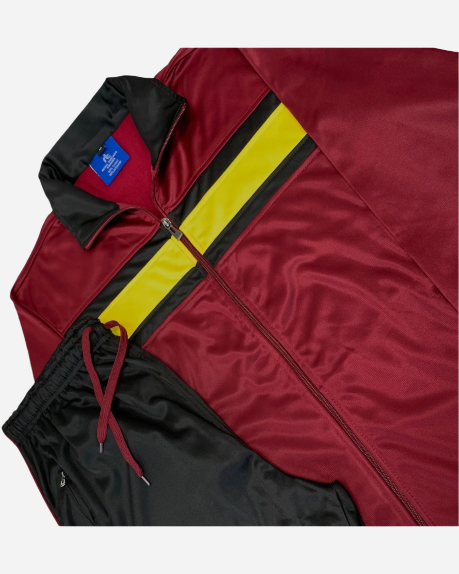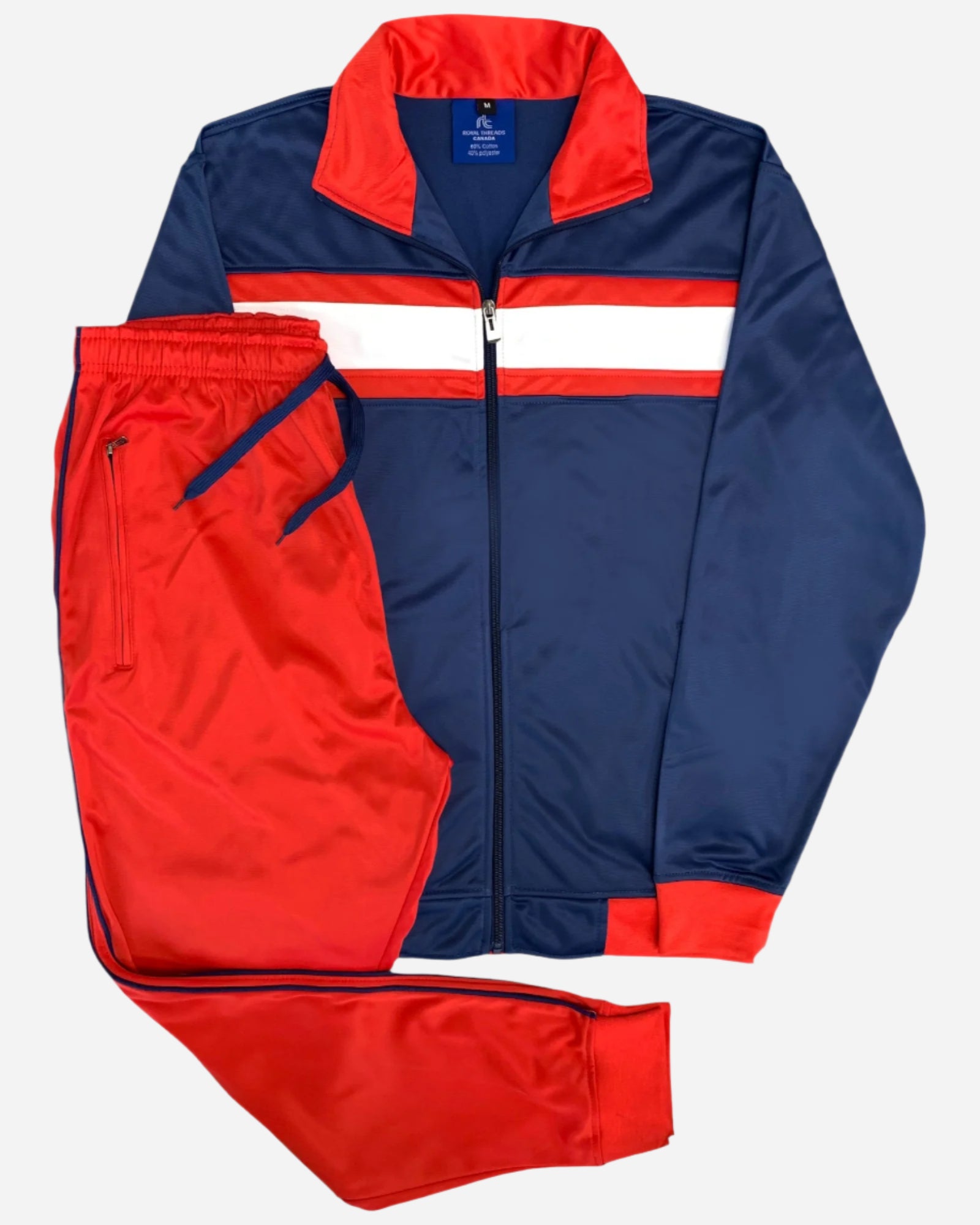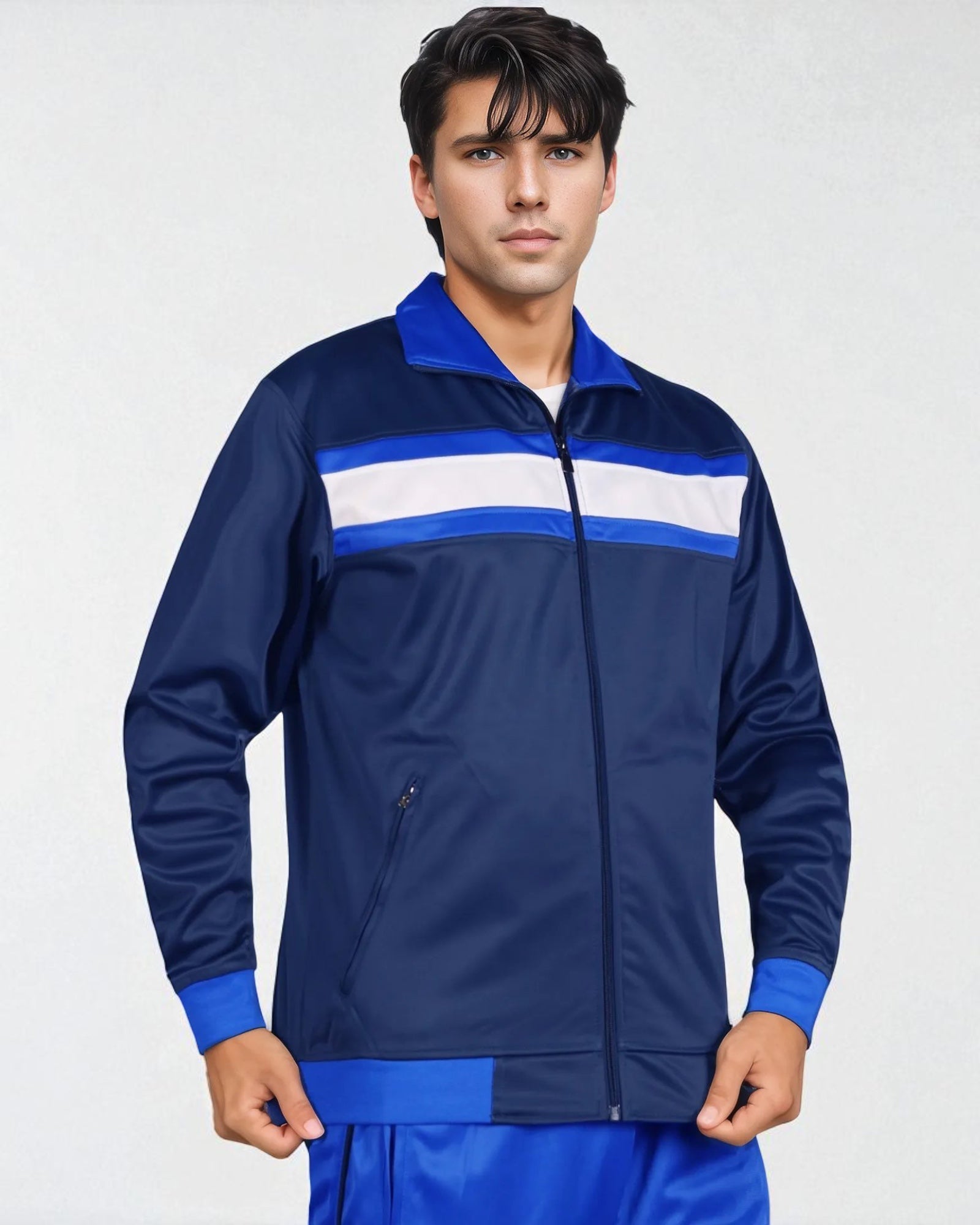 - 250 GSM Track Material. Jacket & pants with 2 zippered side pockets.