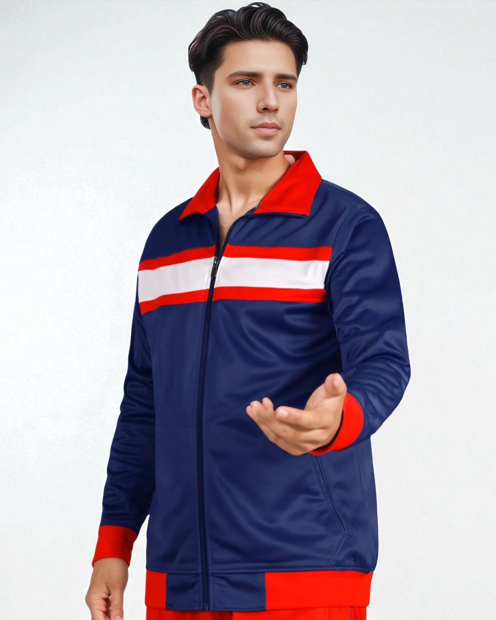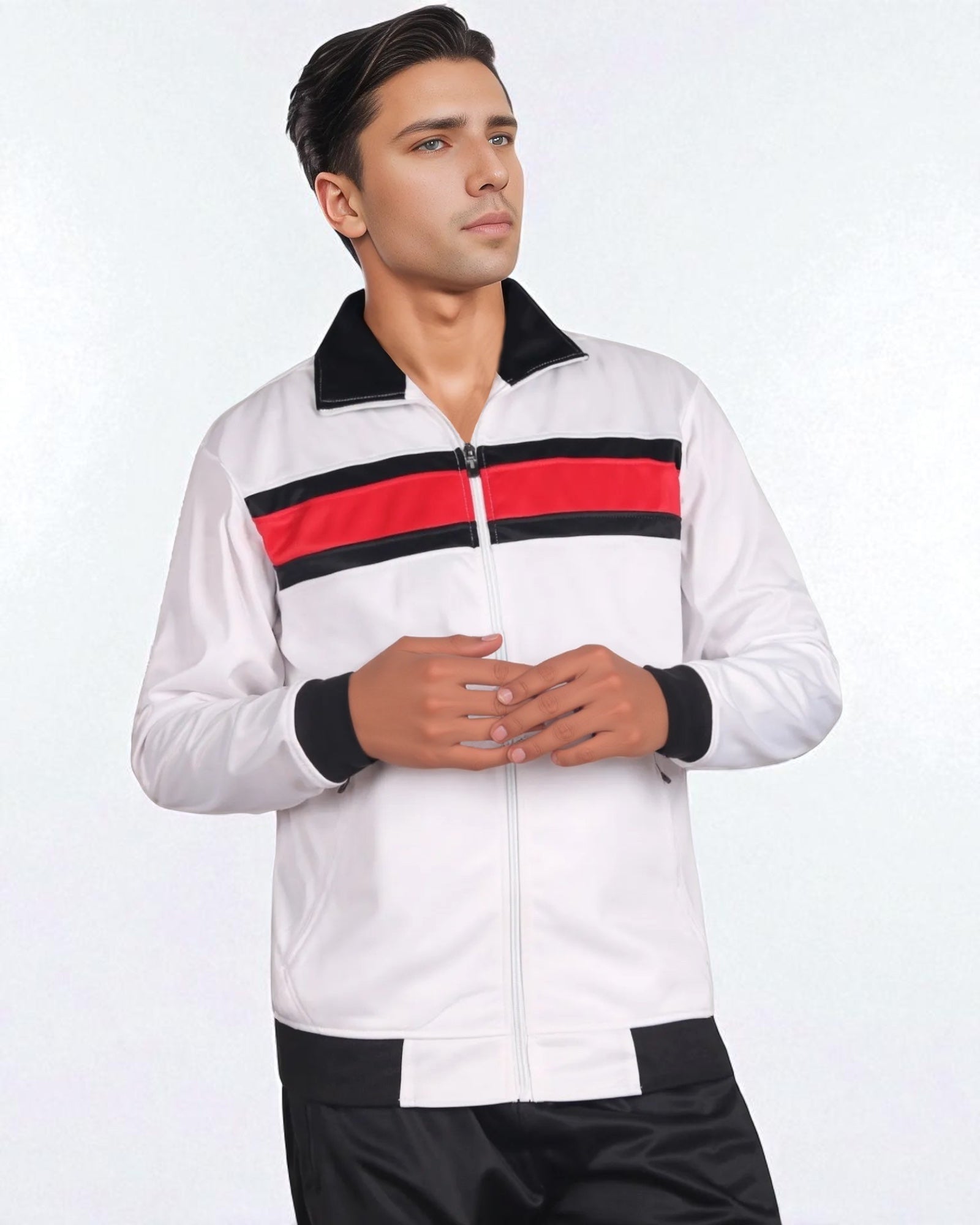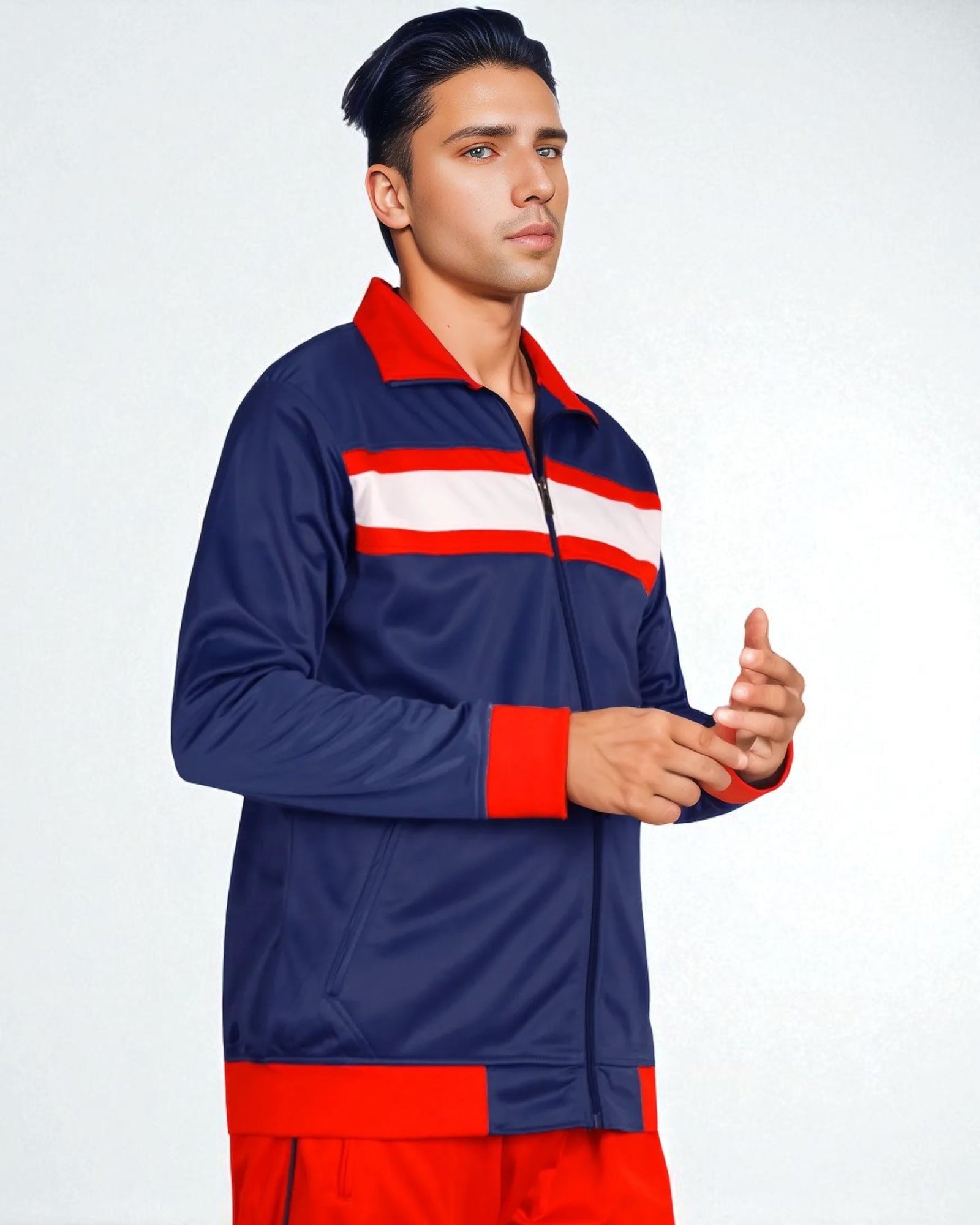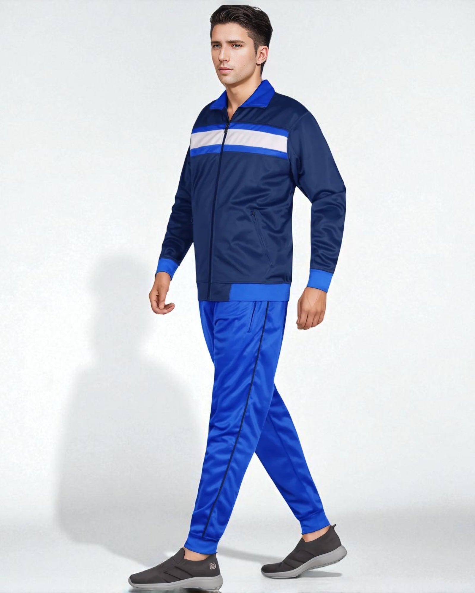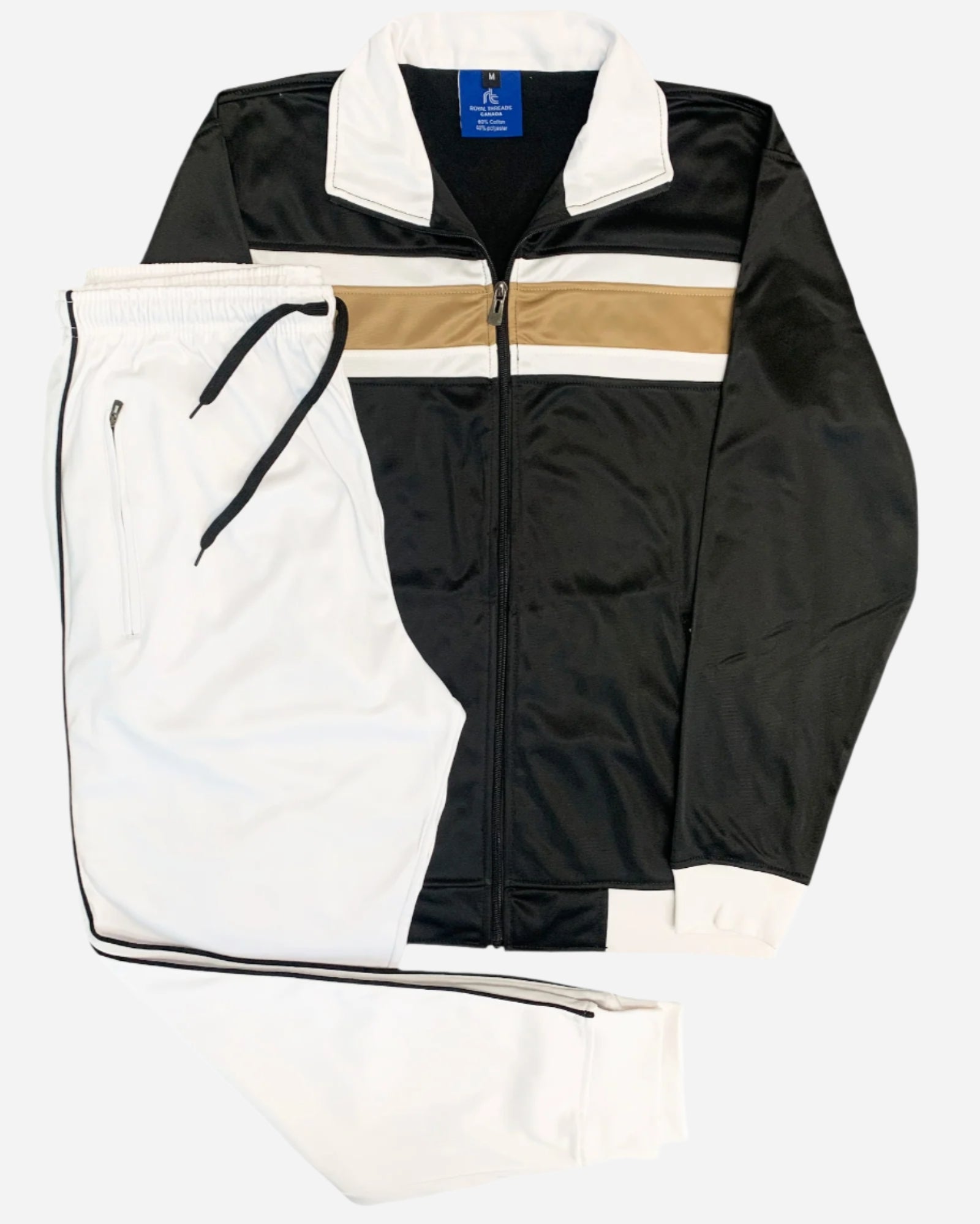 - 250 GSM Track Material. Jacket & pants with 2 zippered side pockets.