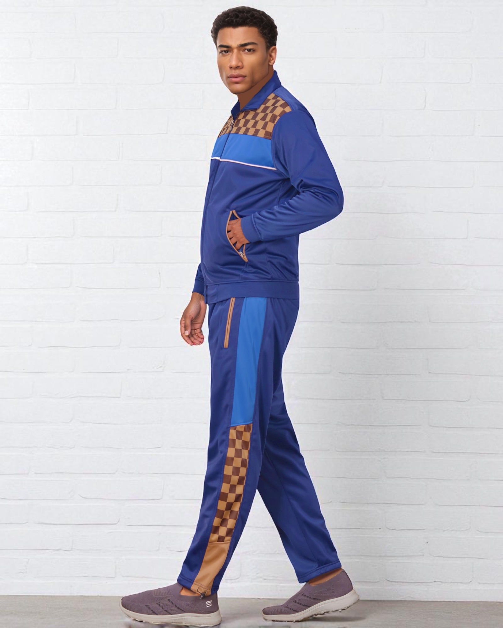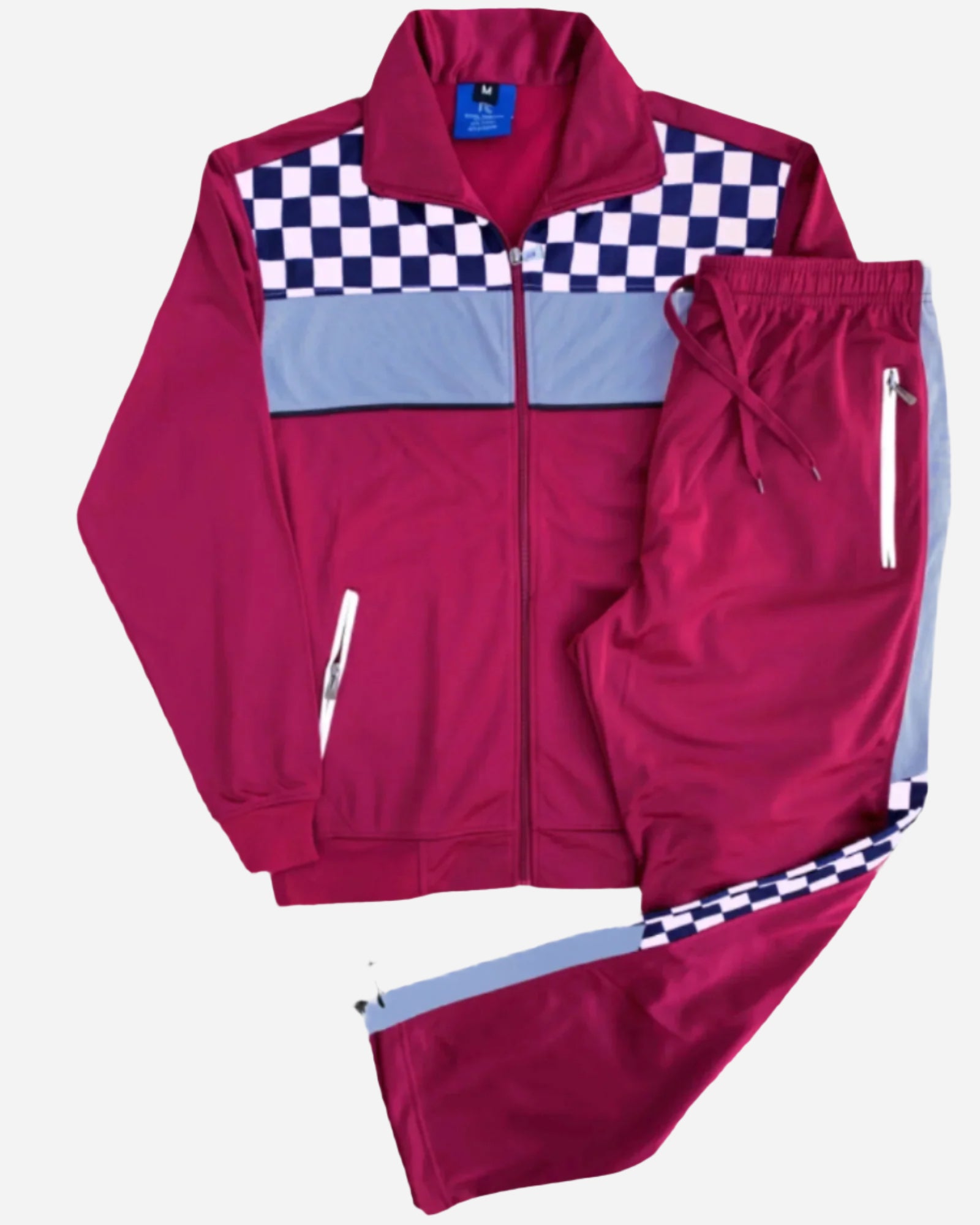The men’s checker box style tracksuit is featured in a three color combination style. The checker box tracksuit style complements current fashion trends with a classy look. The 2-piece matching suit is ideal on the sports field, at the GYM or just casual weekend activities. The material is seamless comfortable and durable to last many seasons.