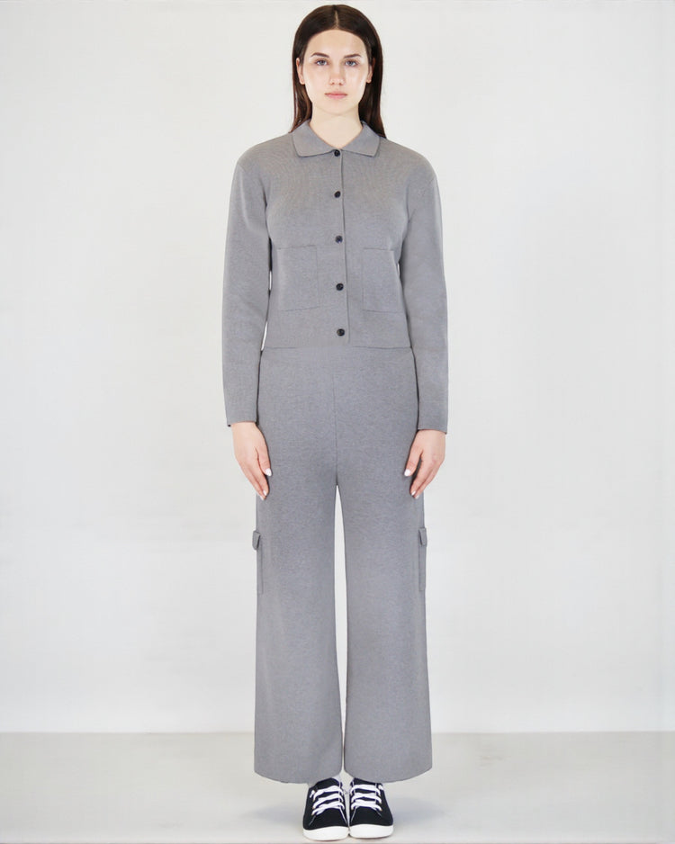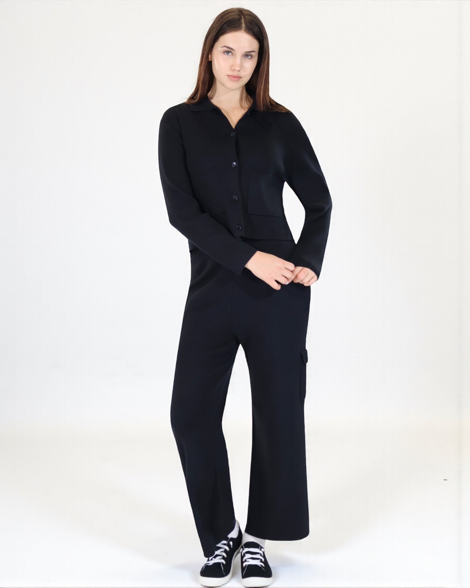 Effortlessly refined and endlessly versatile, this Knit Button-Up Set outfit blends tailored polish with everyday comfort. Crafted from a luxuriously soft ribbed knit, the collared top features front patch pockets and a relaxed fit that drapes naturally for a sophisticated silhouette. The coordinating wide-leg pants complete the look with a modern, laid-back feel.