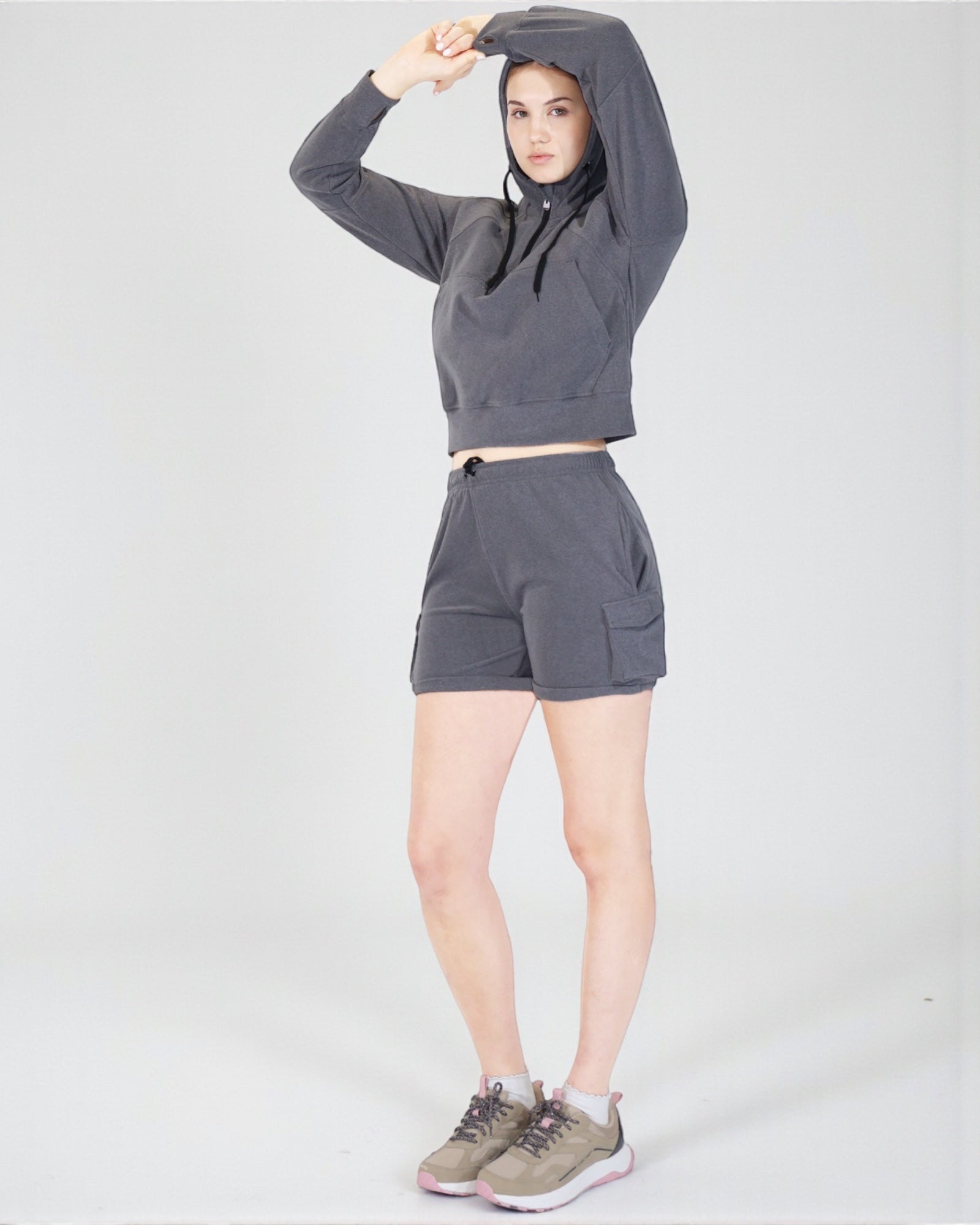 Elevate your off-duty look with this women’s half-zip hoodie and shorts set. Crafted from a soft, warm, and stretchy fabric, it delivers exceptional comfort and durable wear season after season. The half-zip pullover design with adjustable drawstrings adds a sporty, modern touch, while the matching shorts ensure a relaxed fit—perfect for lounging, casual days, or running errands in style.