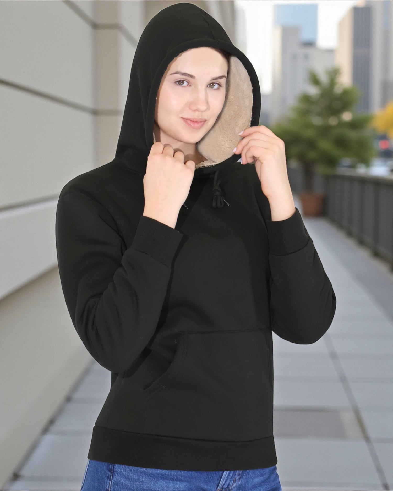 Stay warm and cozy in this women’s sherpa-lined pullover hoodie, designed for comfort during colder days. The plush sherpa interior provides exceptional insulation, while the smooth exterior keeps the look clean and stylish. Finished with adjustable drawstrings, a roomy hood, and a spacious kangaroo pocket, this hoodie blends softness, warmth, and everyday versatility. Perfect for lounging, running errands, or layering for outdoor activities.