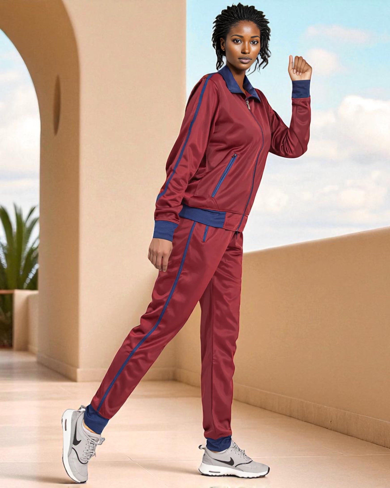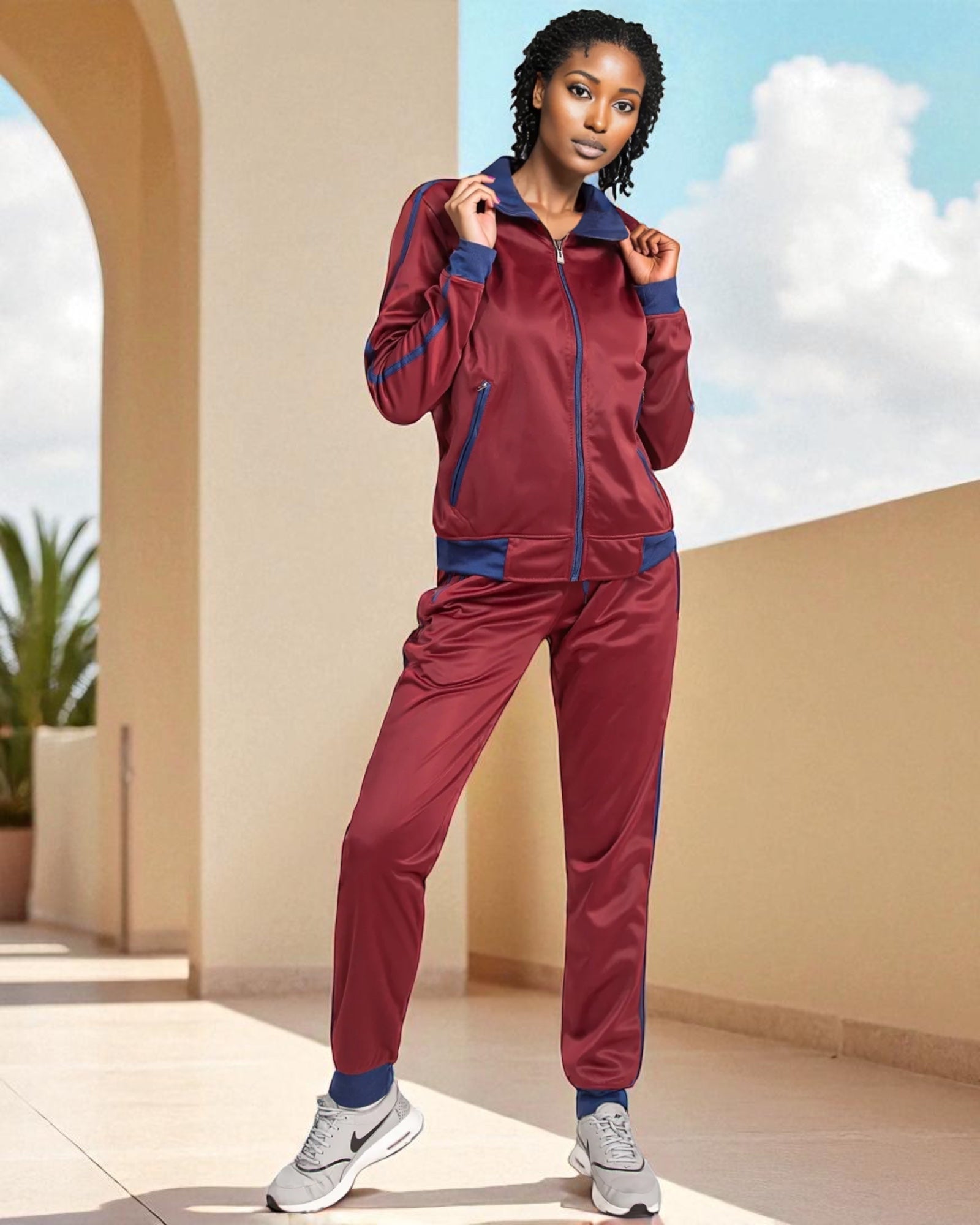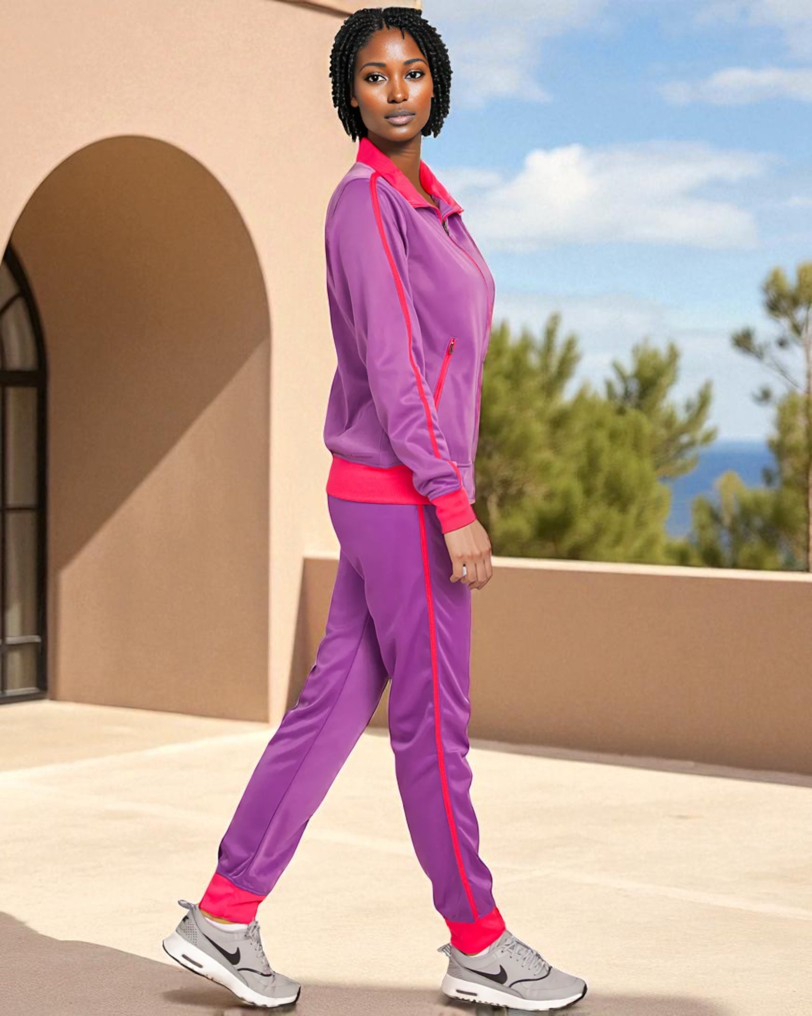 This women's 2-piece tracksuit features a comfortable track material suitable for any age and all sorts of casual and sports activities. Tracksuits have always been in mainstream fashion trends and the elegant color combinations has made this 2-piece tracksuit a top choice for every day activewear. Many traditional outlets do carry trimmed jogger track pants with full zip up track jackets but not many carry a matching 2-piece jogging outfit. This matching 2-piece jogging outfit is available in regular sizes from XS to XL and also plus size are available as 2XL and 3XL. Rest assured that these jogging suits run true to size and offer a relaxed and comfortable fitting for all ages.