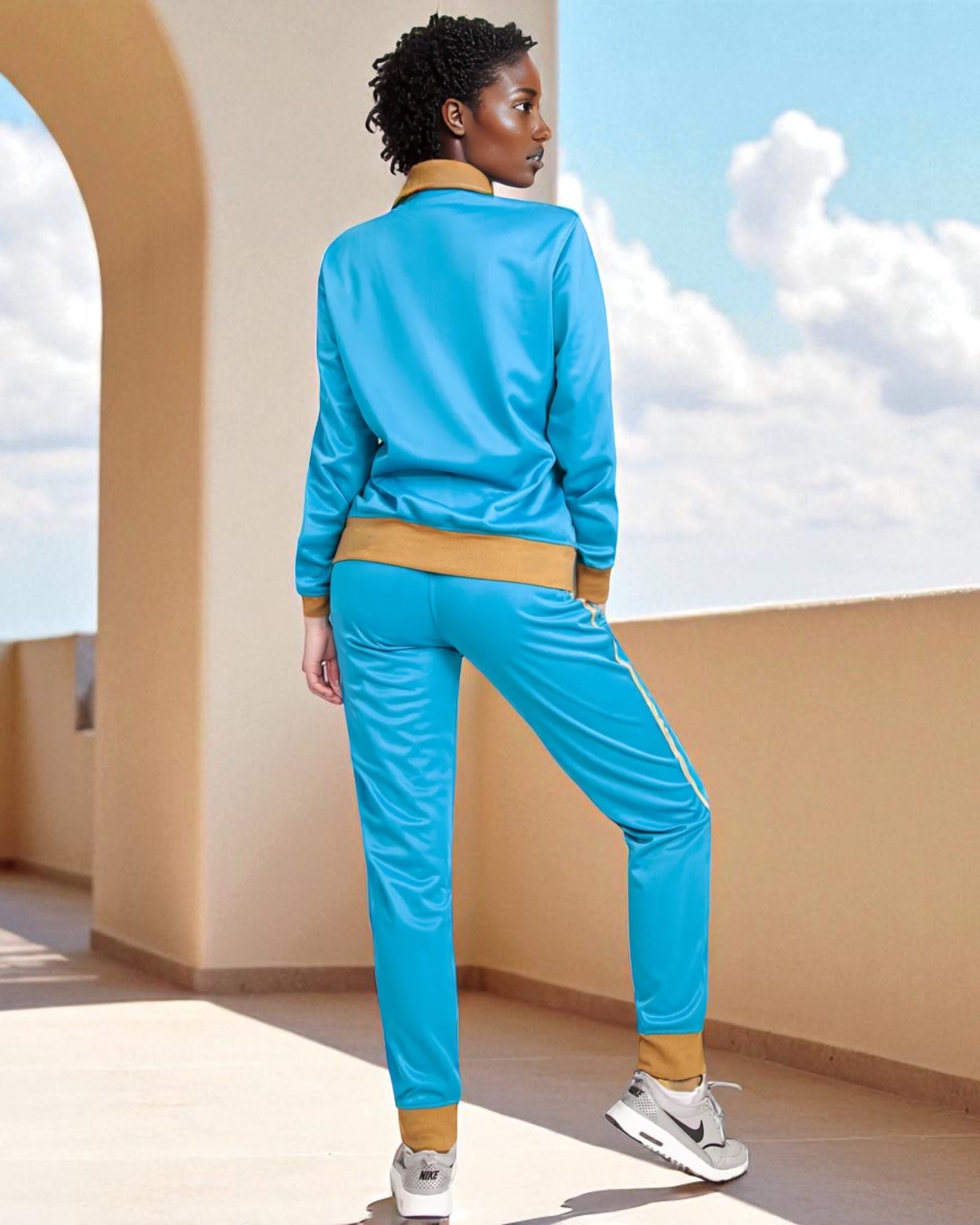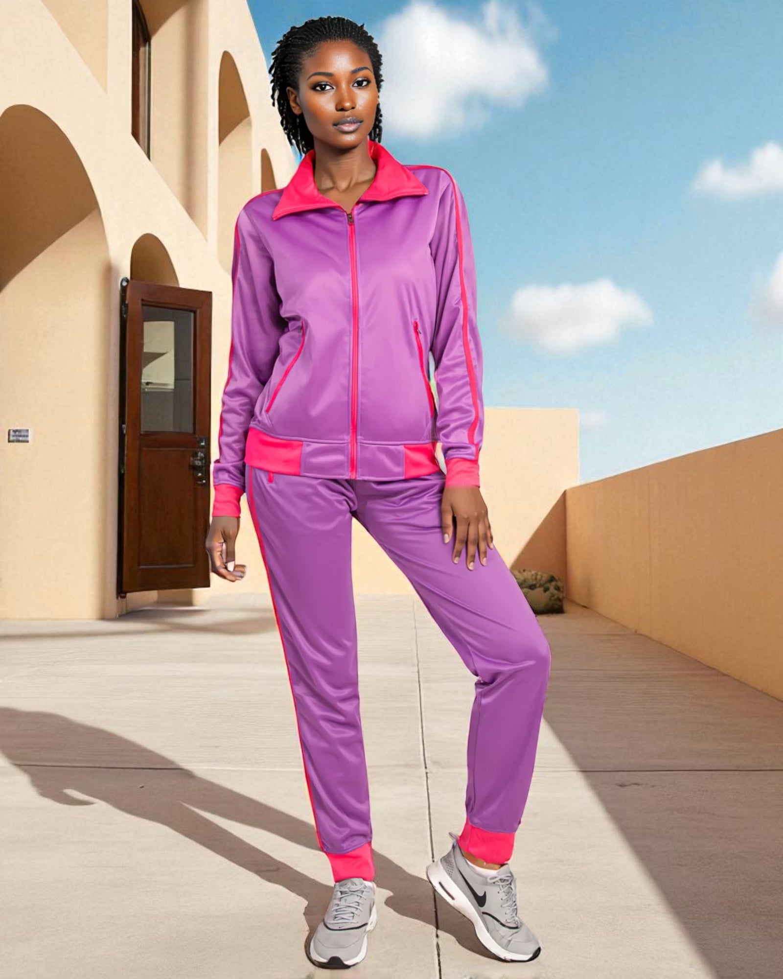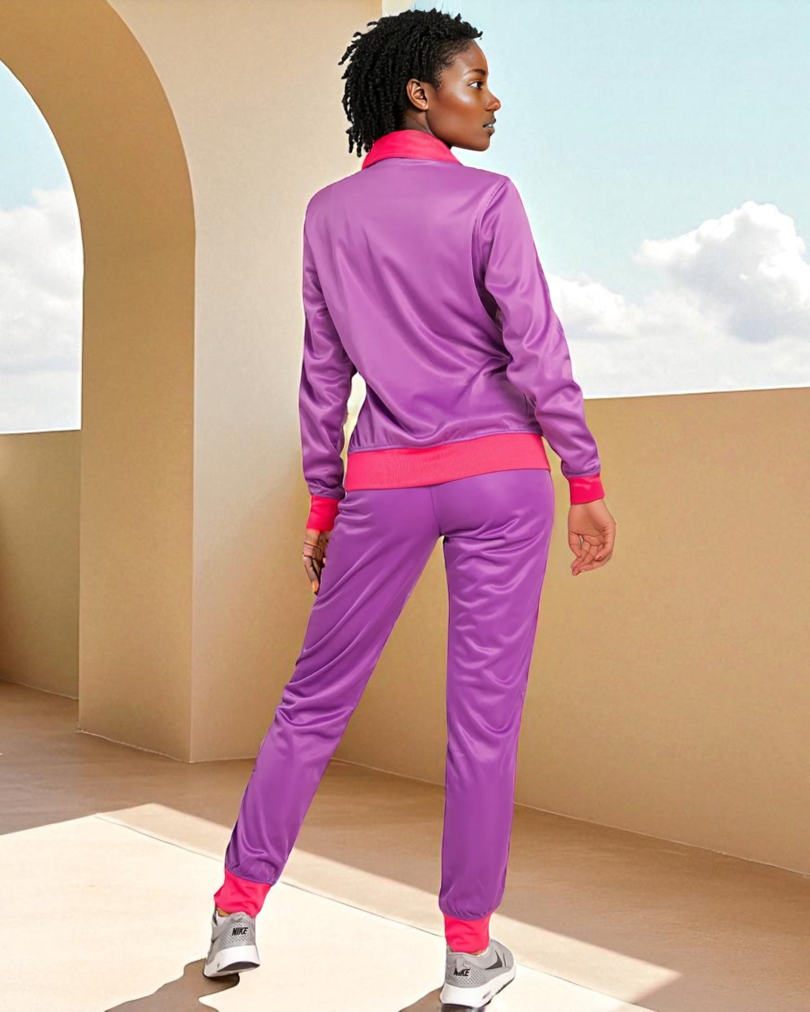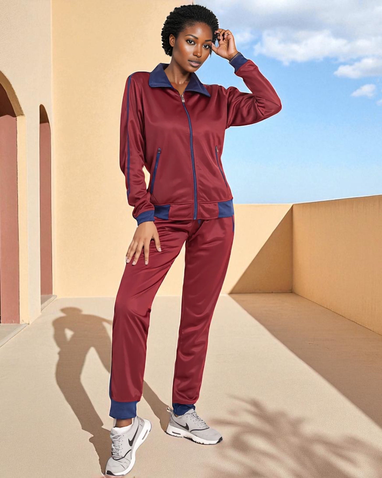 This women's 2-piece tracksuit features a comfortable track material suitable for any age and all sorts of casual and sports activities. Tracksuits have always been in mainstream fashion trends and the elegant color combinations has made this 2-piece tracksuit a top choice for every day activewear. Many traditional outlets do carry trimmed jogger track pants with full zip up track jackets but not many carry a matching 2-piece jogging outfit. This matching 2-piece jogging outfit is available in regular sizes from XS to XL and also plus size are available as 2XL and 3XL. Rest assured that these jogging suits run true to size and offer a relaxed and comfortable fitting for all ages.