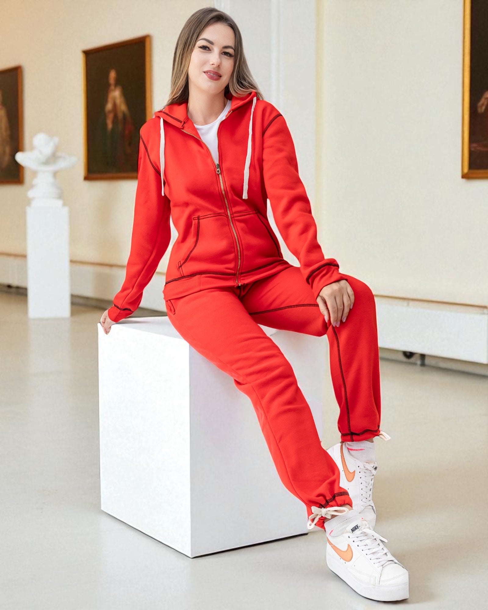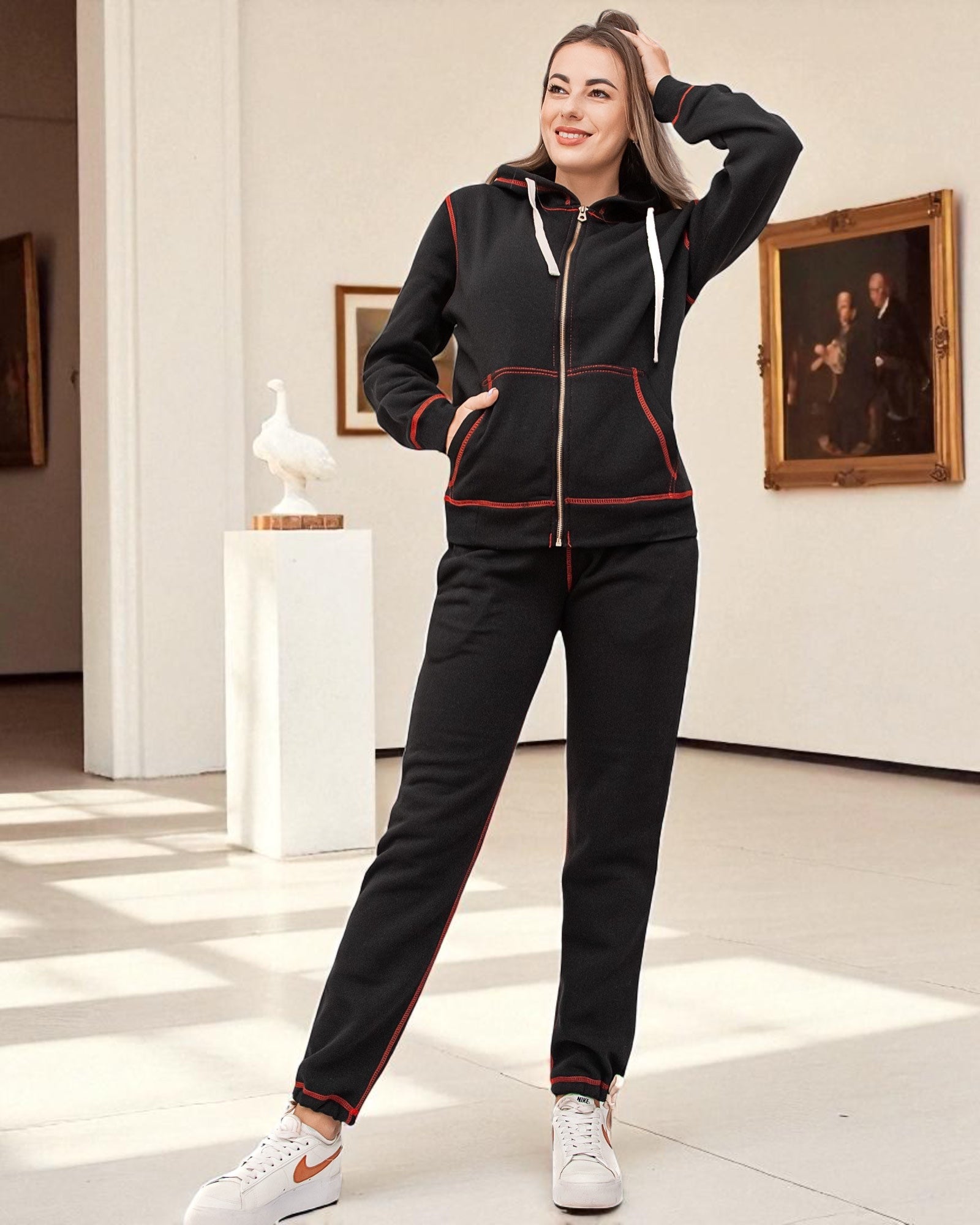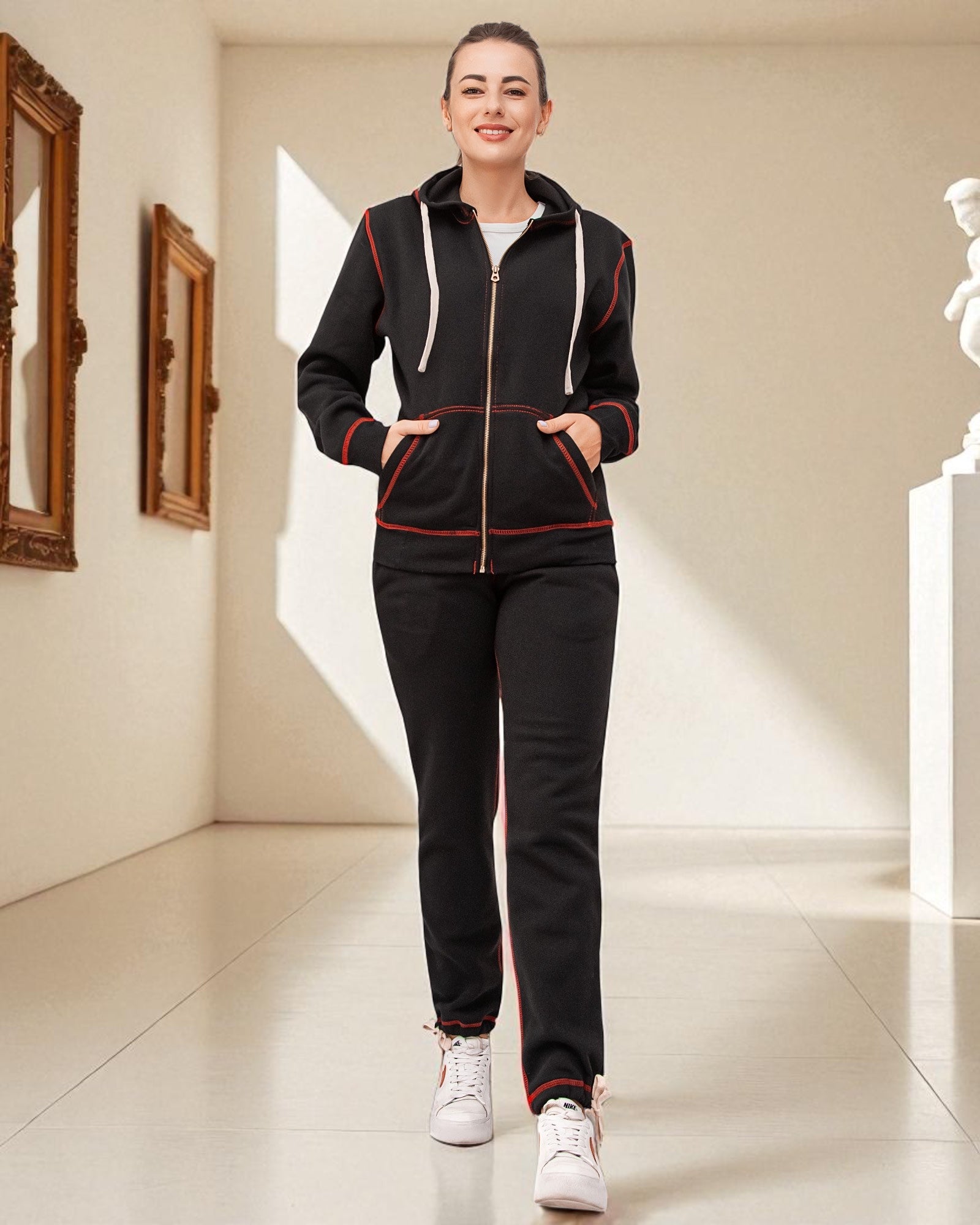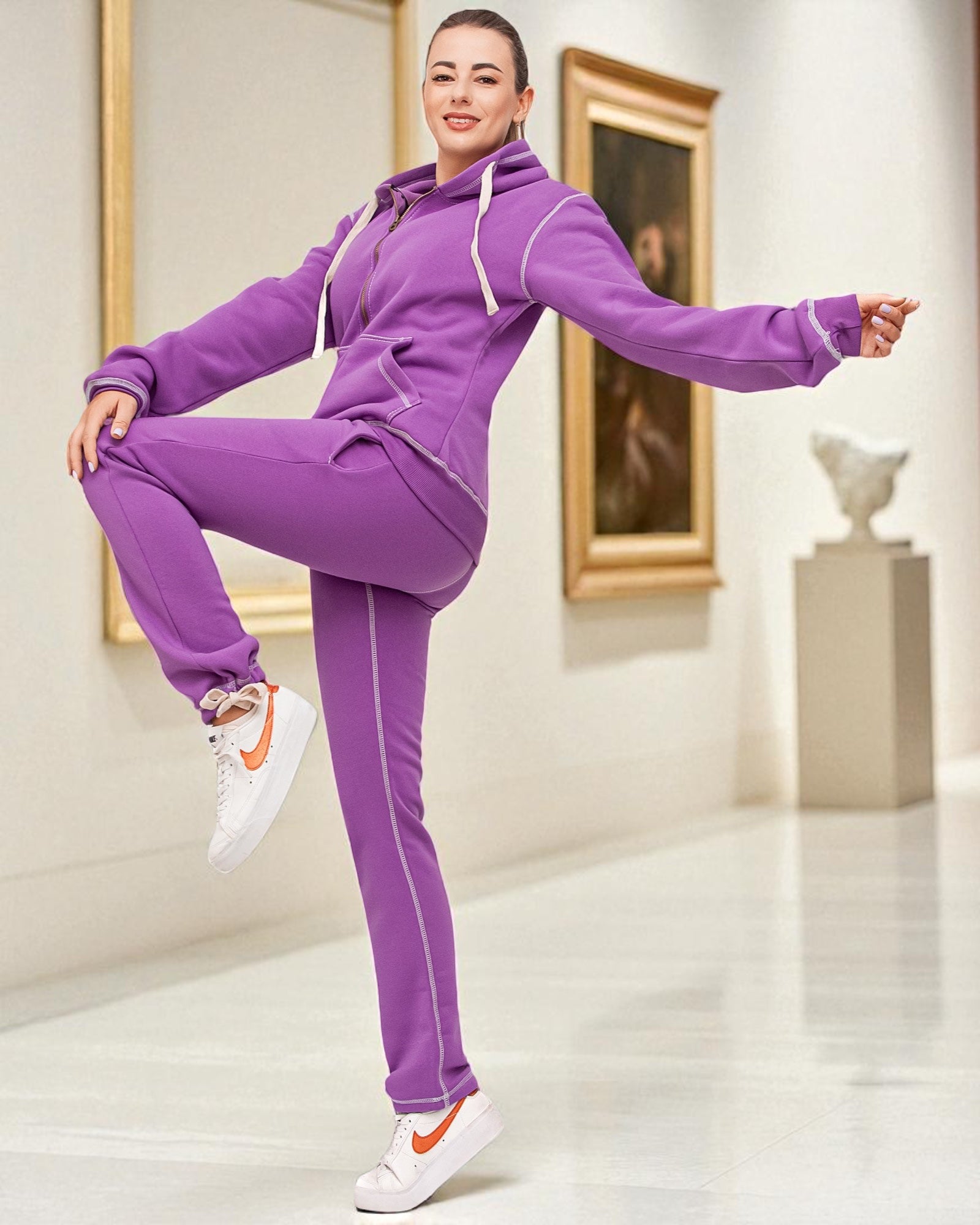 - Zip-up hoodie and joggers with pockets and adjustable ankle ties.