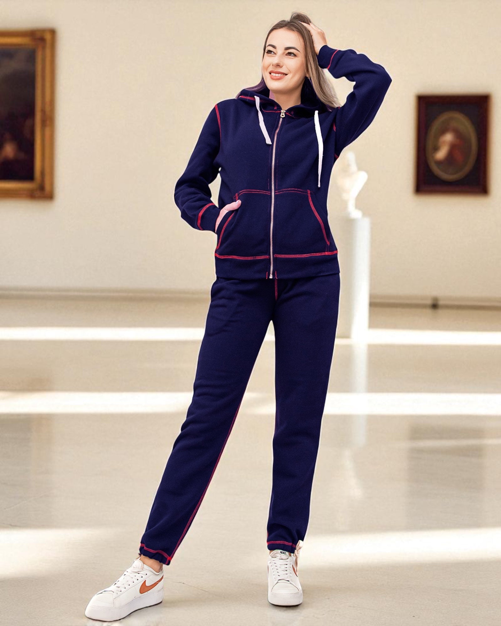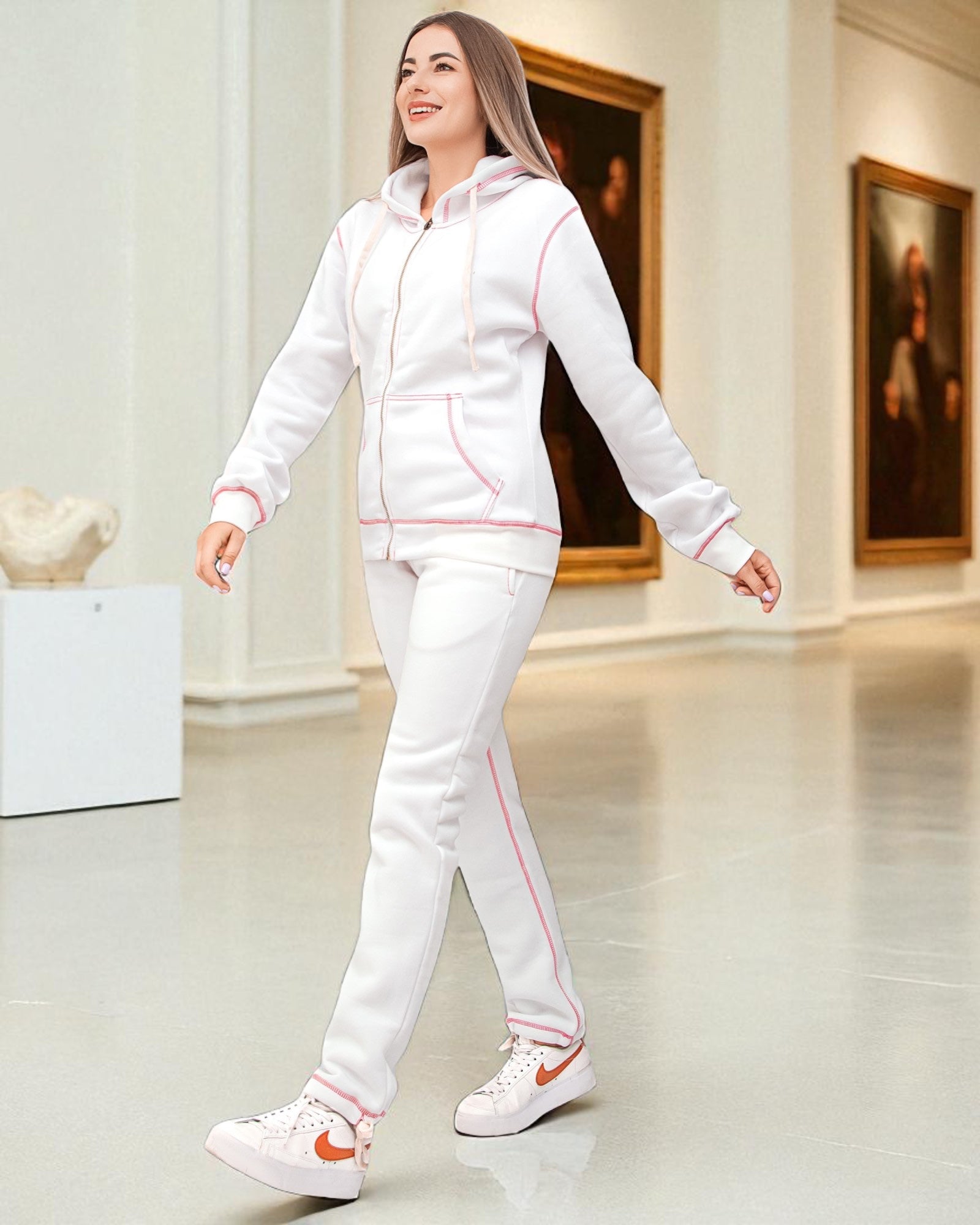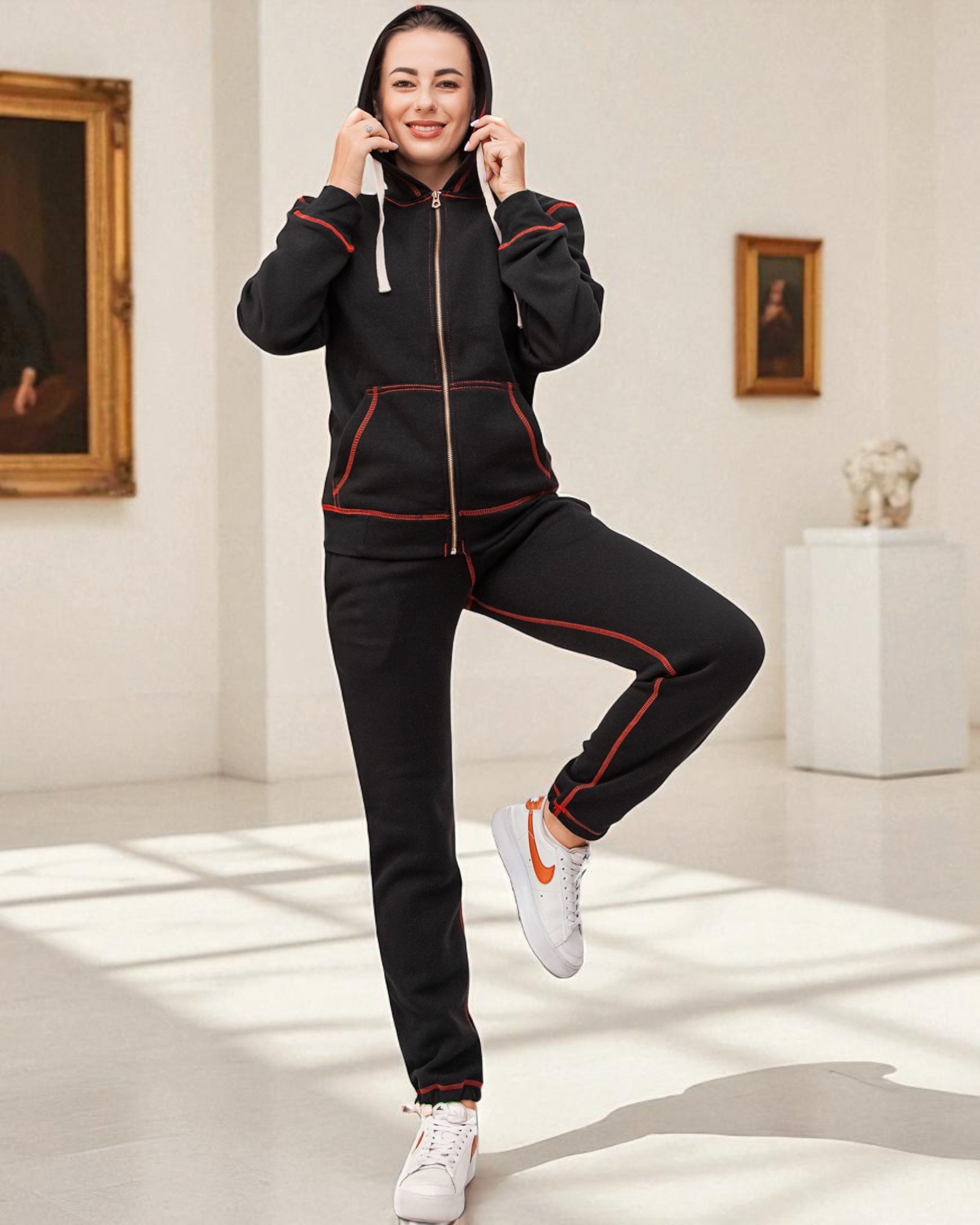 - Zip-up hoodie and joggers with pockets and adjustable ankle ties.