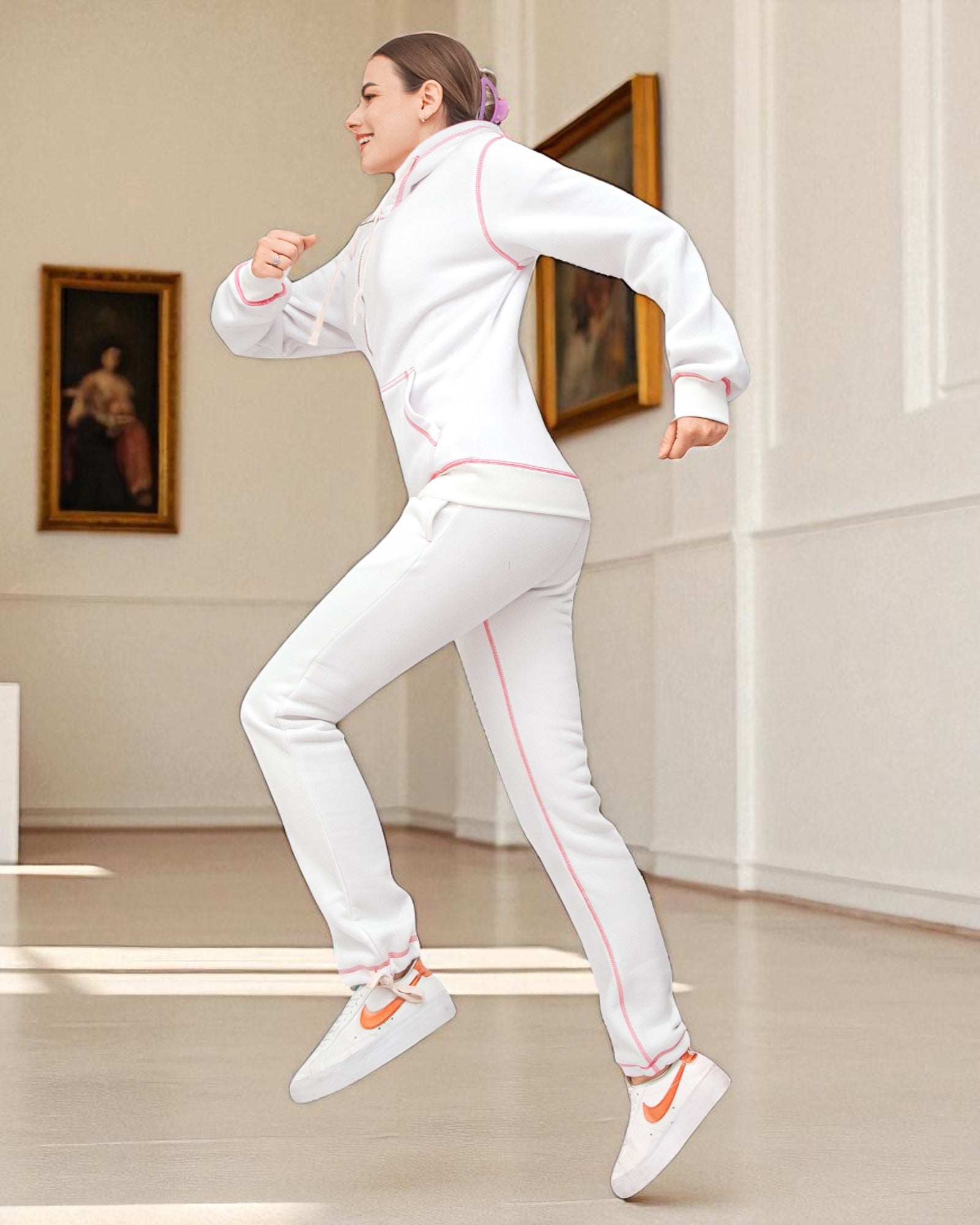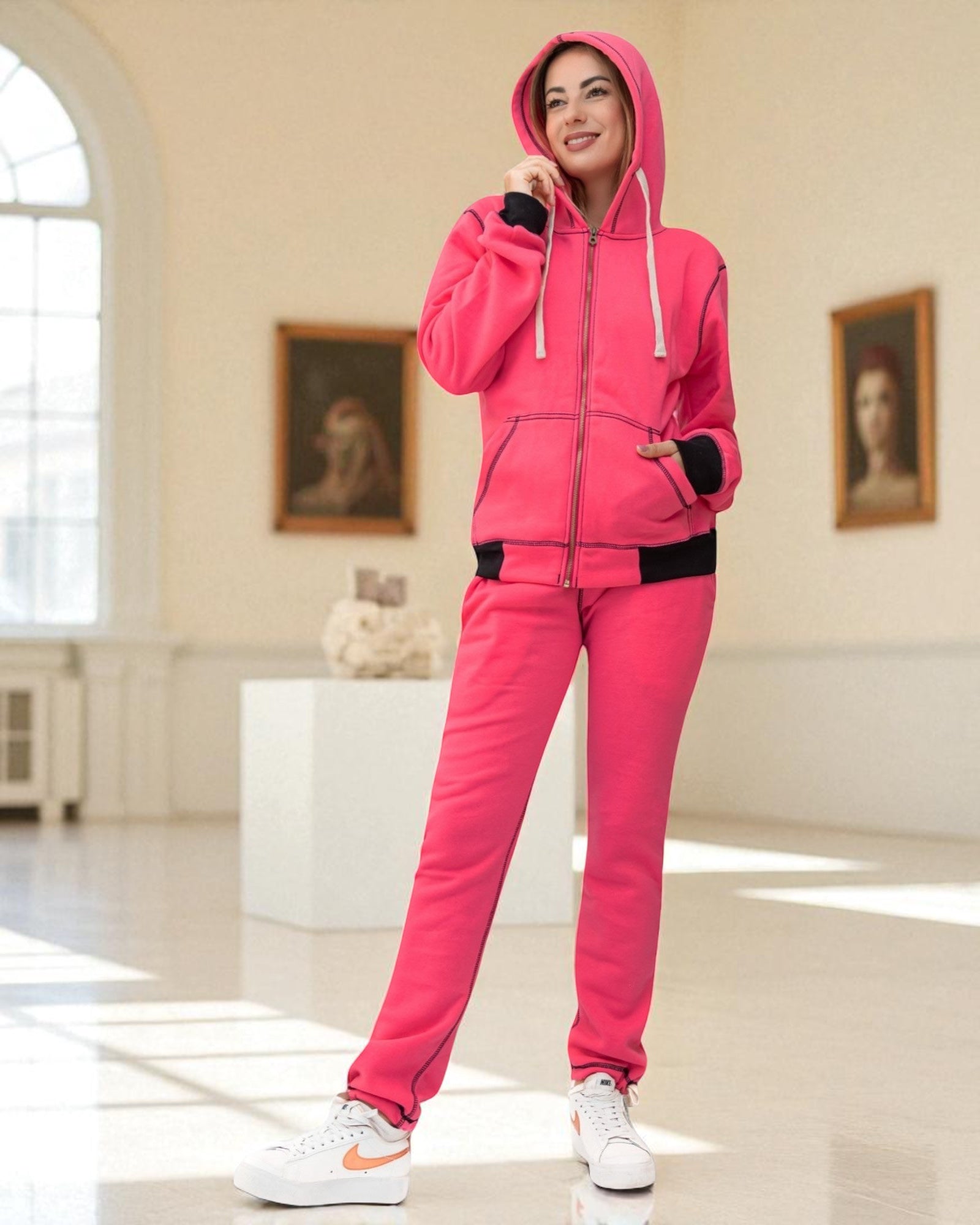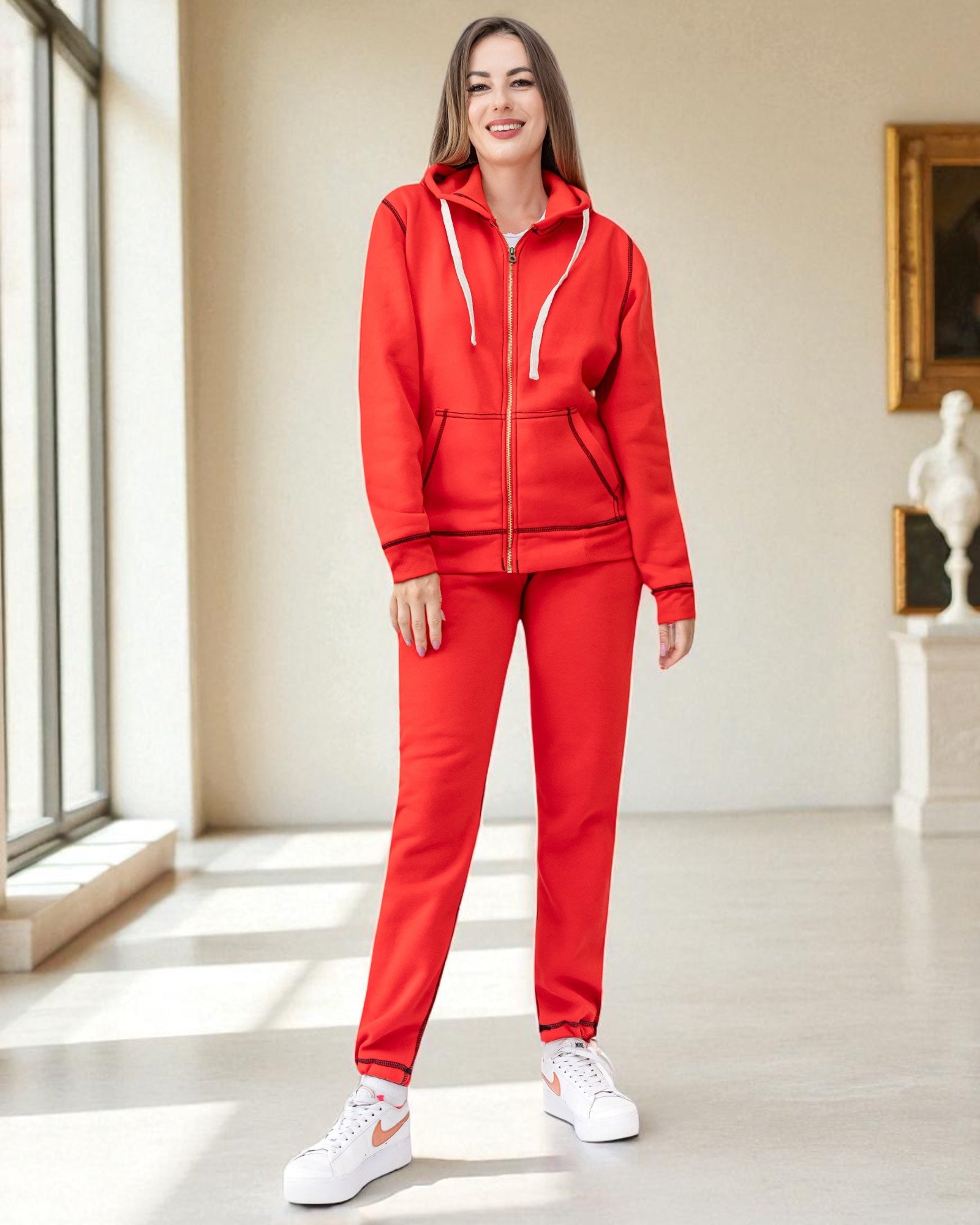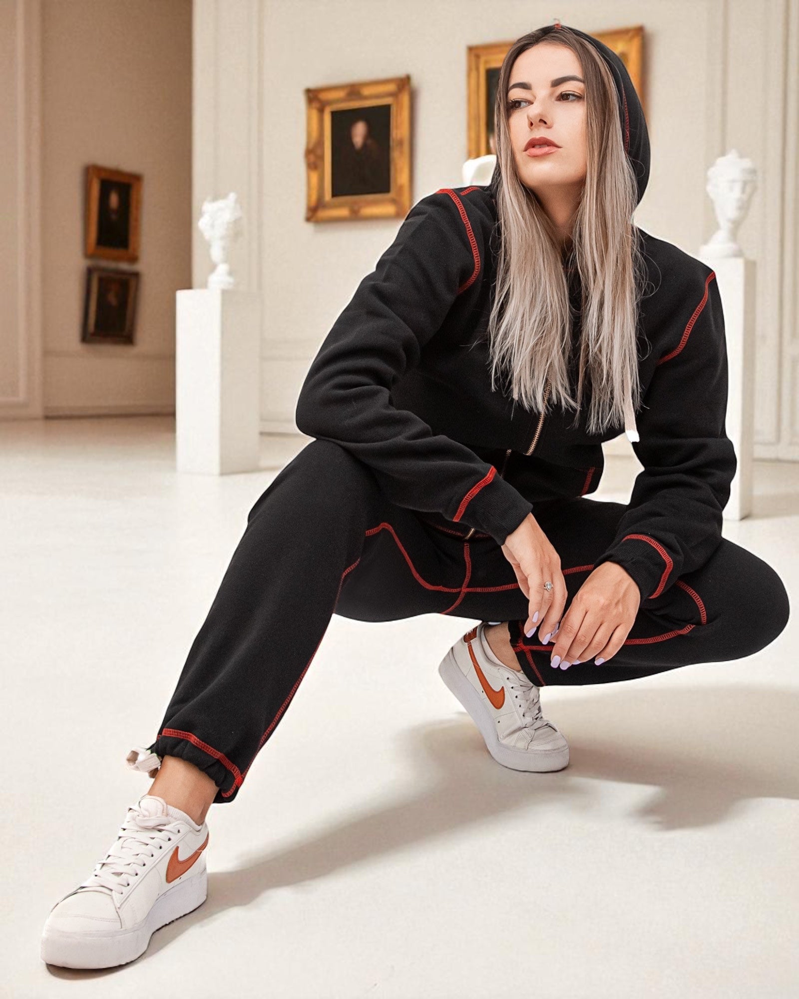 - Zip-up hoodie and joggers with pockets and adjustable ankle ties.