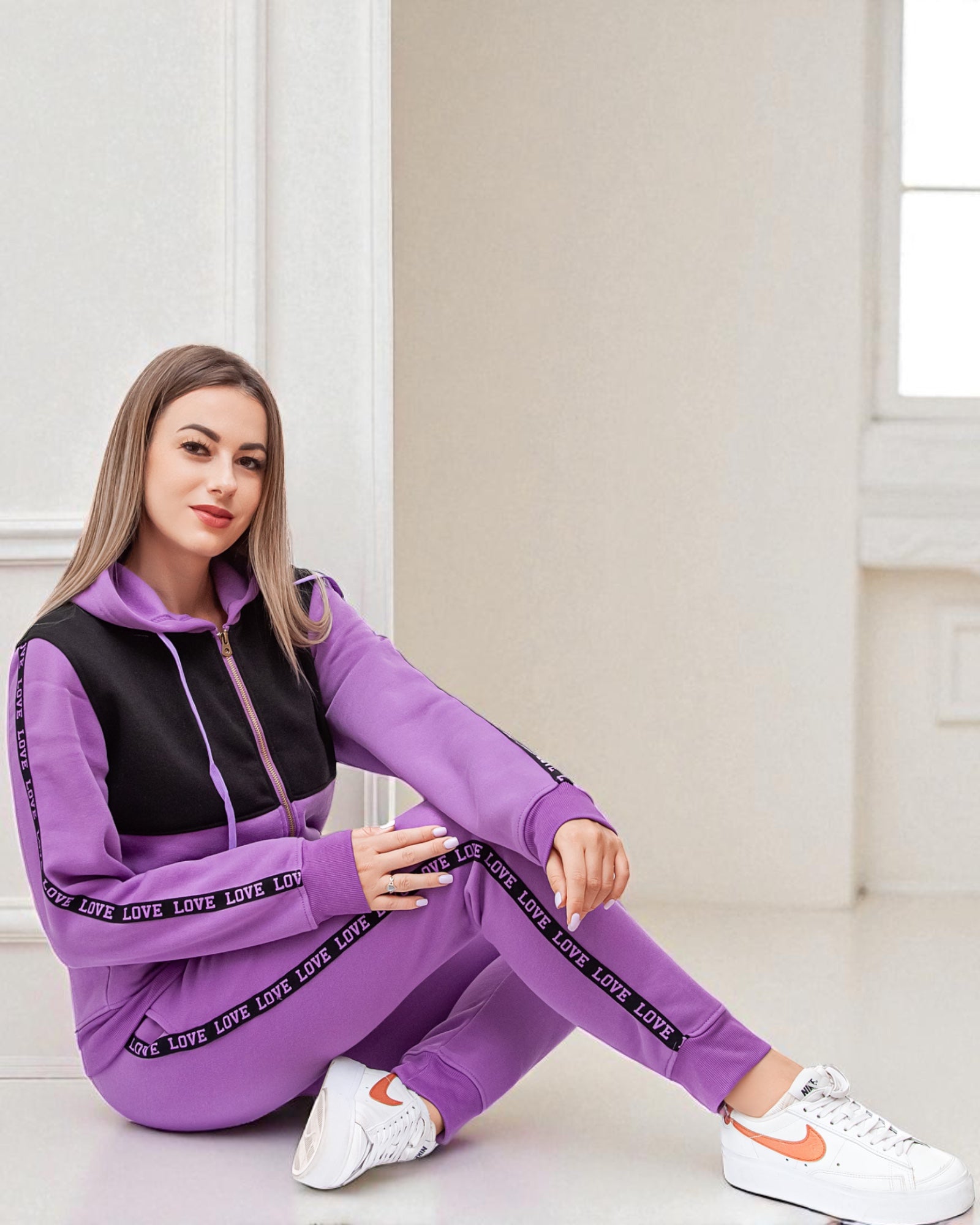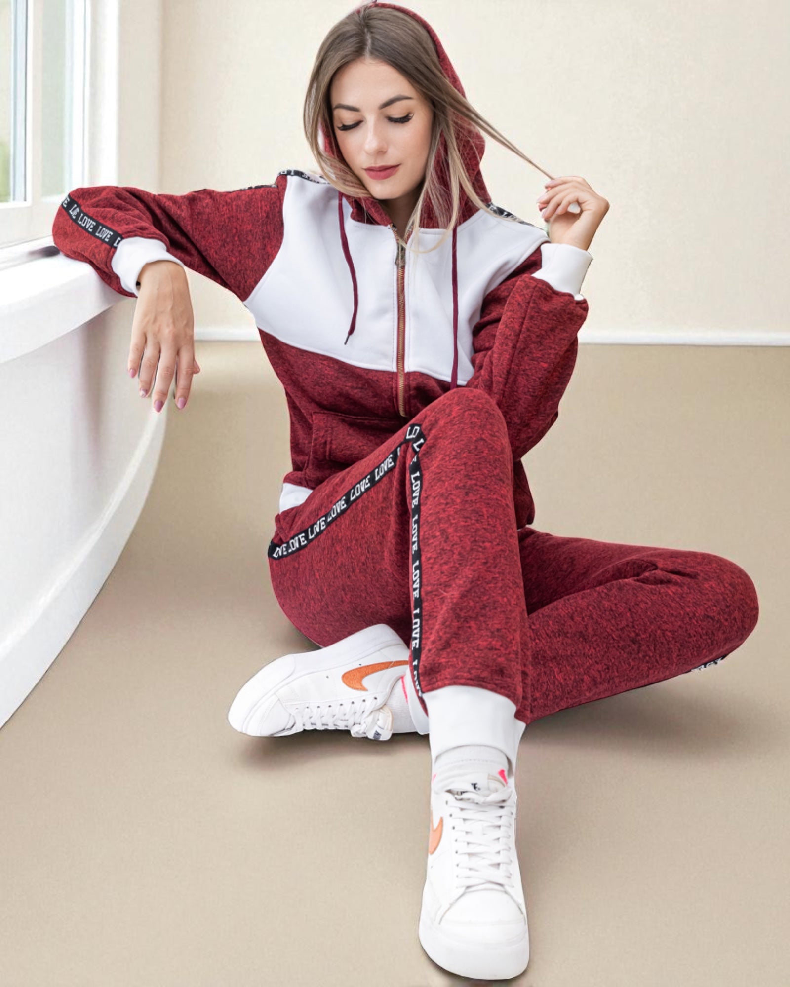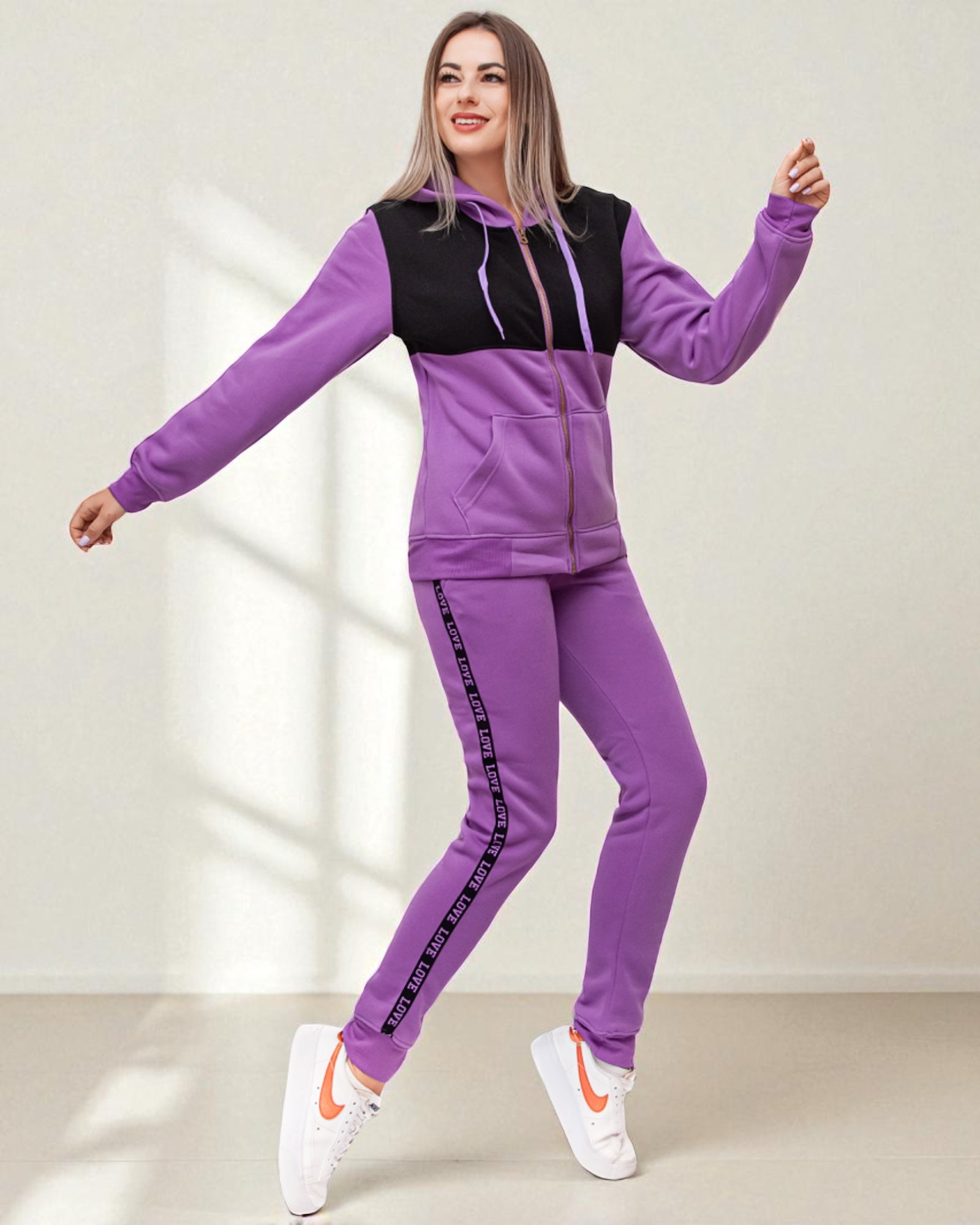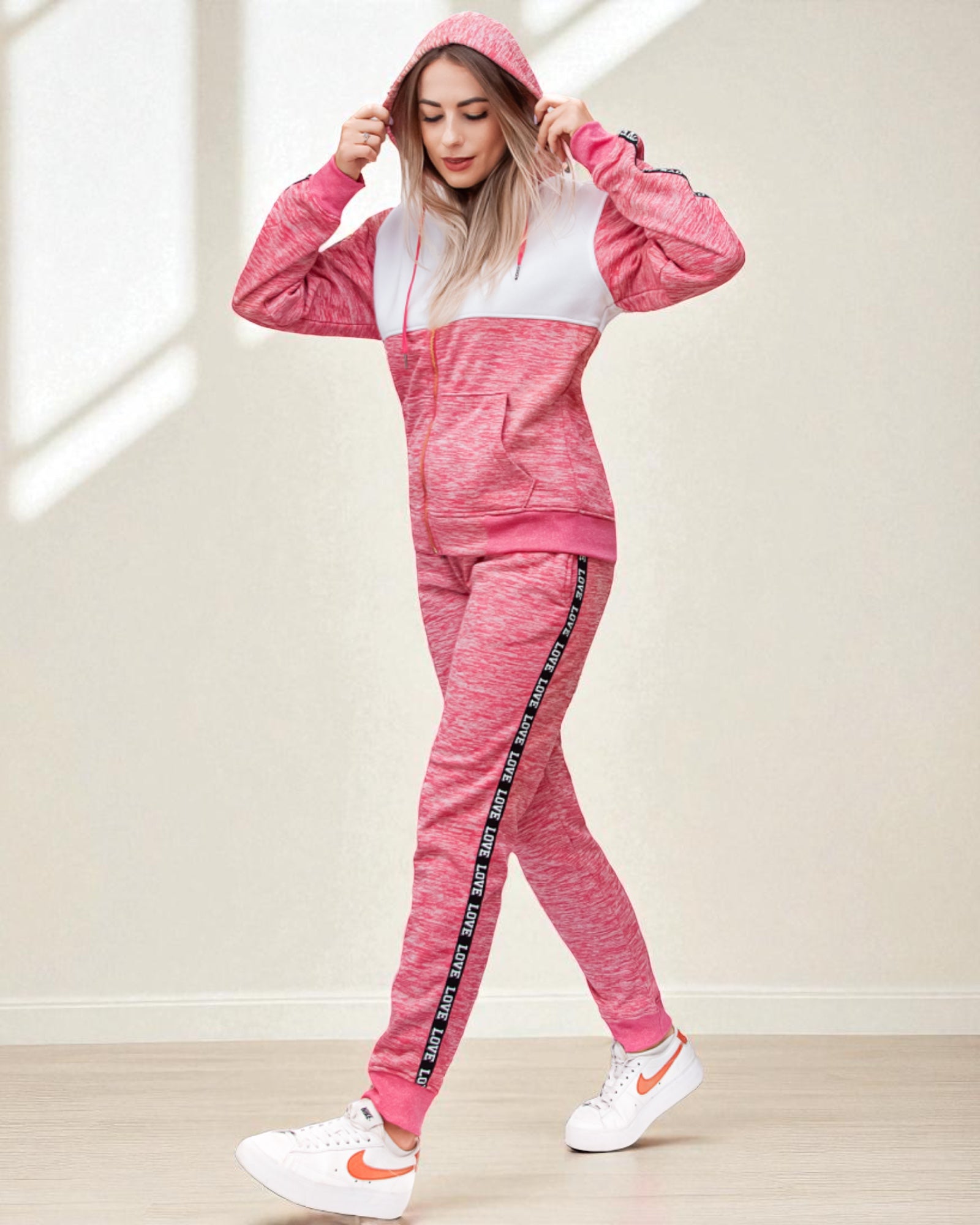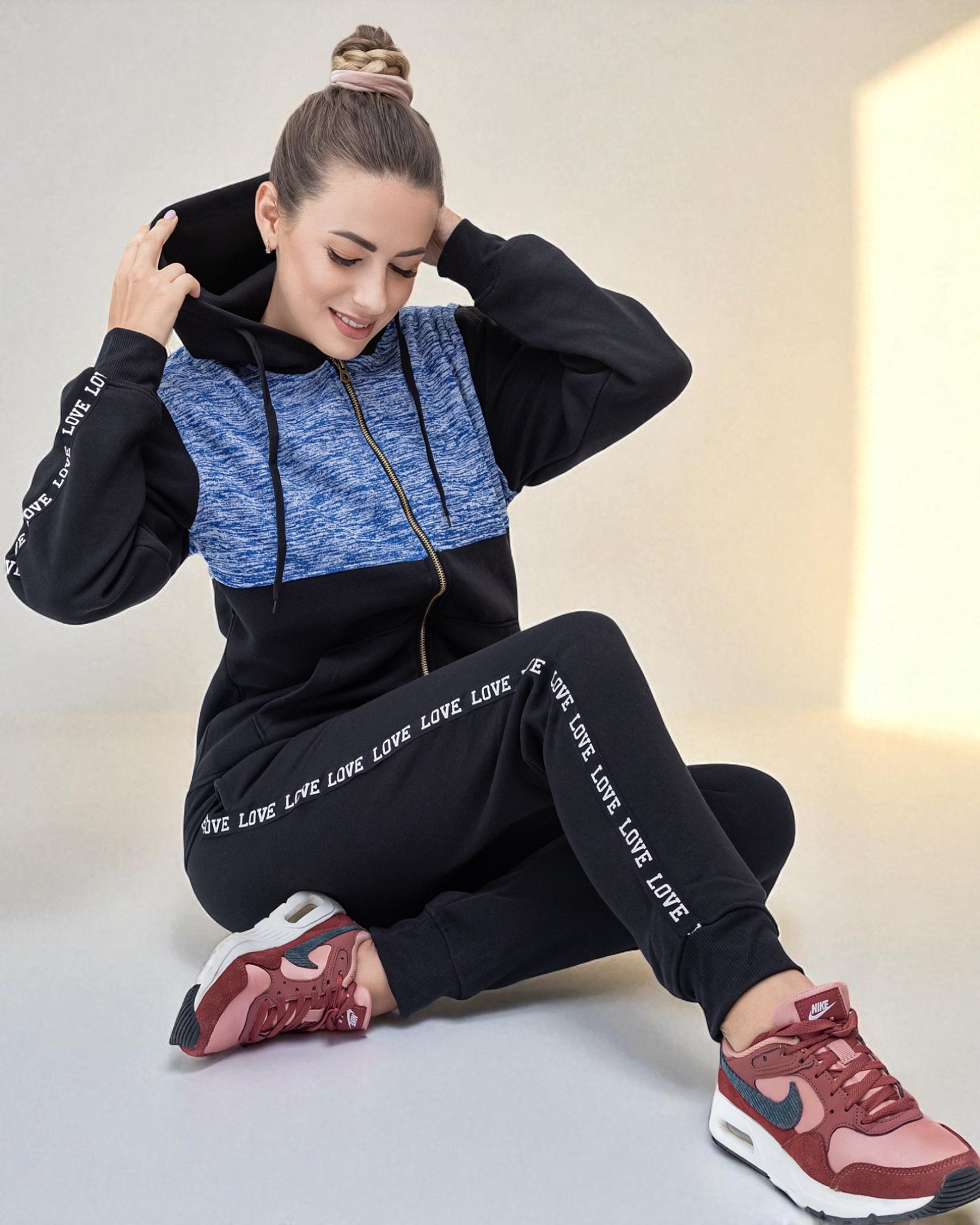 - Cozy up in style with this soft hoodie and jogger set—perfect for chilly days.