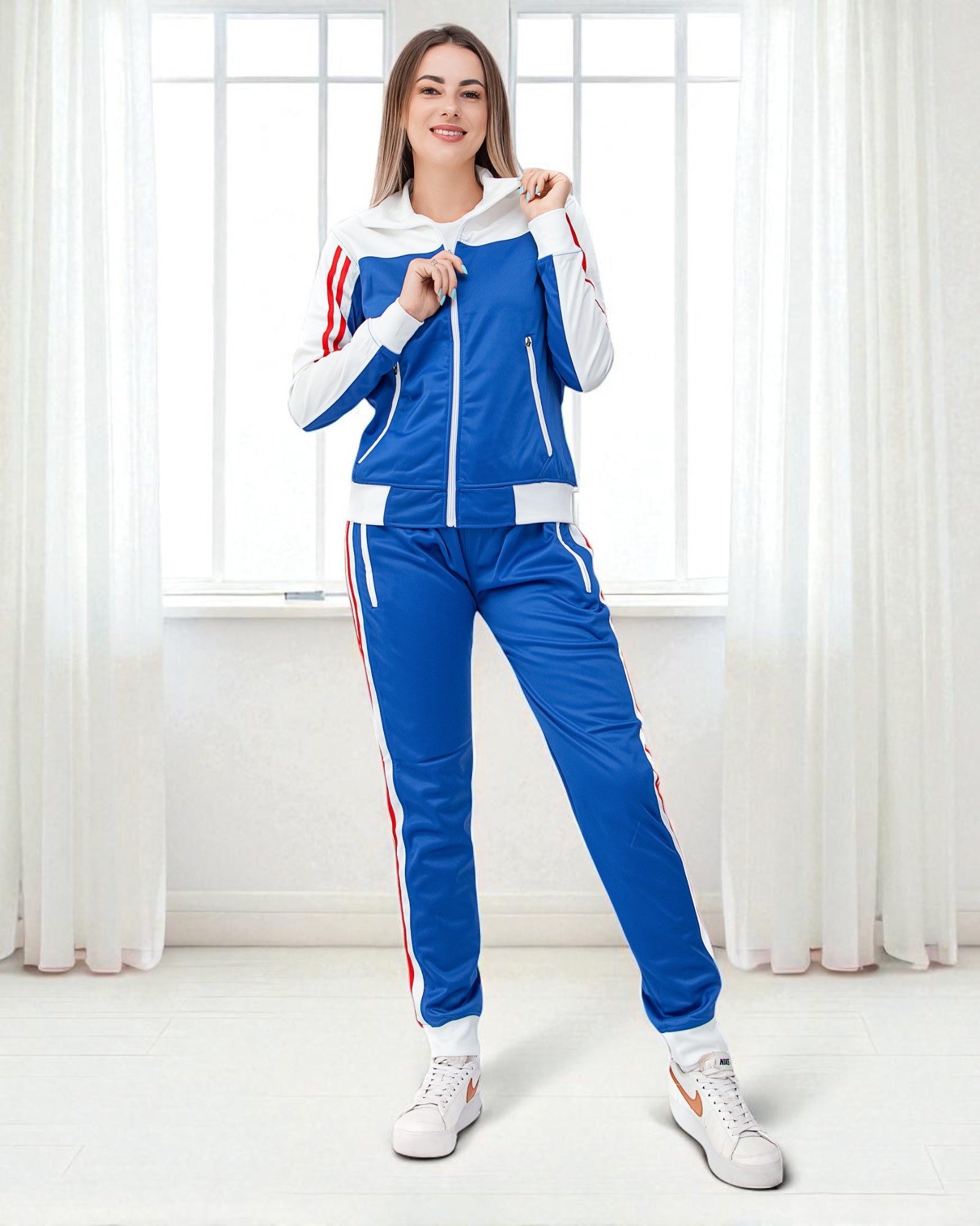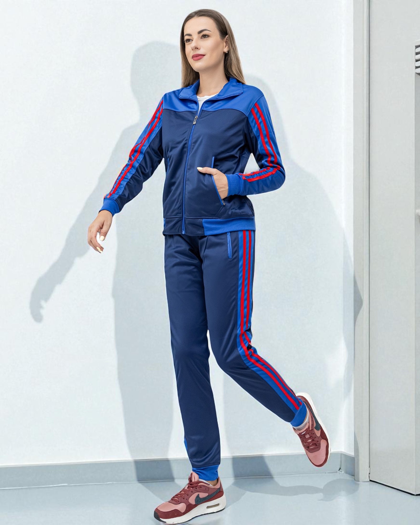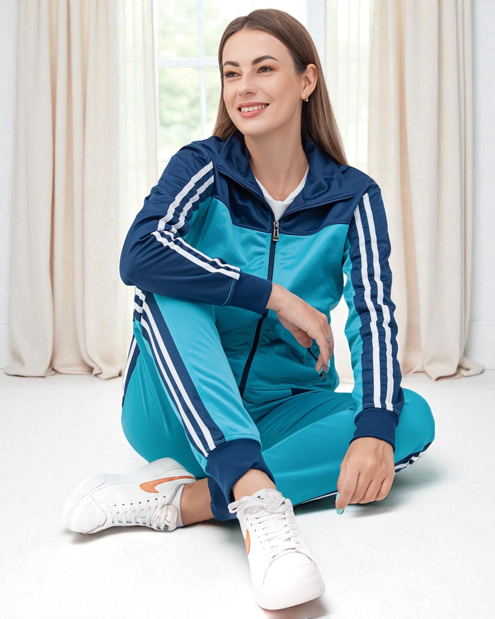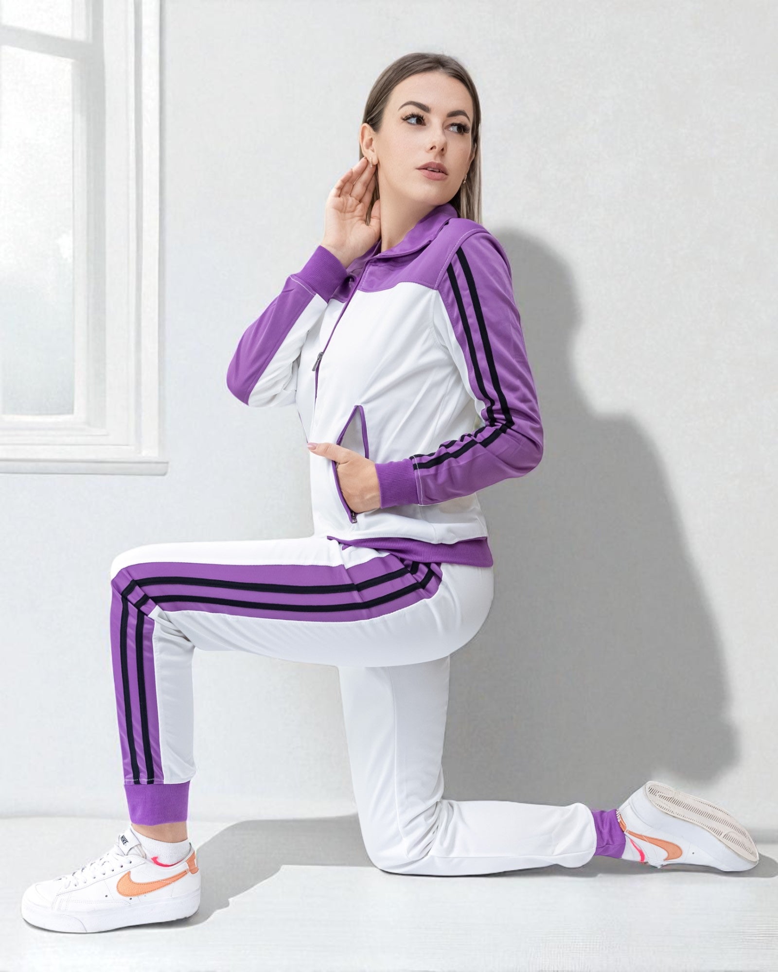 This women 2-piece matching tracksuit set is a great fit for the spring and fall weather in a stylish two color combination outfit with stripes. 2-piece matching co ord sets are a part of everyday life from the GYM the sports field and working from home to daily casual activities. This women Tracksuit features a seamlessly comfortable track material suitable for any age. The jogger style tracksuit track pants are in line with current women co Ord fashion trends in loungewear sets.