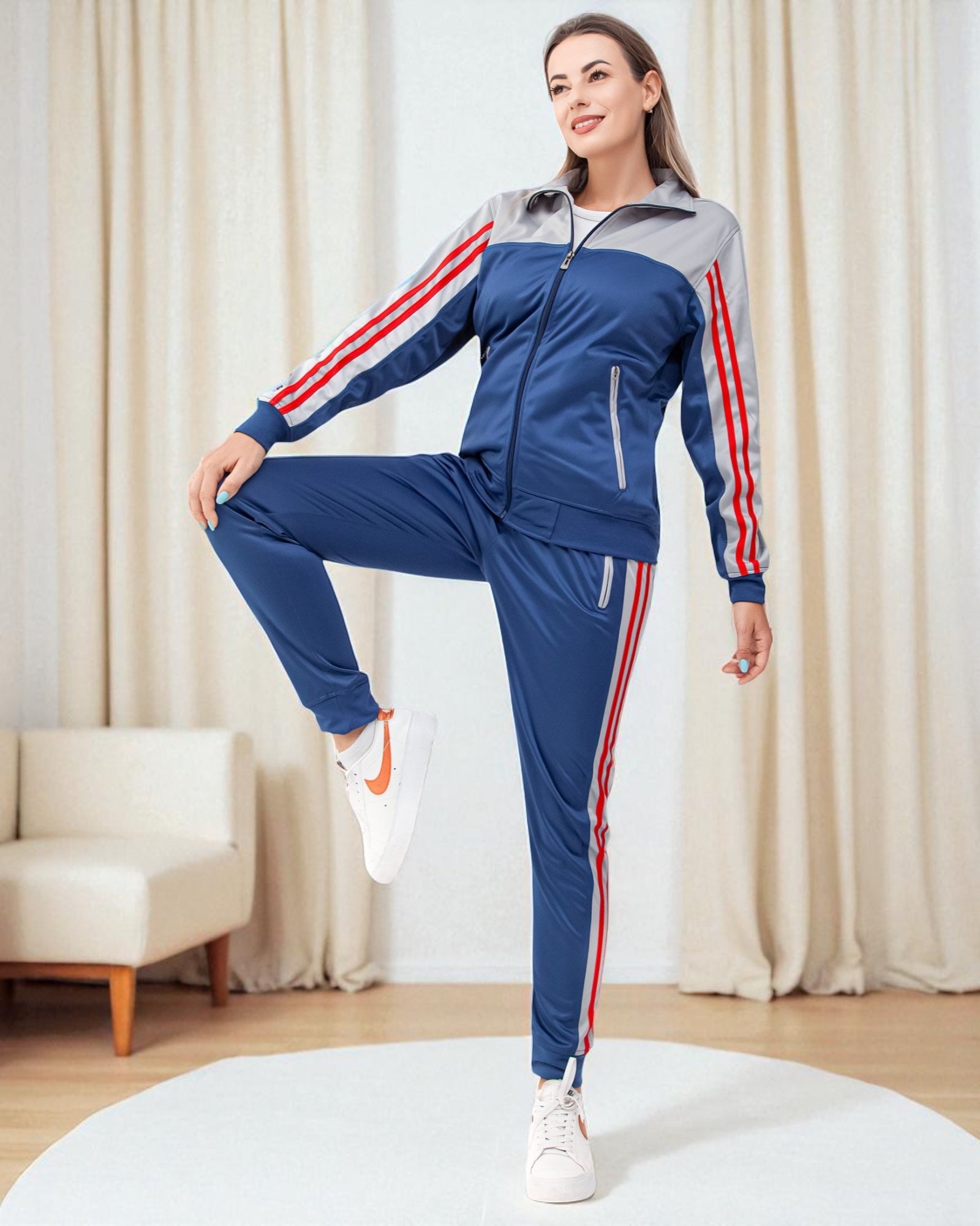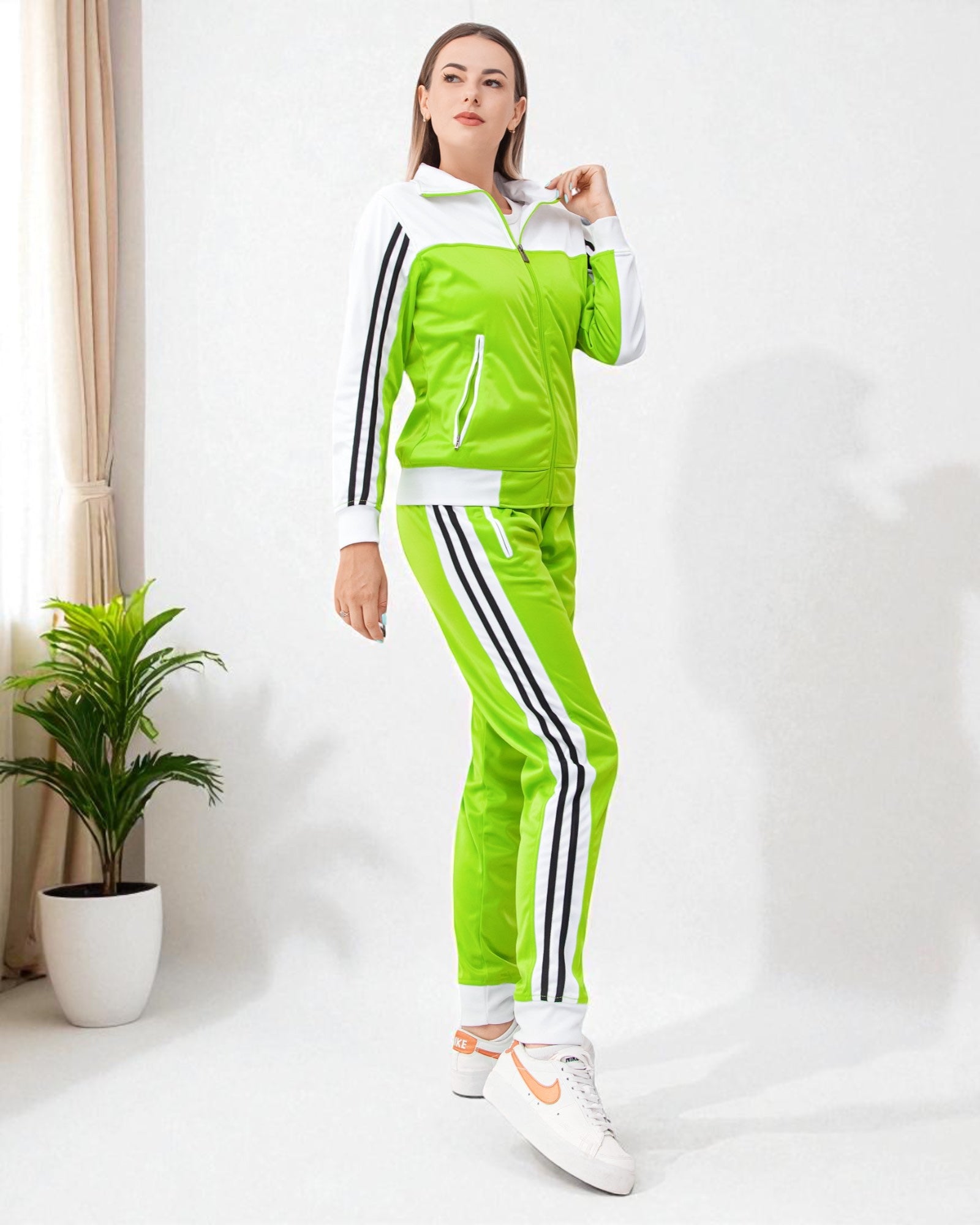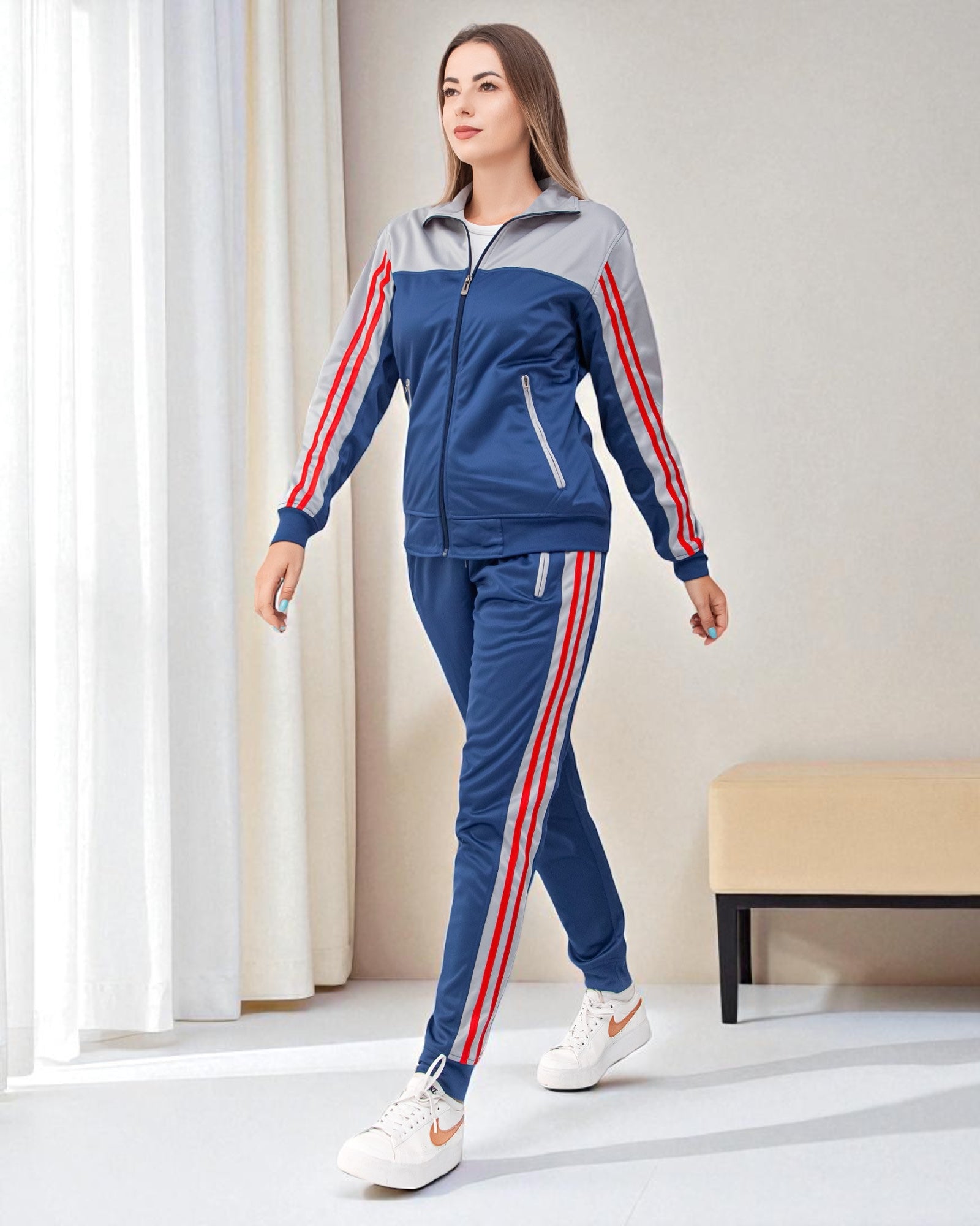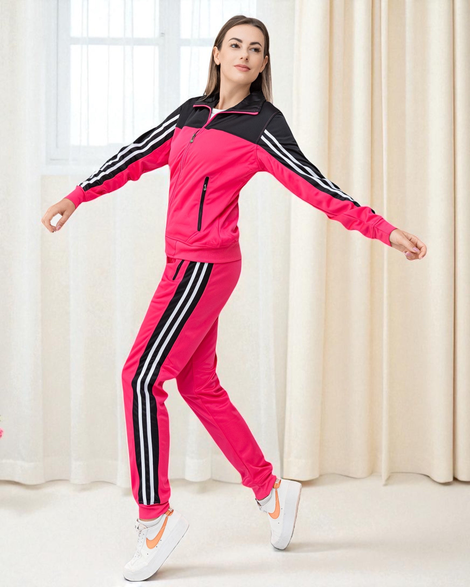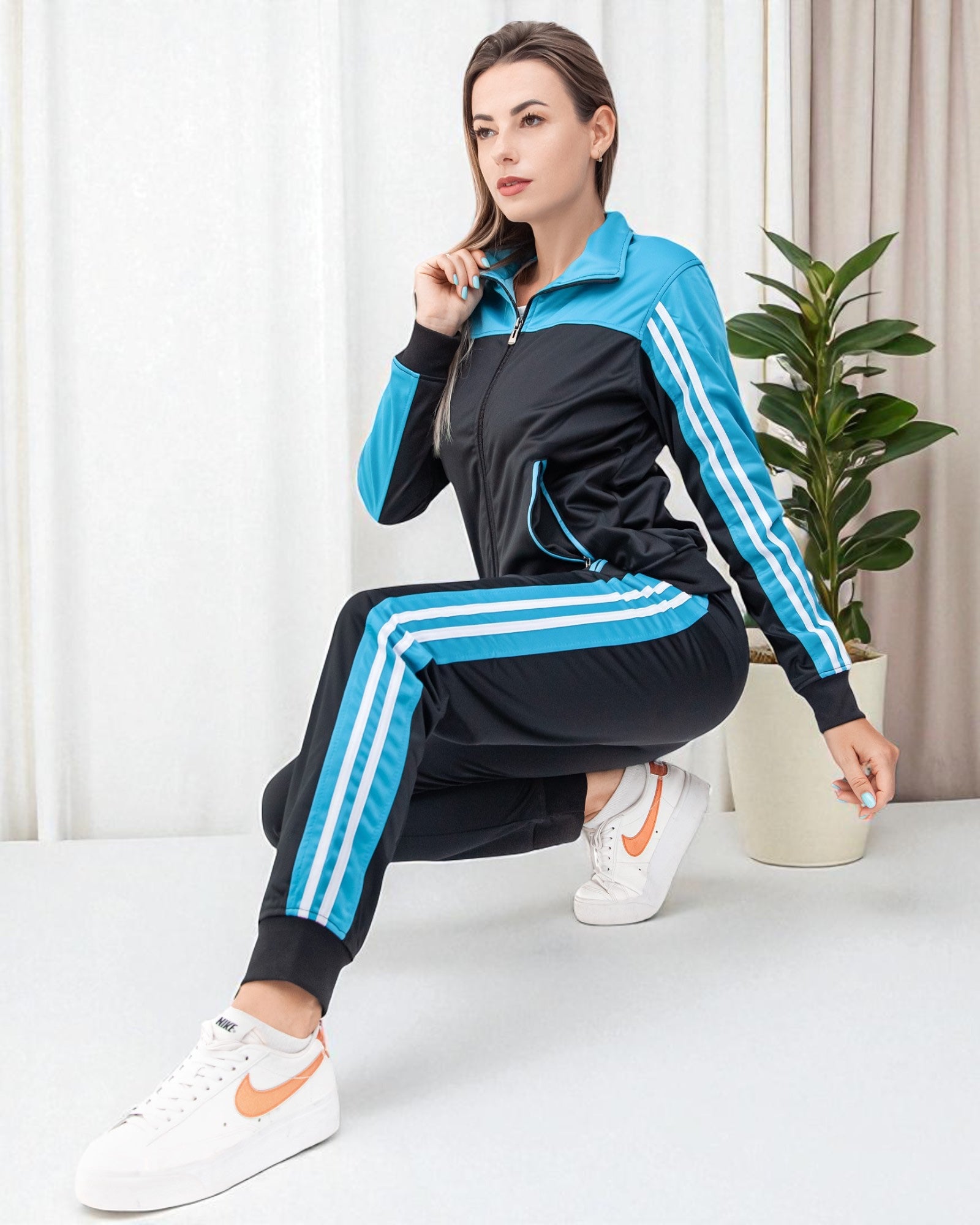 This women 2-piece matching tracksuit set is a great fit for the spring and fall weather in a stylish two color combination outfit with stripes. 2-piece matching co ord sets are a part of everyday life from the GYM the sports field and working from home to daily casual activities. This women Tracksuit features a seamlessly comfortable track material suitable for any age. The jogger style tracksuit track pants are in line with current women co Ord fashion trends in loungewear sets.