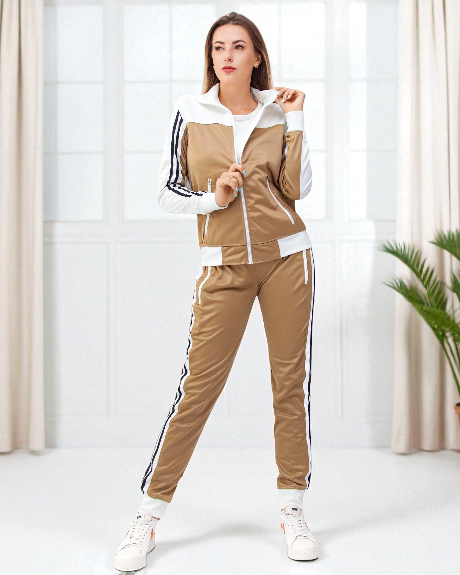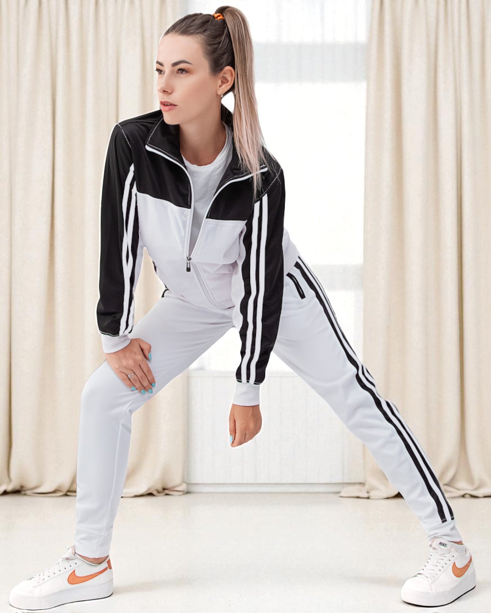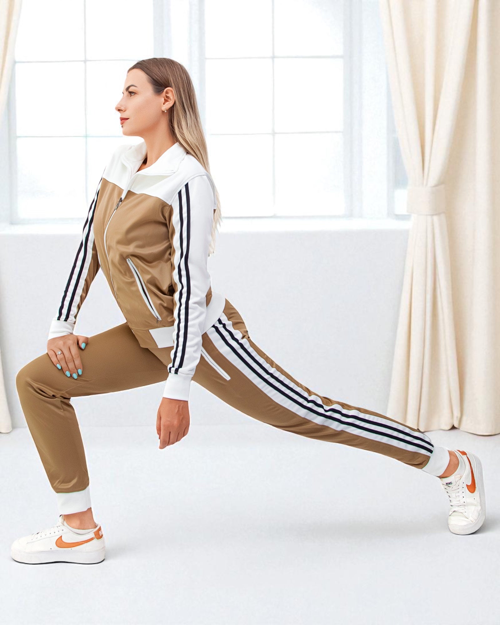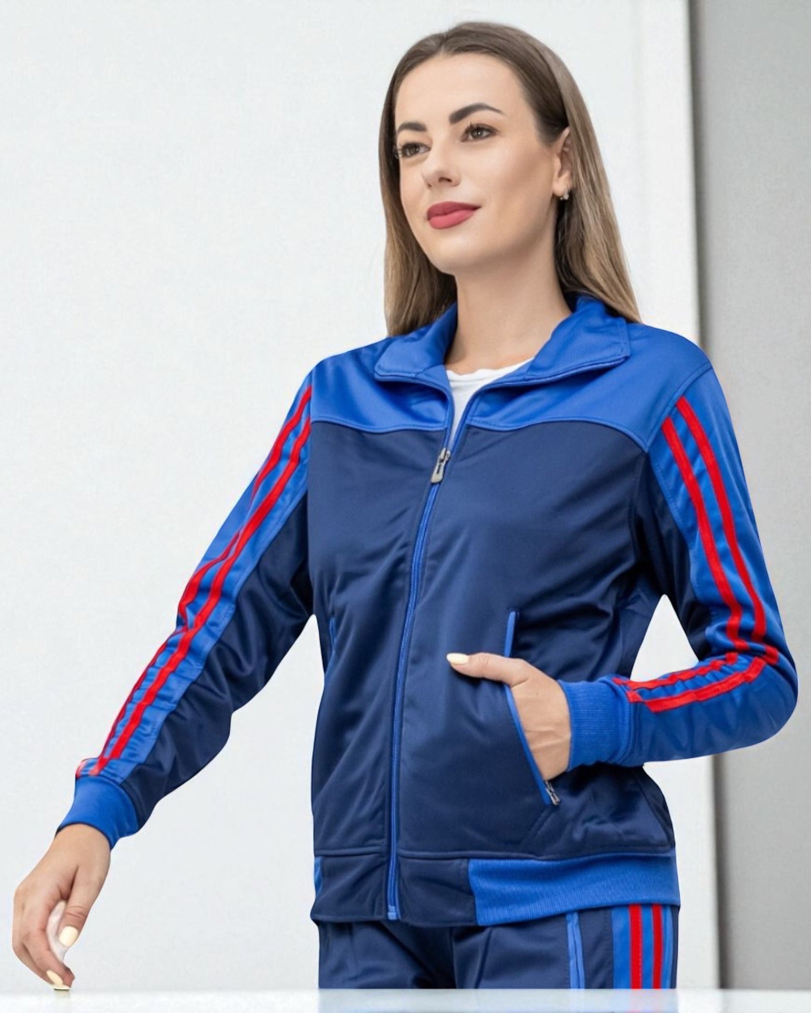 This women 2-piece matching tracksuit set is a great fit for the spring and fall weather in a stylish two color combination outfit with stripes. 2-piece matching co ord sets are a part of everyday life from the GYM the sports field and working from home to daily casual activities. This women Tracksuit features a seamlessly comfortable track material suitable for any age. The jogger style tracksuit track pants are in line with current women co Ord fashion trends in loungewear sets.