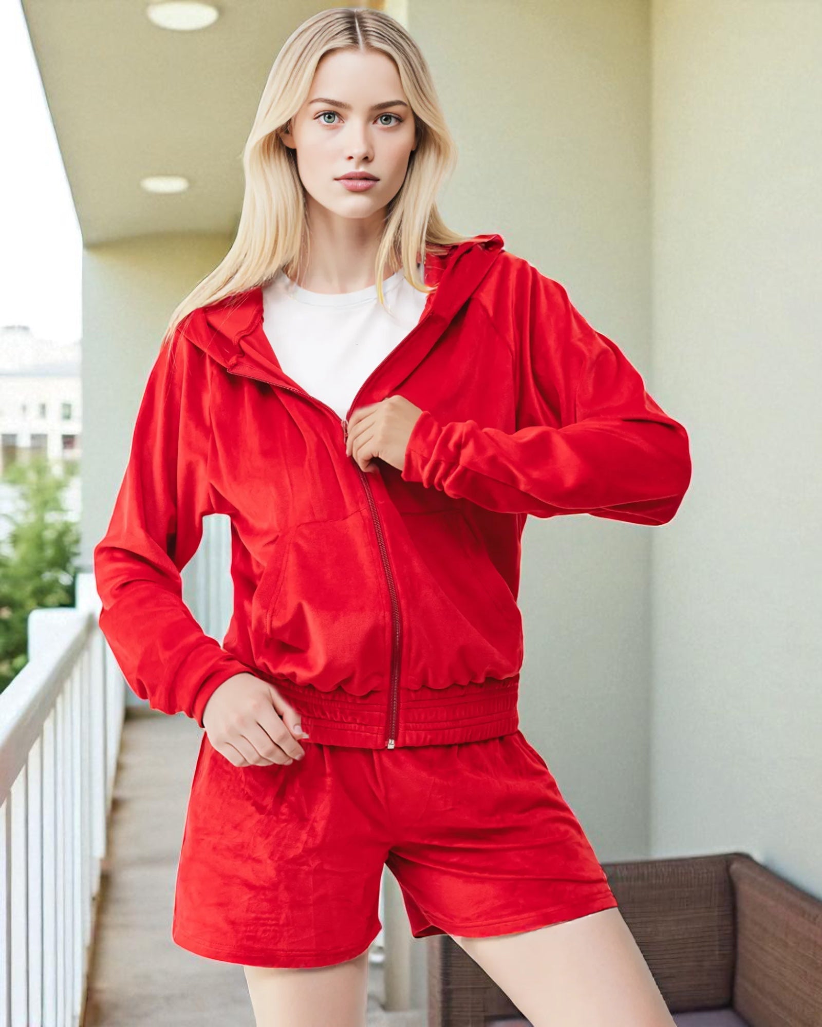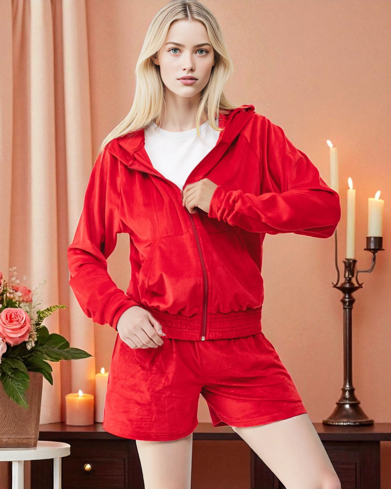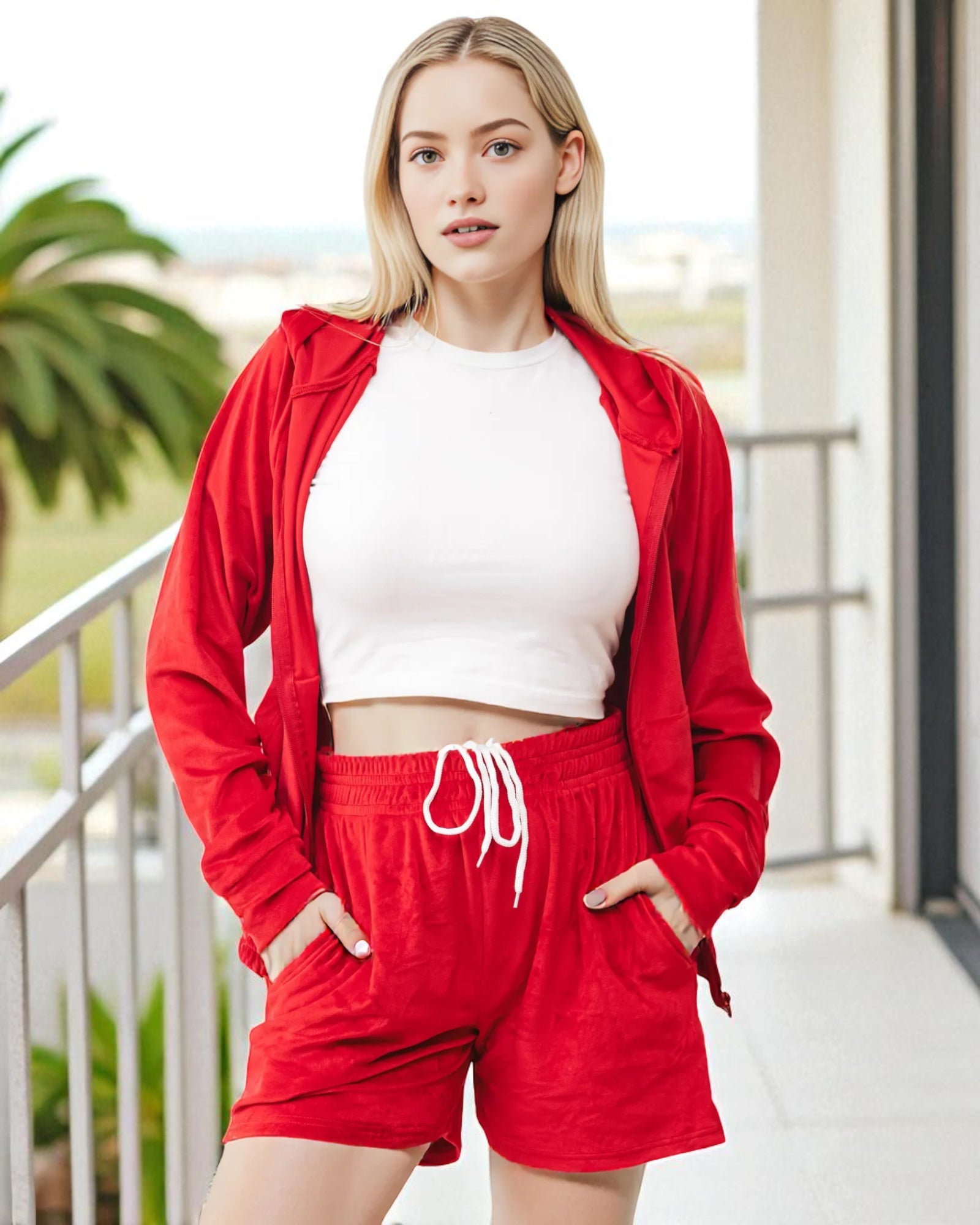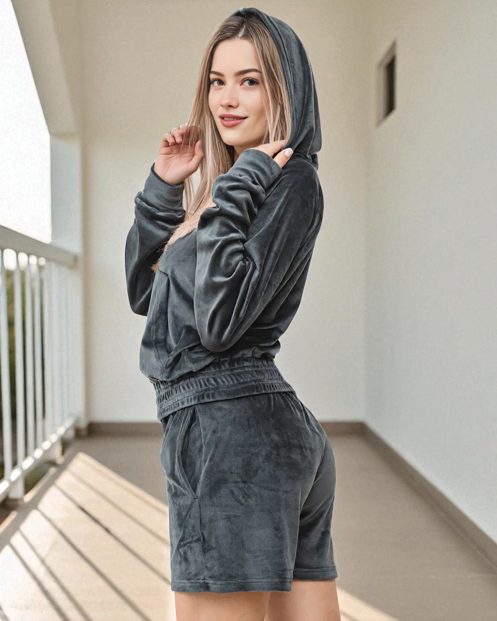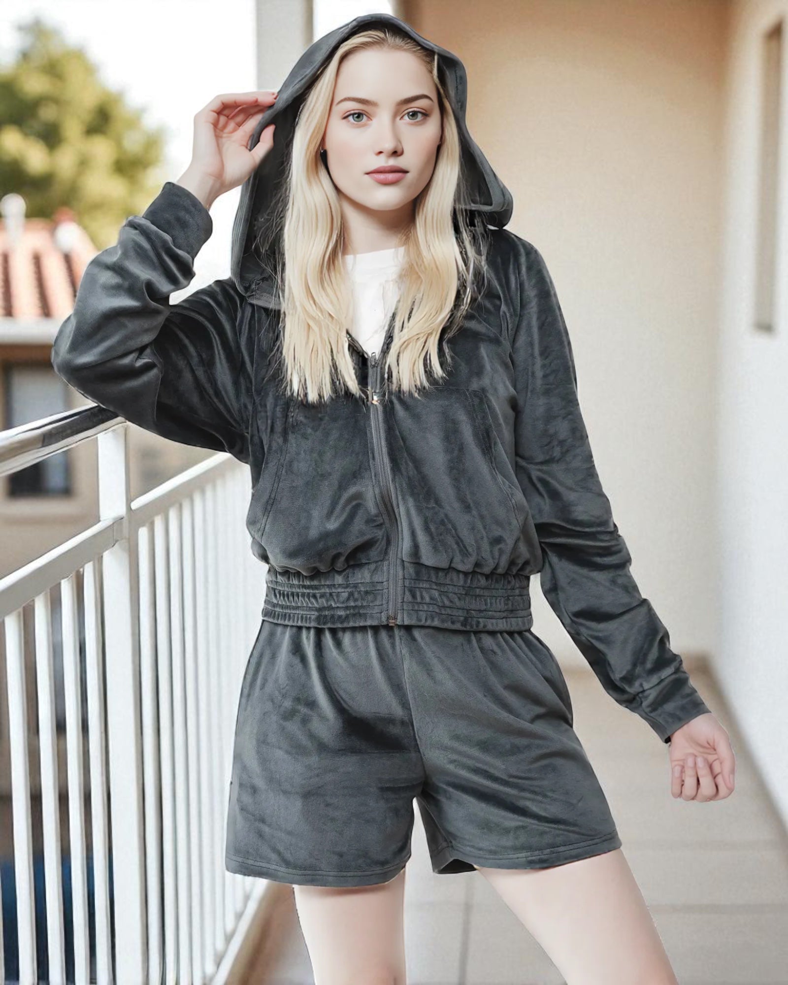- Trendy cropped zip-up hoodie with matching shorts and handy pockets.